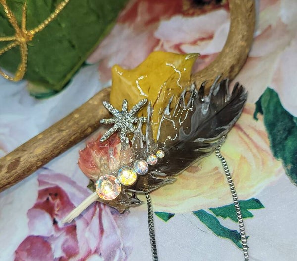 Une fleur de trèfle rouge et une petite feuille jaune viennent enrichir la composition, accompagnées d’un apprêt étoilé orné de strass.