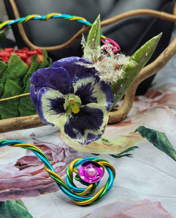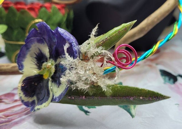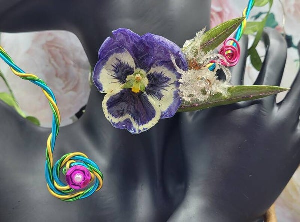 Une belle pensée violette , une fleur filament et feuilles de lauriers sont assemblées