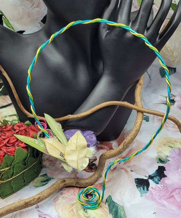 Collier ras de cou composé de 3 fils métalliques : 1 bleu , 1 vert et 1 or qui sont torsadés ensemble .