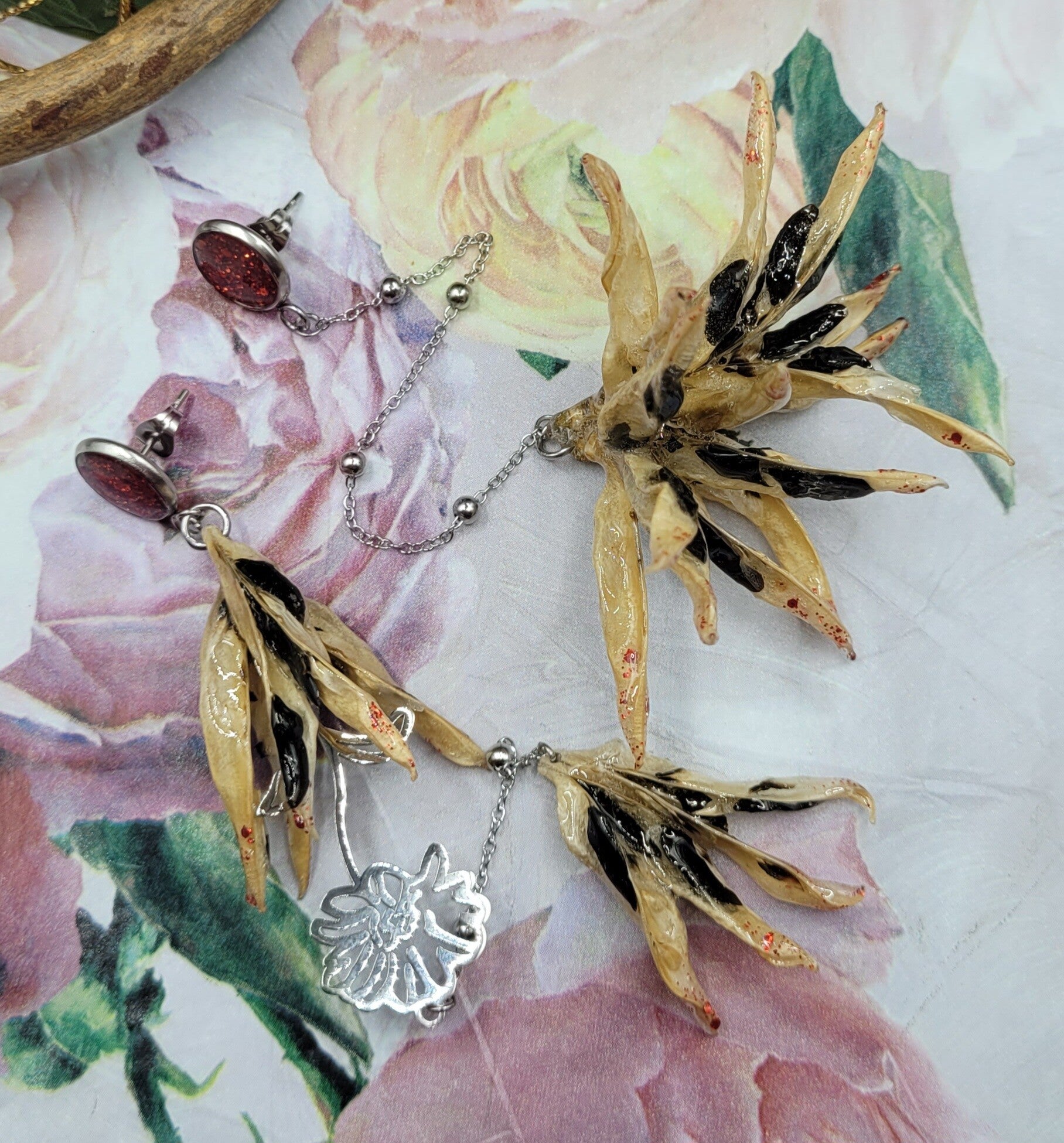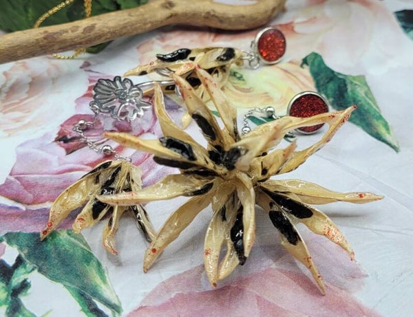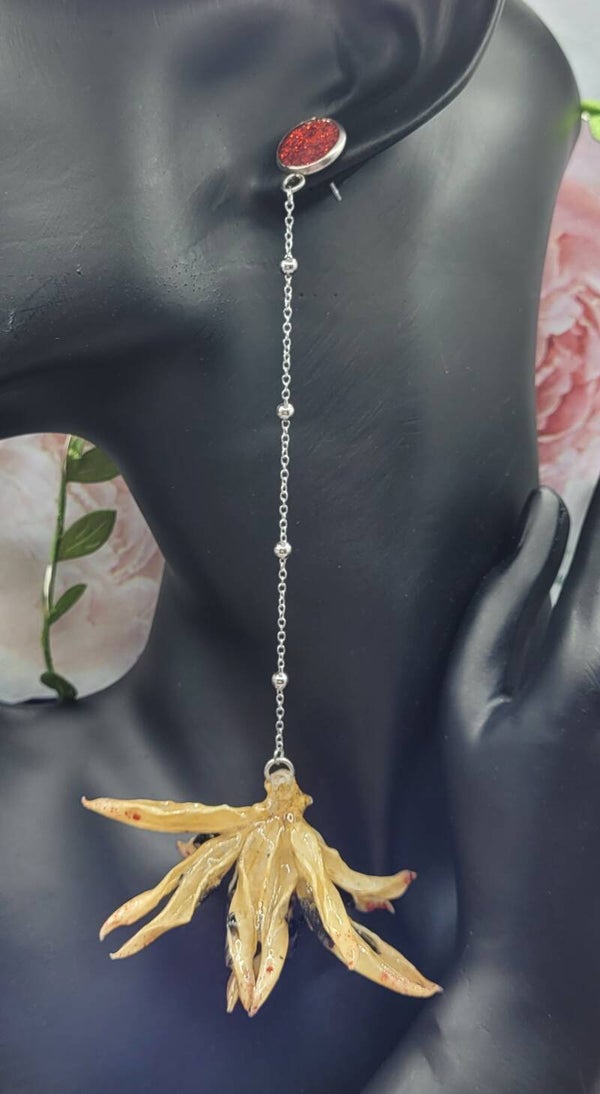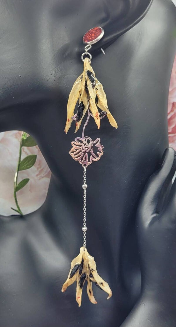 Boucles d'oreilles pendantes dépareillées composées de fleurs d'agapanthes beige