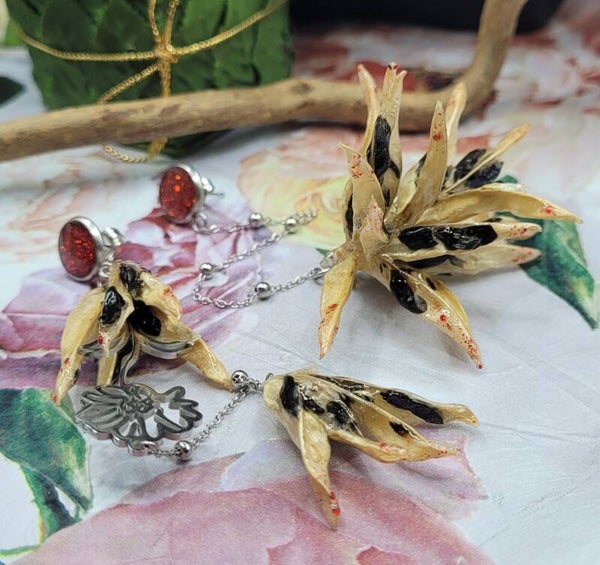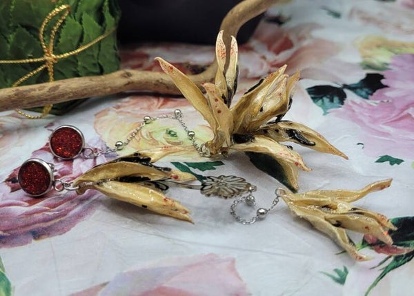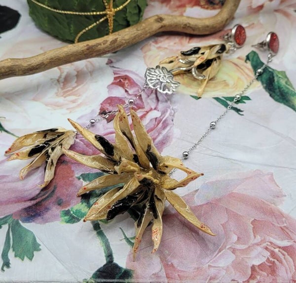 Une boucle contient de l'agapanthe , ainsi qu'un apprêt argent représentant une fleur , et une chaînette maille boule