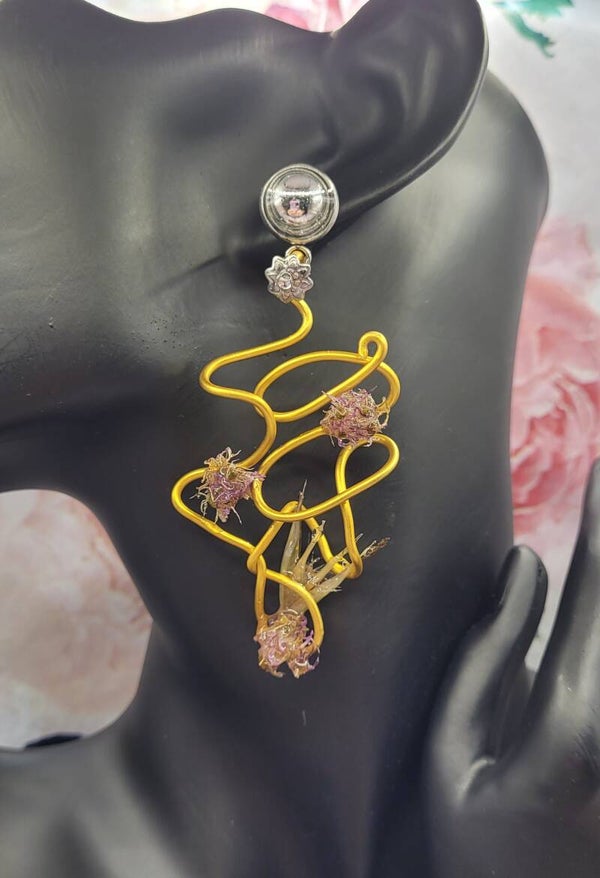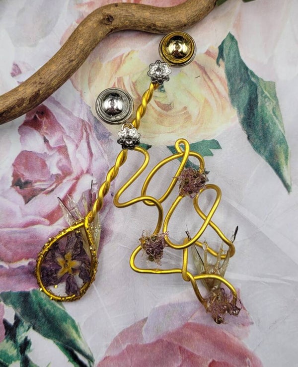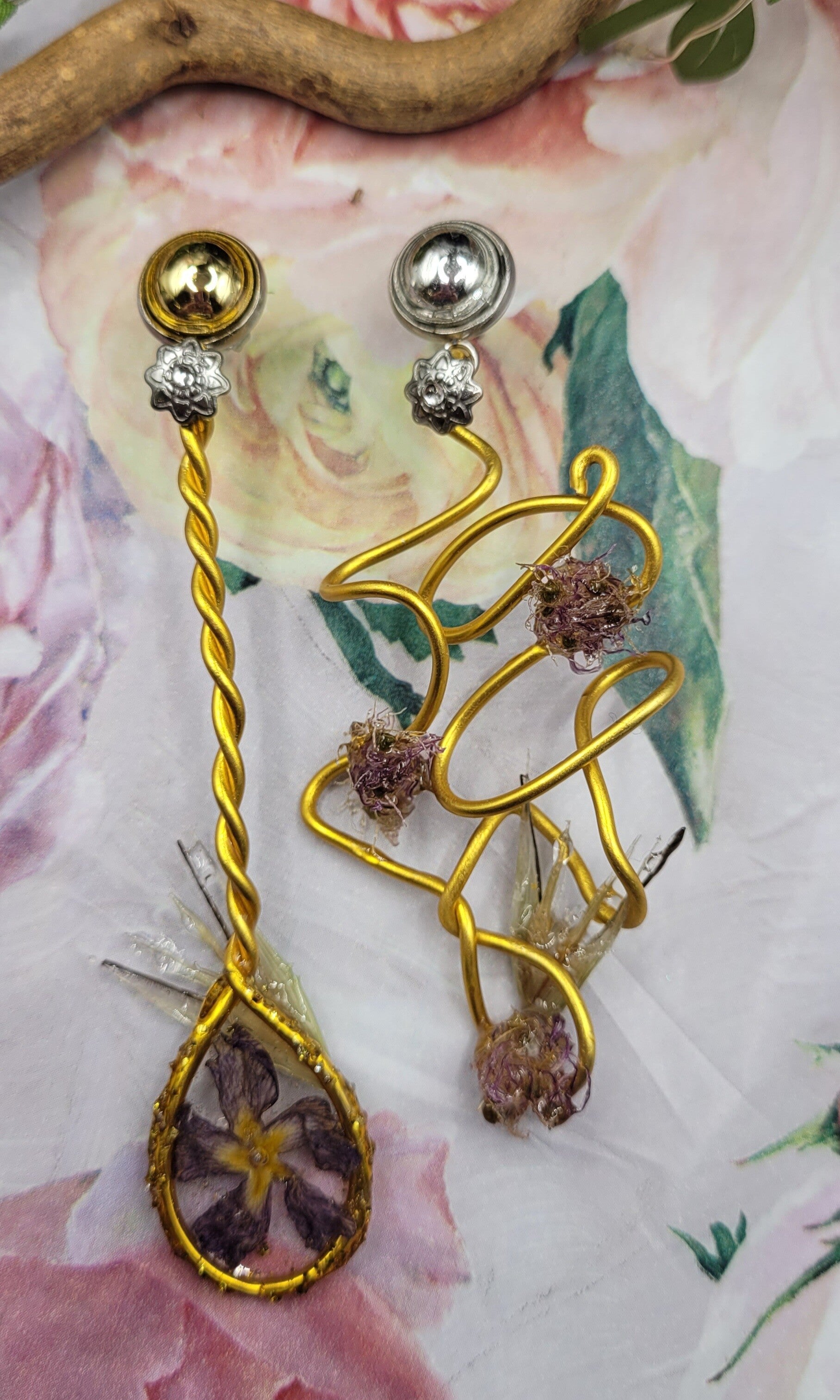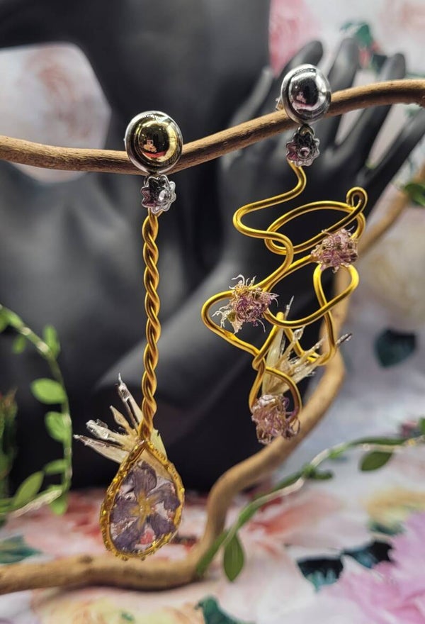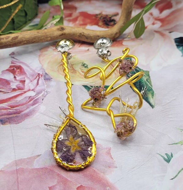 Les fleurs sont scellées dans la résine et monté sur fil méttallique doré et sur boucles d'oreilles en acier inoxydable