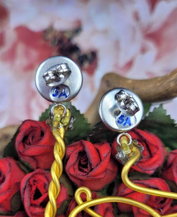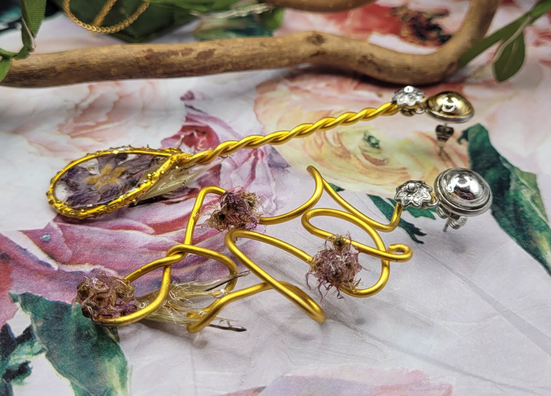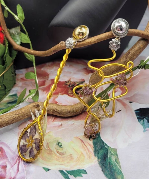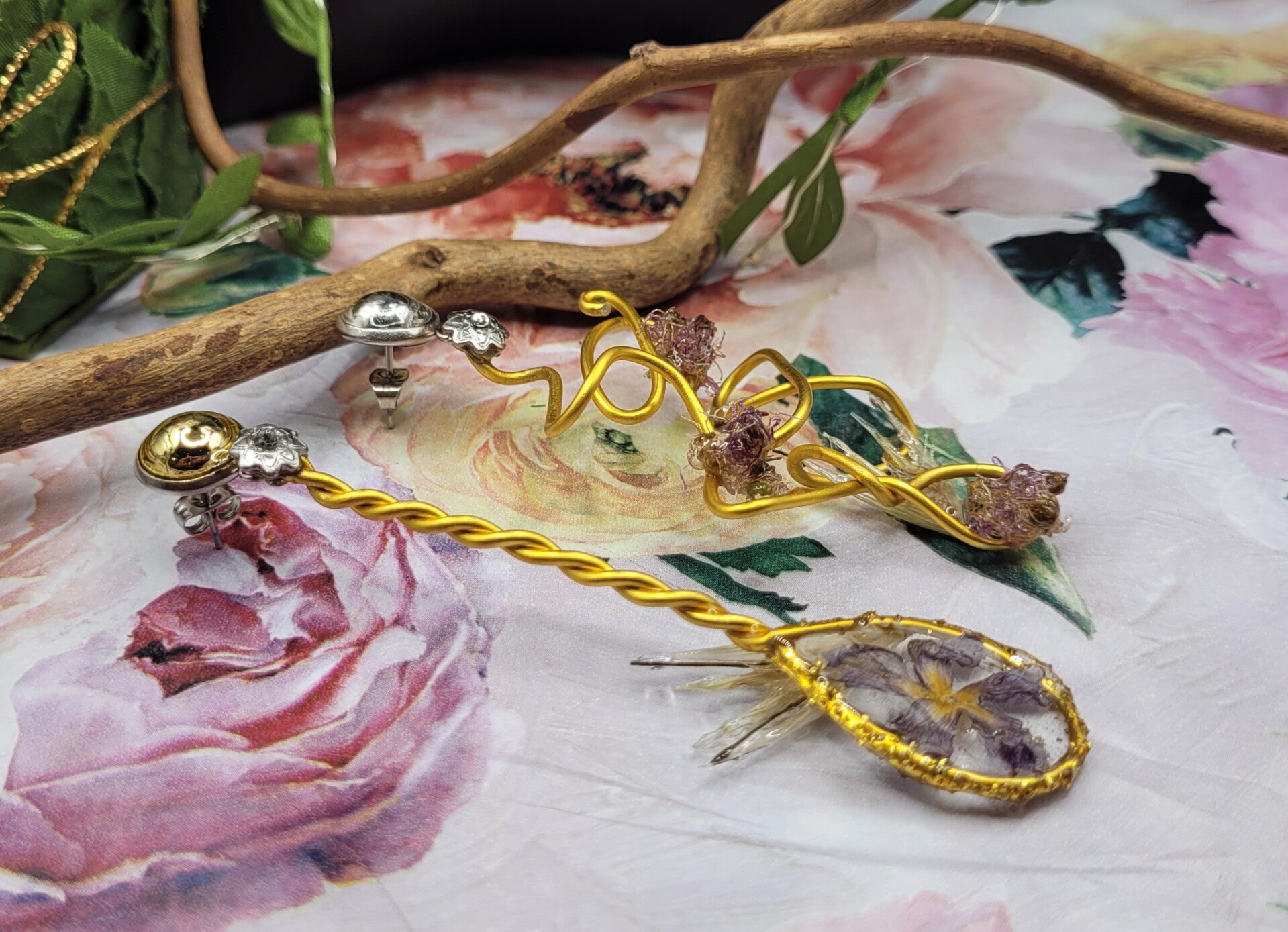 Les fleurs sont scellées dans la résine et monté sur fil méttallique doré et sur boucles d'oreilles en acier inoxydable