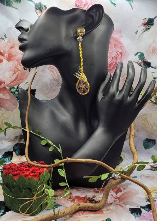 Une boucle d'oreille est une tige torsadée avec une forme de goutte d'eau sur le bas qui retient une fleur violette au centre