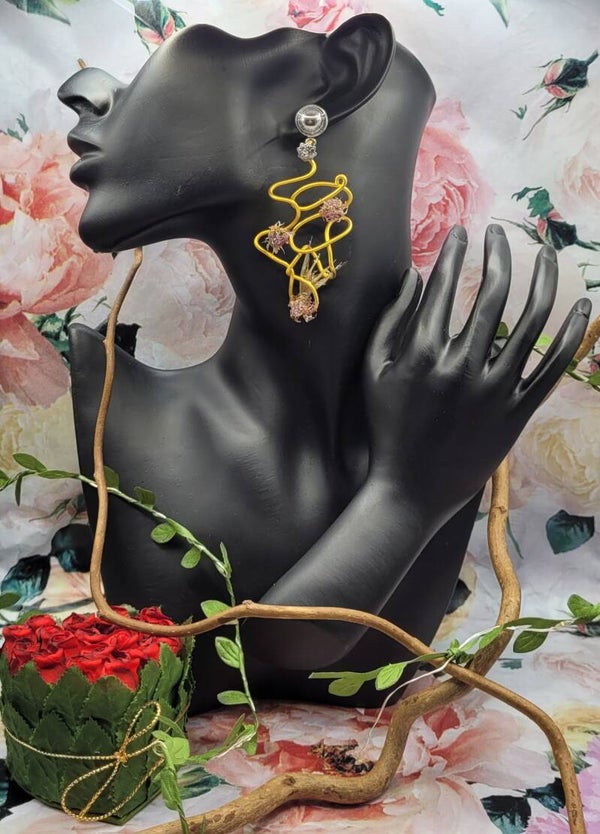 Boucles d'oreilles dépareillées , composées de fil métallique de couleur doré auquel 2 formes différentes ont été apporter :