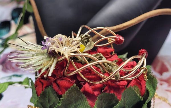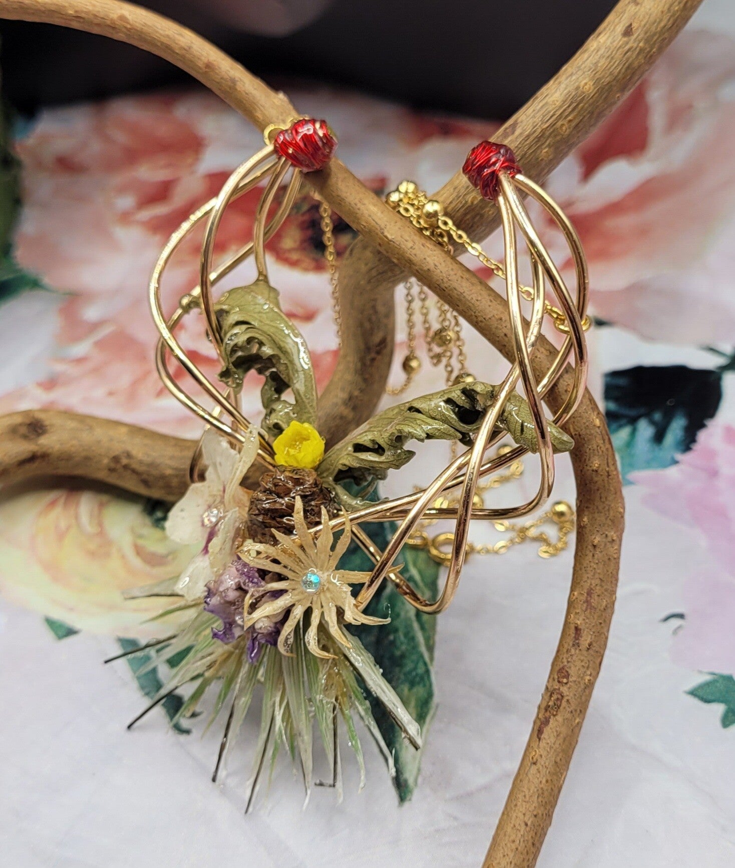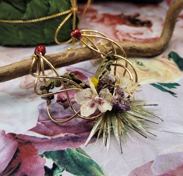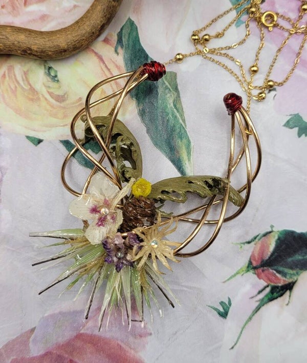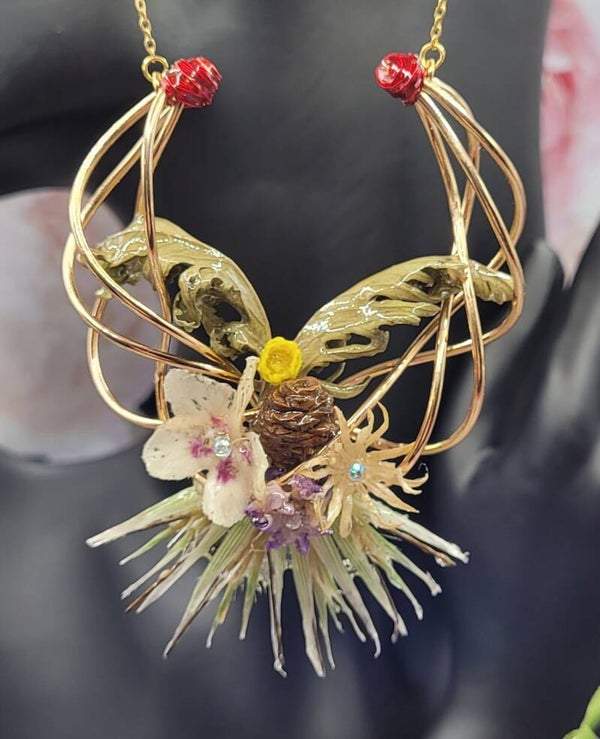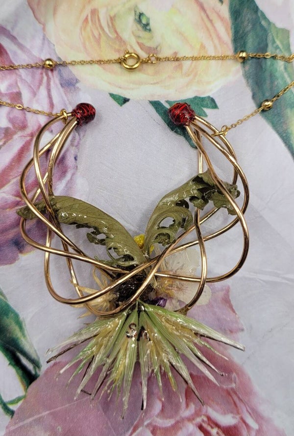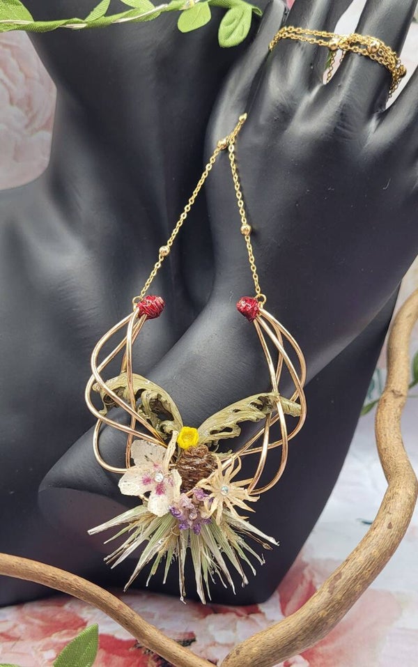 Collier composé d'une décoration de 4 fils métalliques dorés torsadés . Plusieurs éléments sont placés dessus : 1 mini pomme de pin , 1 fleur de marronnier , 1 mini fleur jaune , 1 violette , 2 feuilles vertes , 1 fleur blanche et des petits blés
