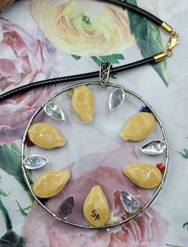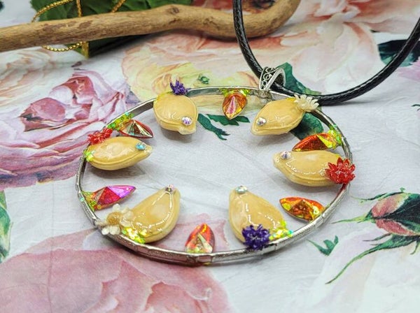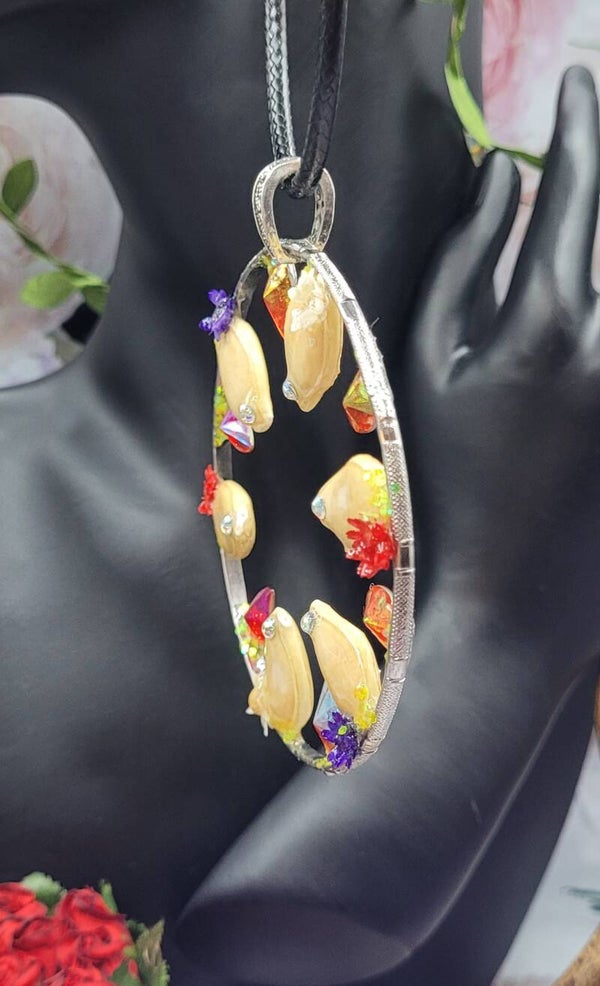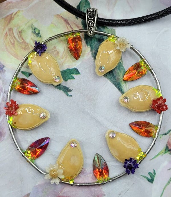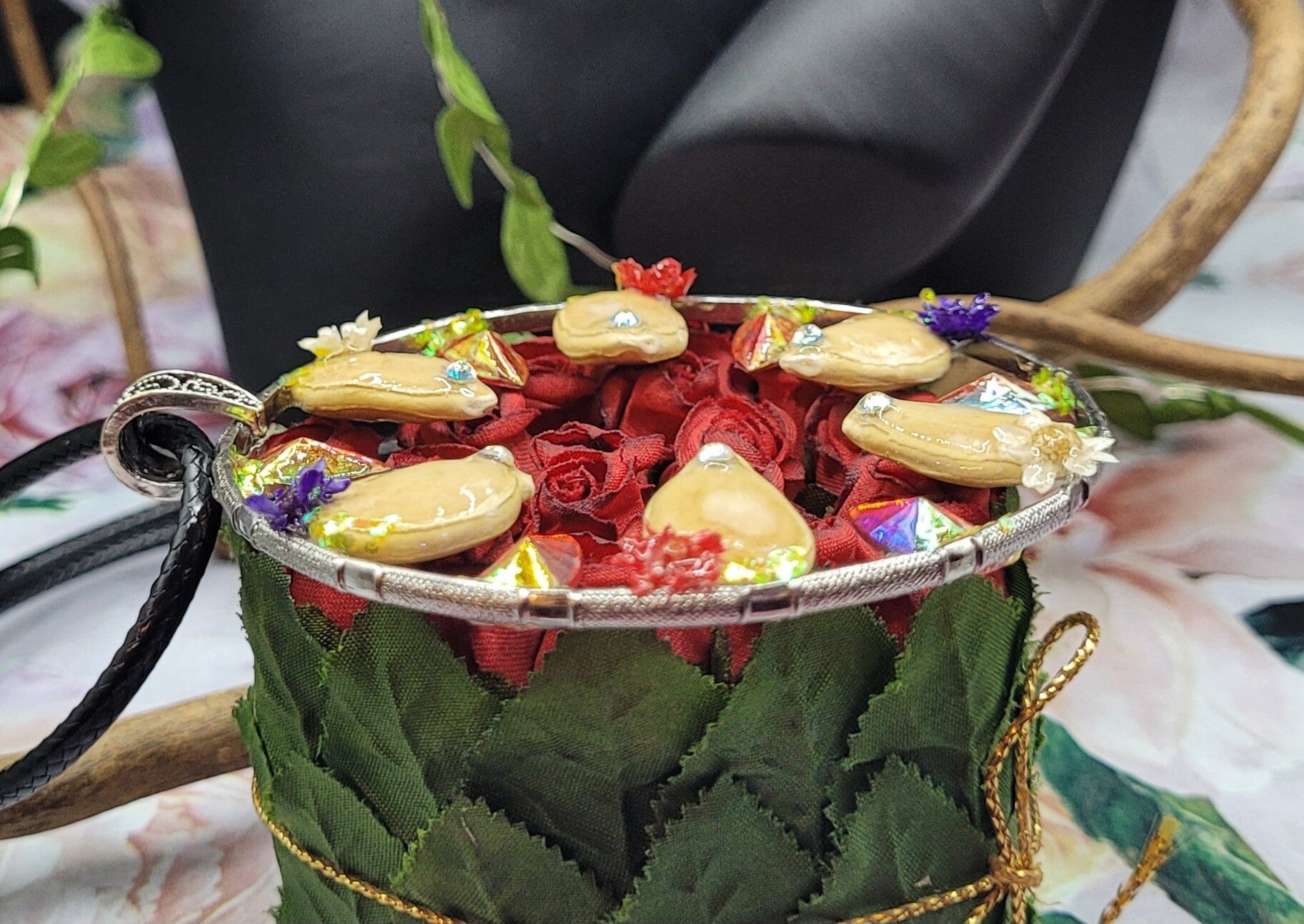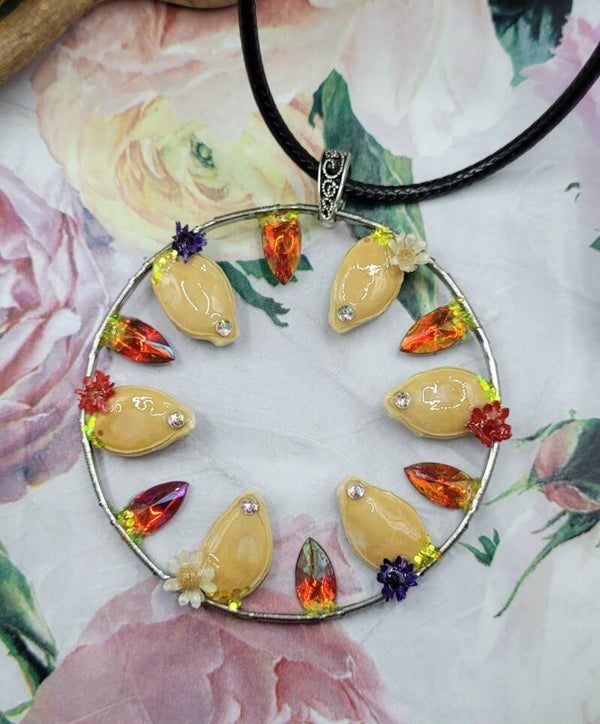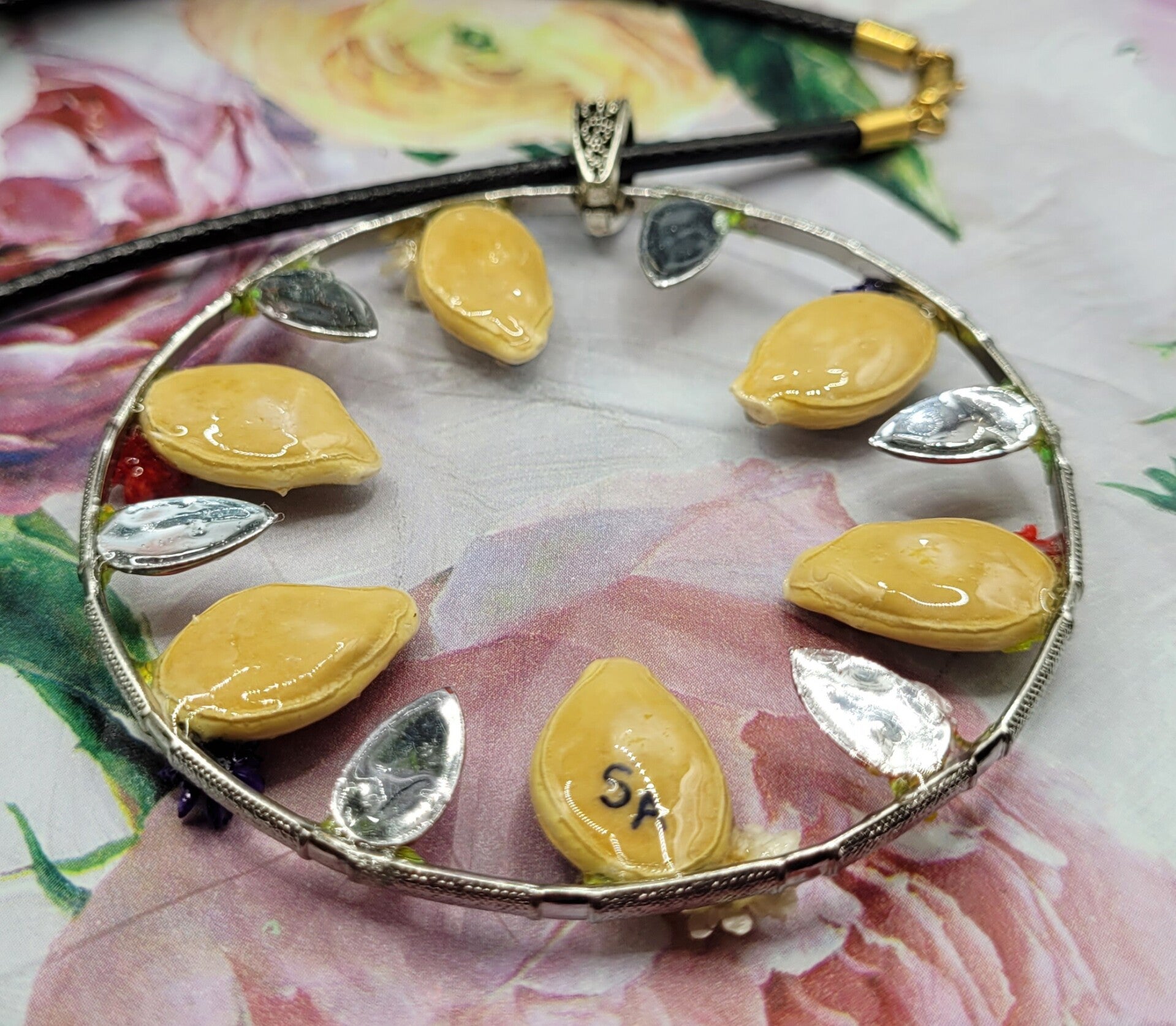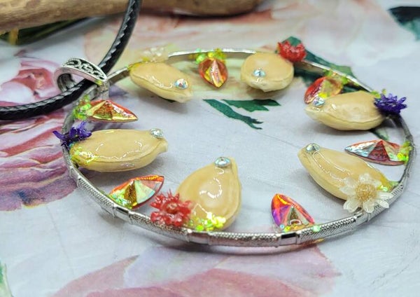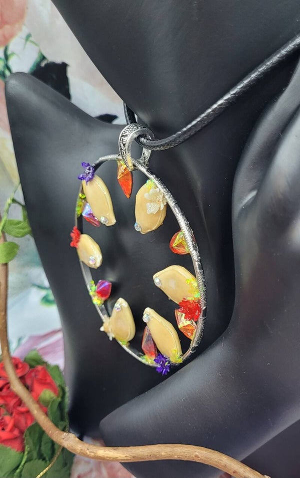 Collier composé d'un élégant anneau argenté, orné de graines de potimarron délicatement strassées aux extrémités. Des strass rouges en forme de goutte d'eau viennent se mêler à de petites fleurs miniscules : rouges, blanches et bleues, disposées avec soin sur le contour intérieur de l'anneau, créant une harmonie subtile entre la nature et le scintillement.