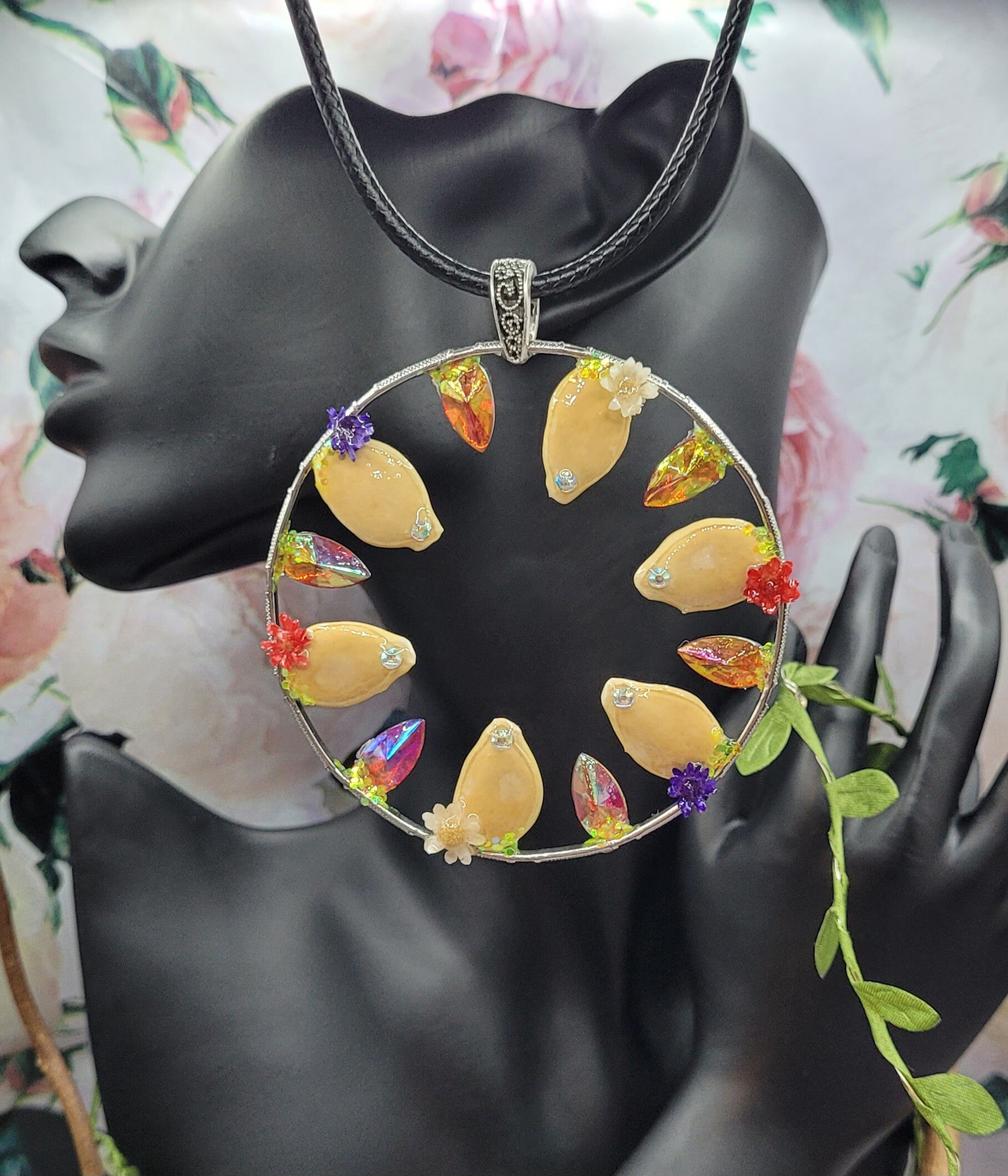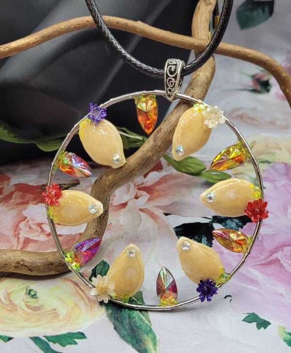 Le tout est scellé dans la résine, créant une pièce unique, et monté sur une jolie bélière argentée et un cordon en cuir noir, apportant à l'ensemble une touche de modernité et d'élégance.