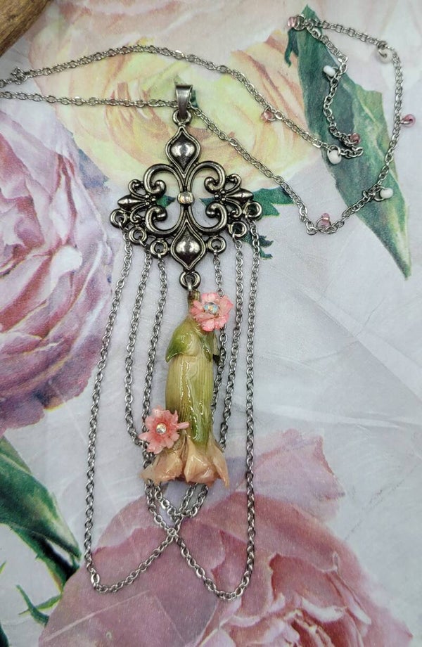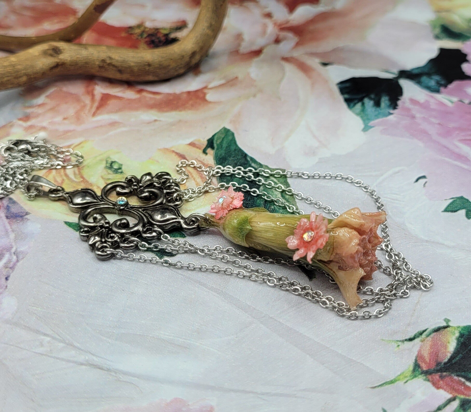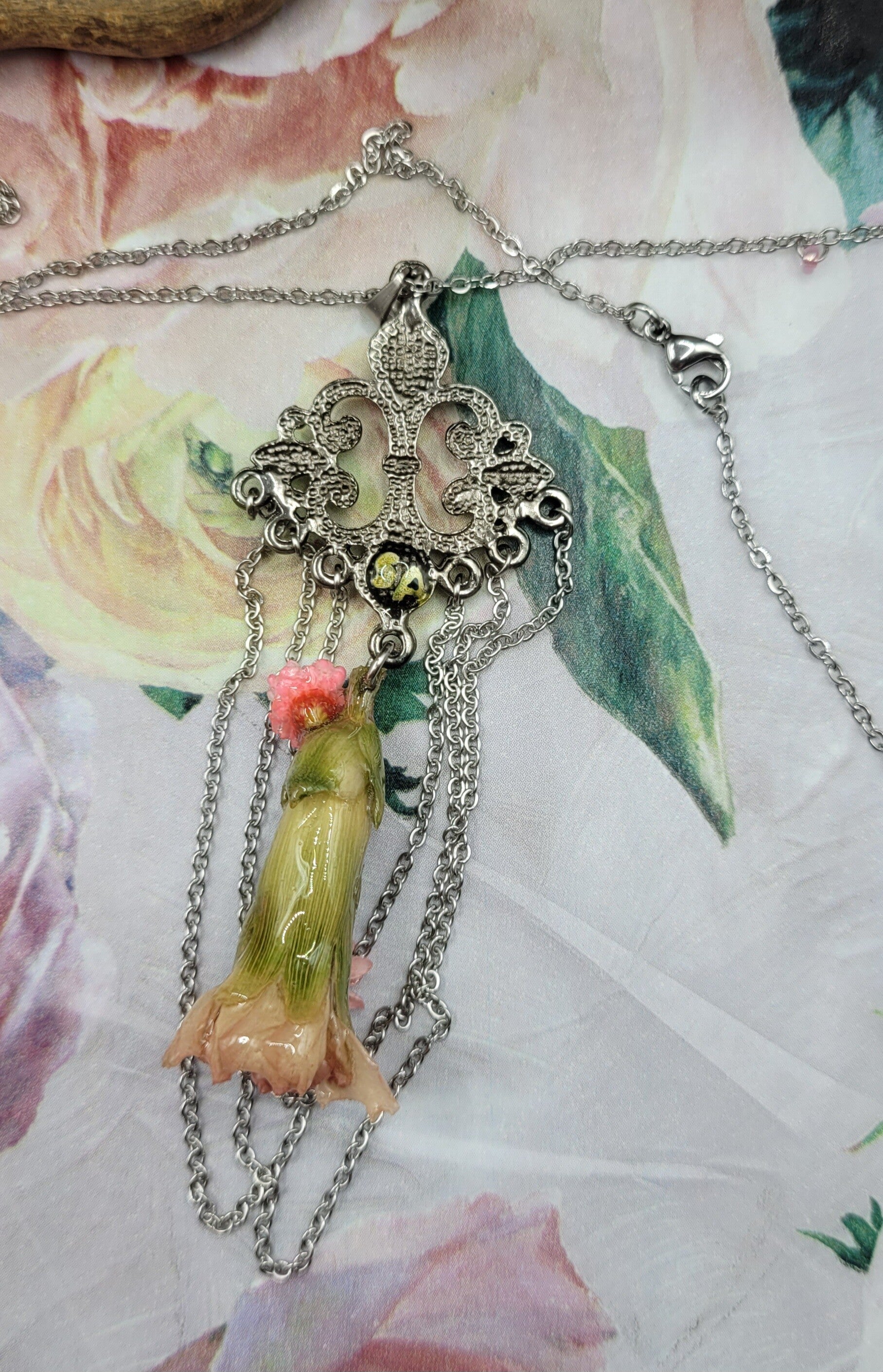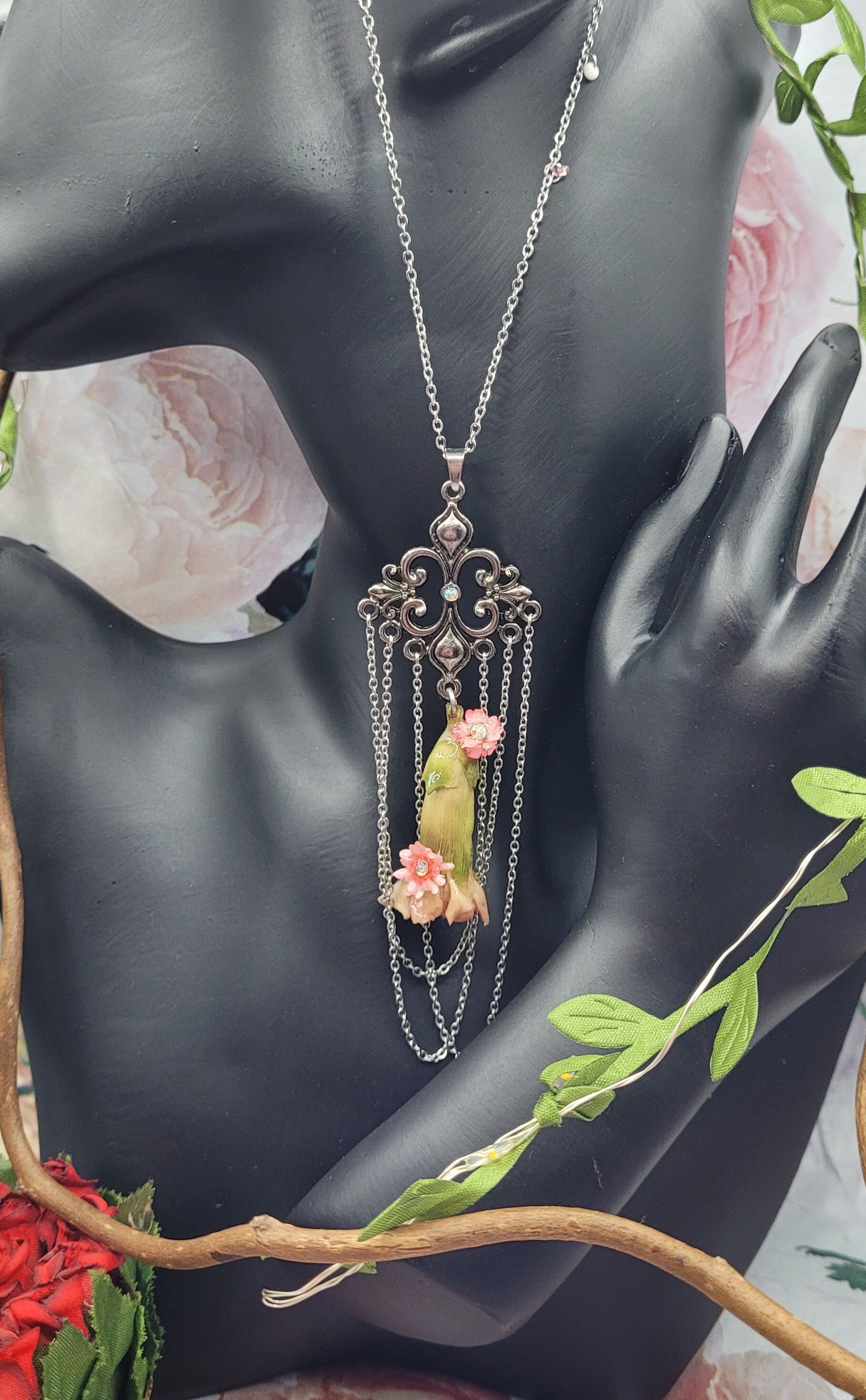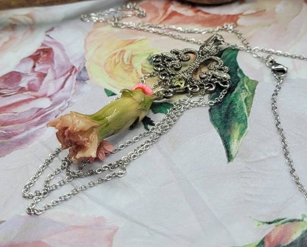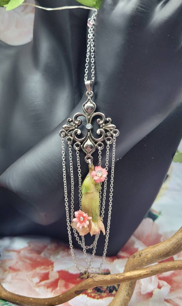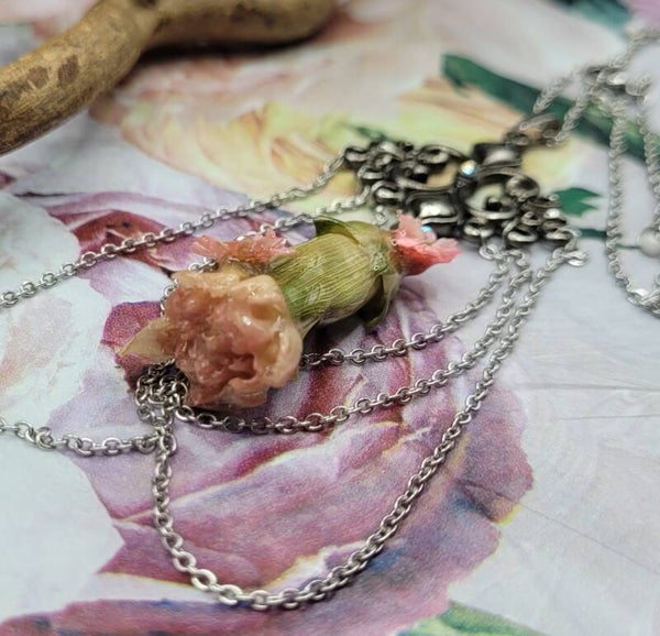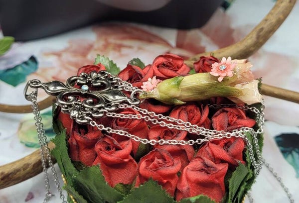 Une fleur d'oeillet fermée rose clair ainsi que 2 minis marguerites roses comportants strass au centre , sont placées en pampille devant les chaînettes.