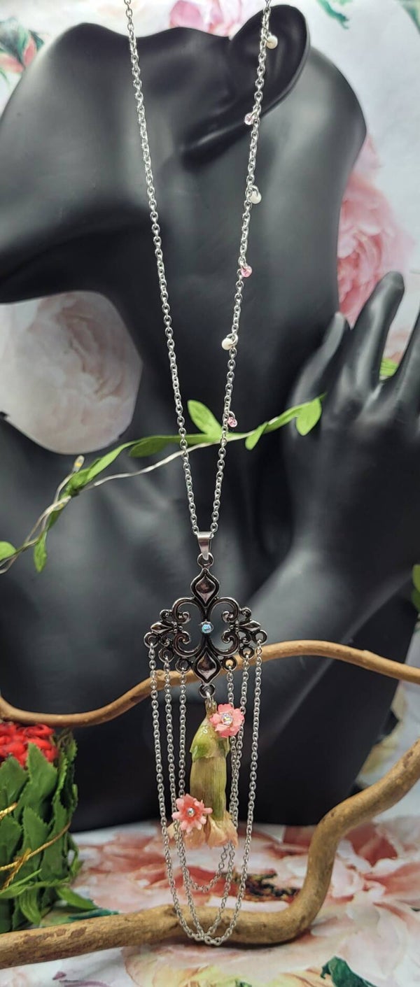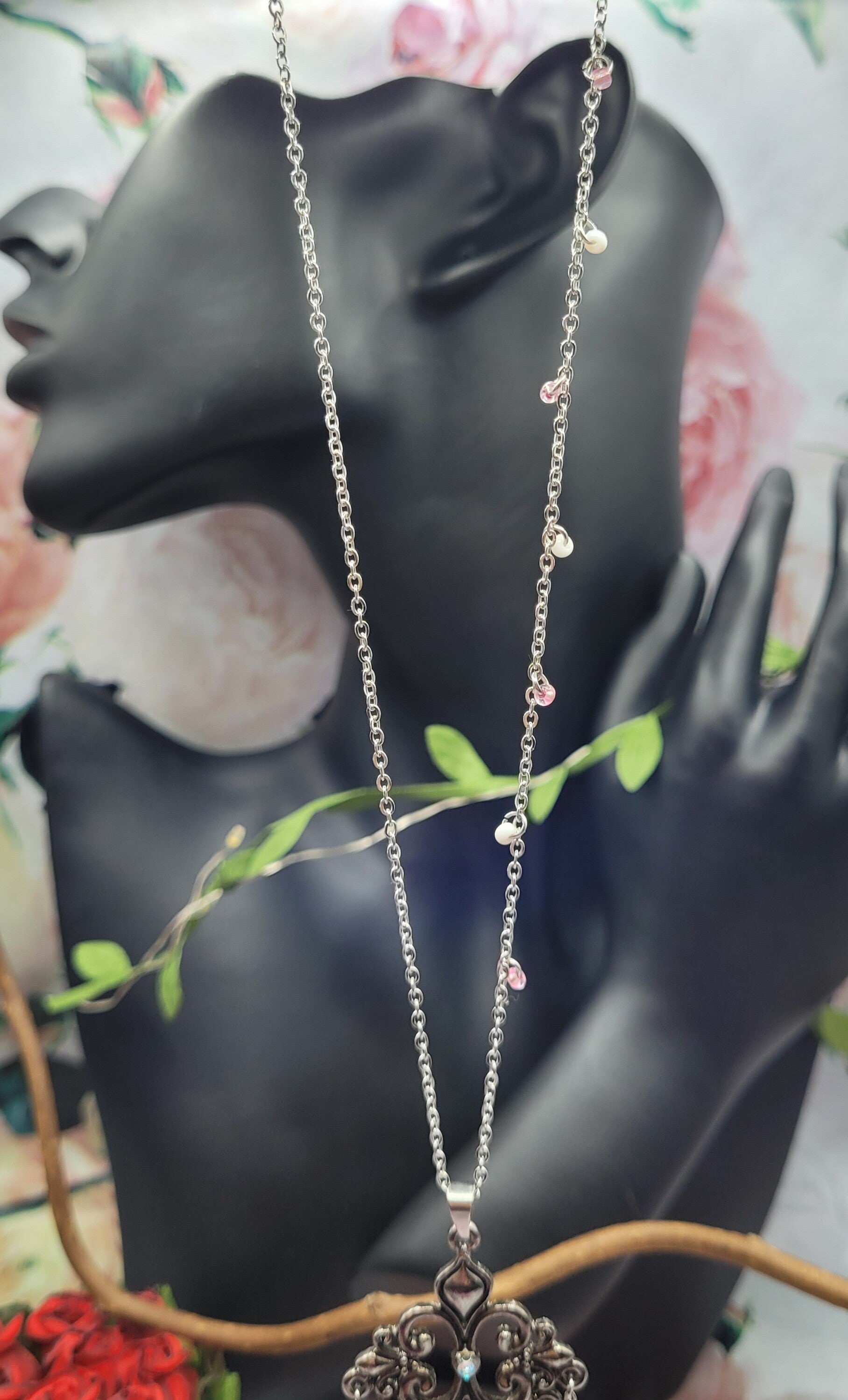 Collier composé d'un joli apprêt dans l'esprit Vintage , un strass au centre a été apporter . Des chaînettes sont ajoutées en pendant.