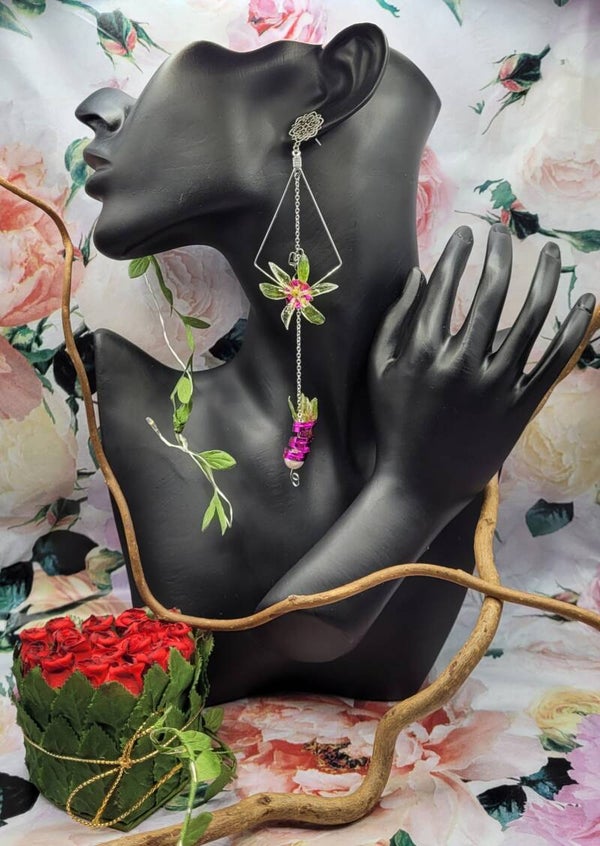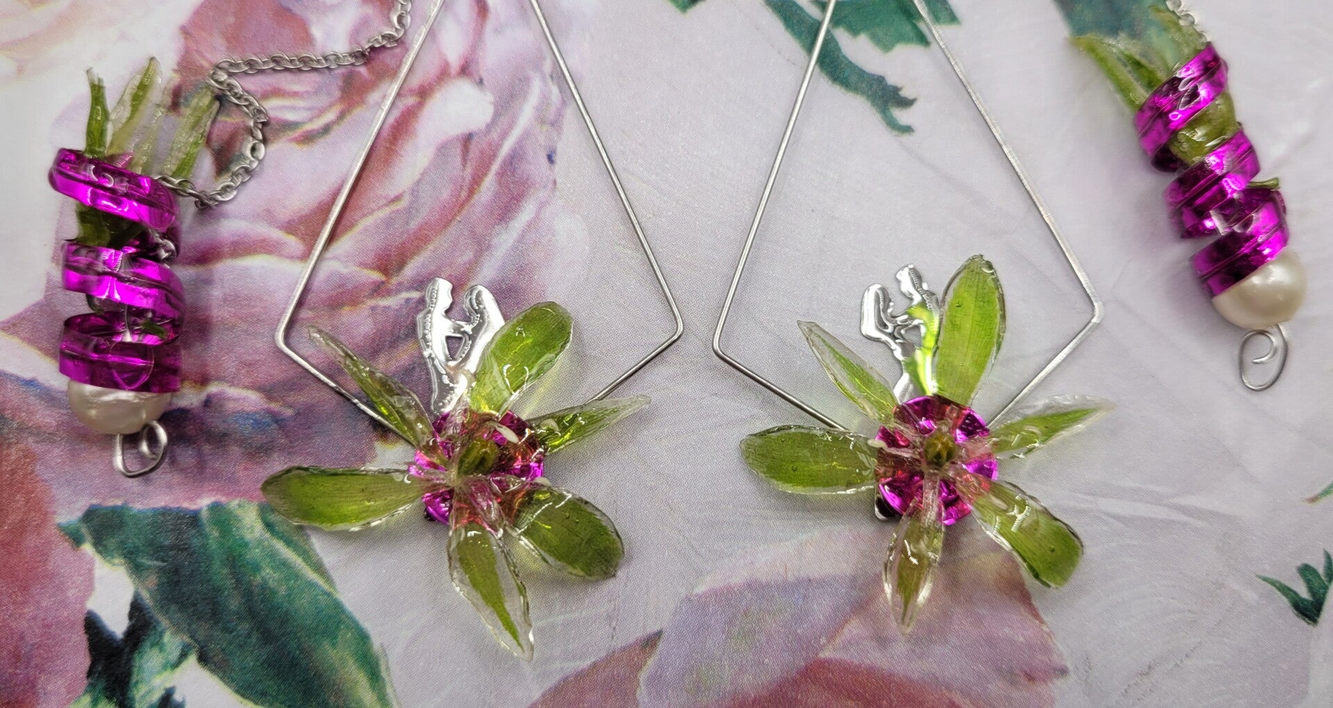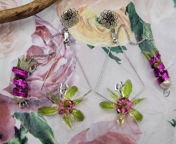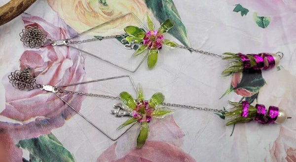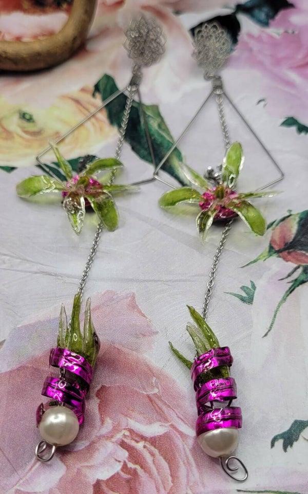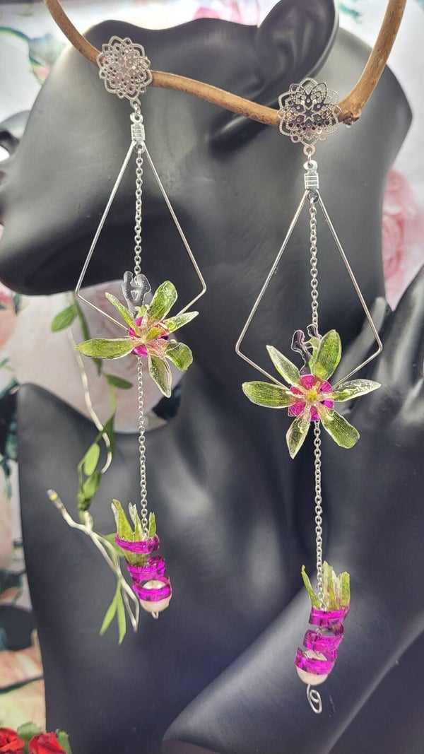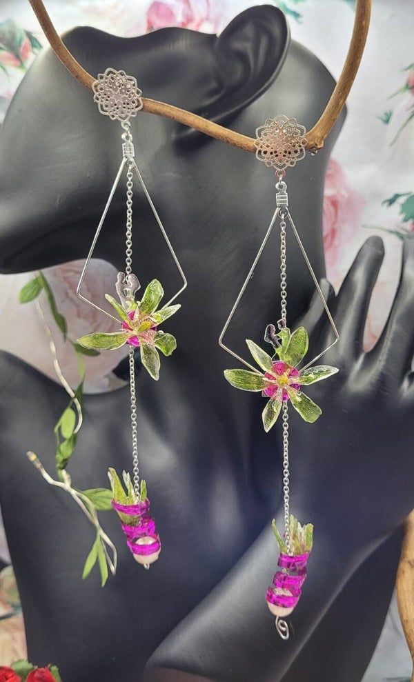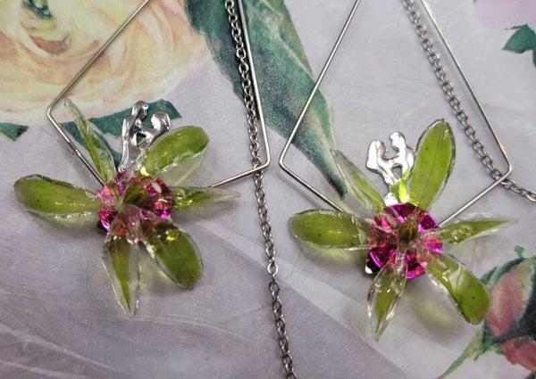 Boucles d'oreilles pendantes composées d'un apprêt de forme losange avec une jolie fleur verte aux contours blanc . En la résinant , ce côté transparent effet "verre" est apparue , ce qui est d'autant plus joli