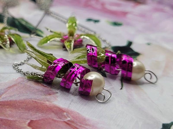 Une chaînette est ajoutée avec sur le bas un serpentin violet , une fleur verte et une perle blanche