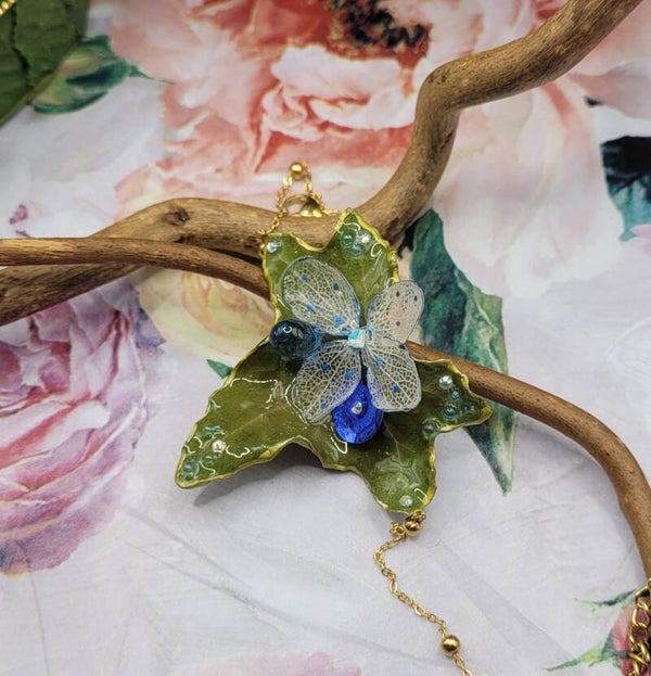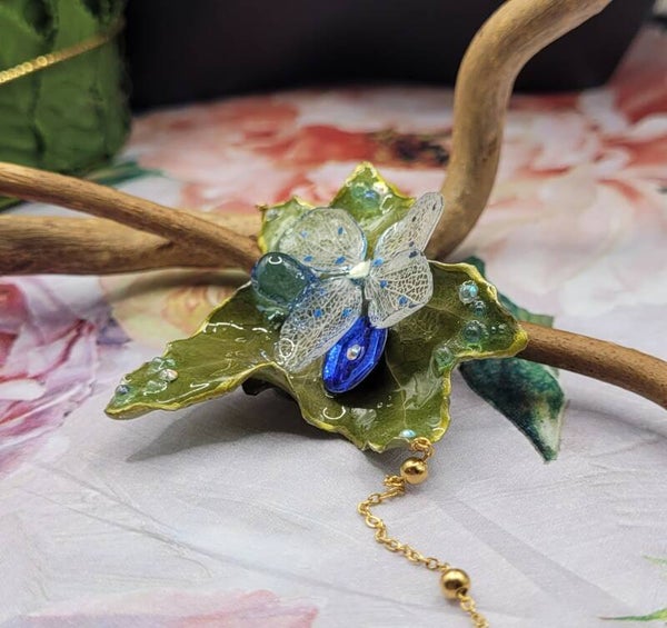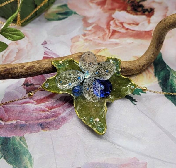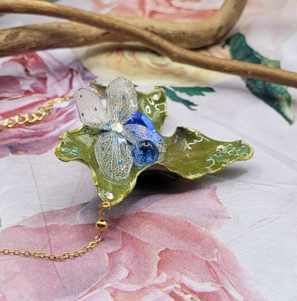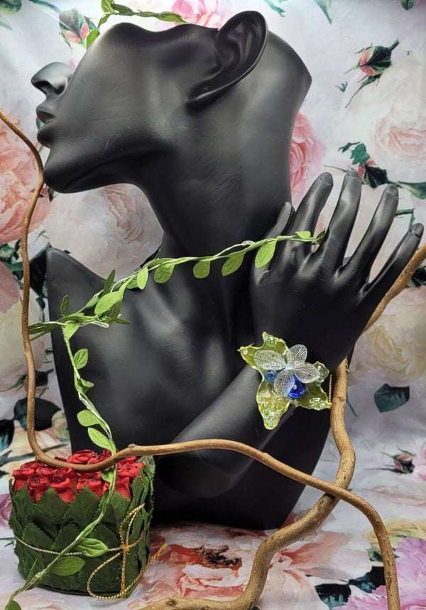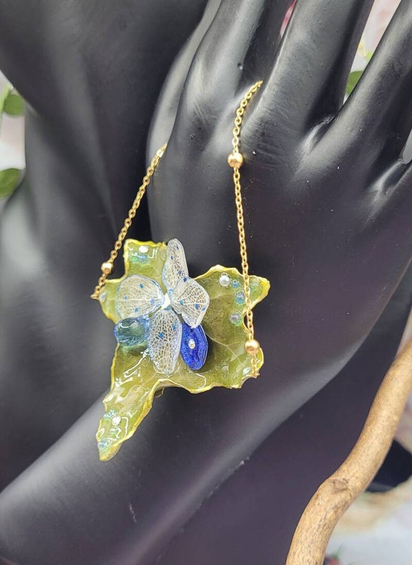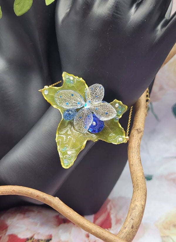 Bracelet composé d'une belle feuille de lierre aux contours doré , sur laquelle est posée une fleur de type hortensia au couleur bleue pâle , des contours bleus et petits pois tracés au feutre bleu sont ajoutés .
