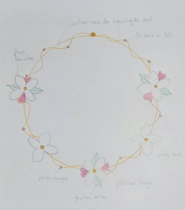 Un fil métallique doré comportant des perles rouges est torsadé autour du collier