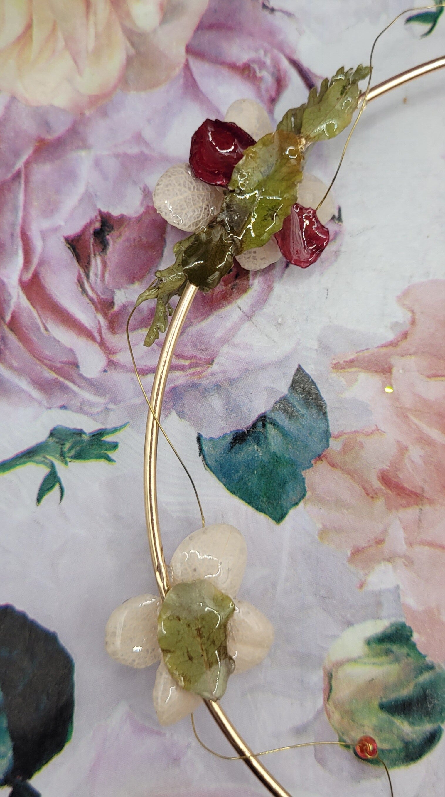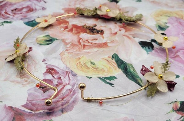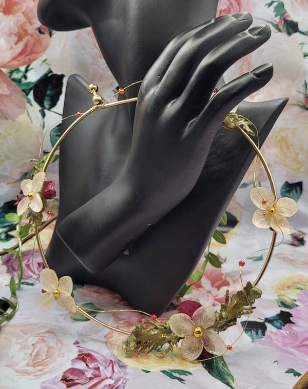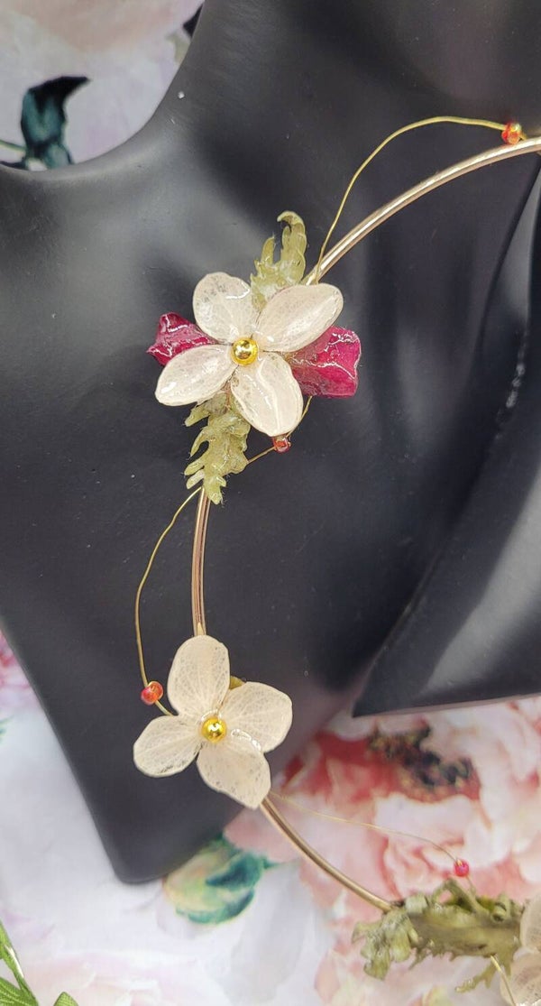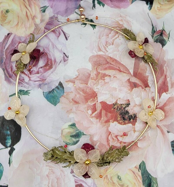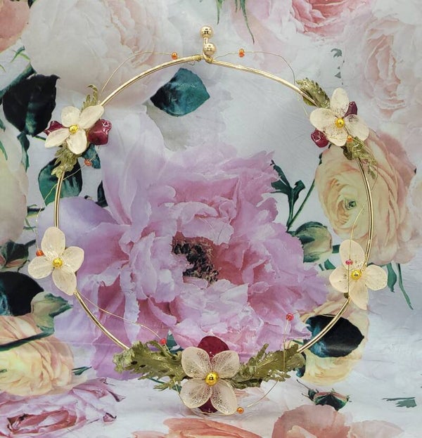 5 fleurs blanches d'hortensia sont ajoutée , ainsi que des demis perles doré au centre de chaques fleurs sont placées .