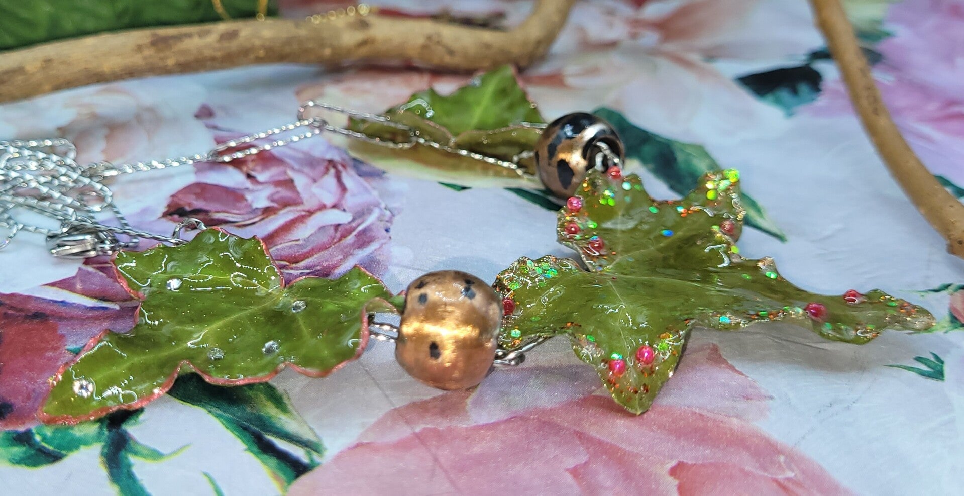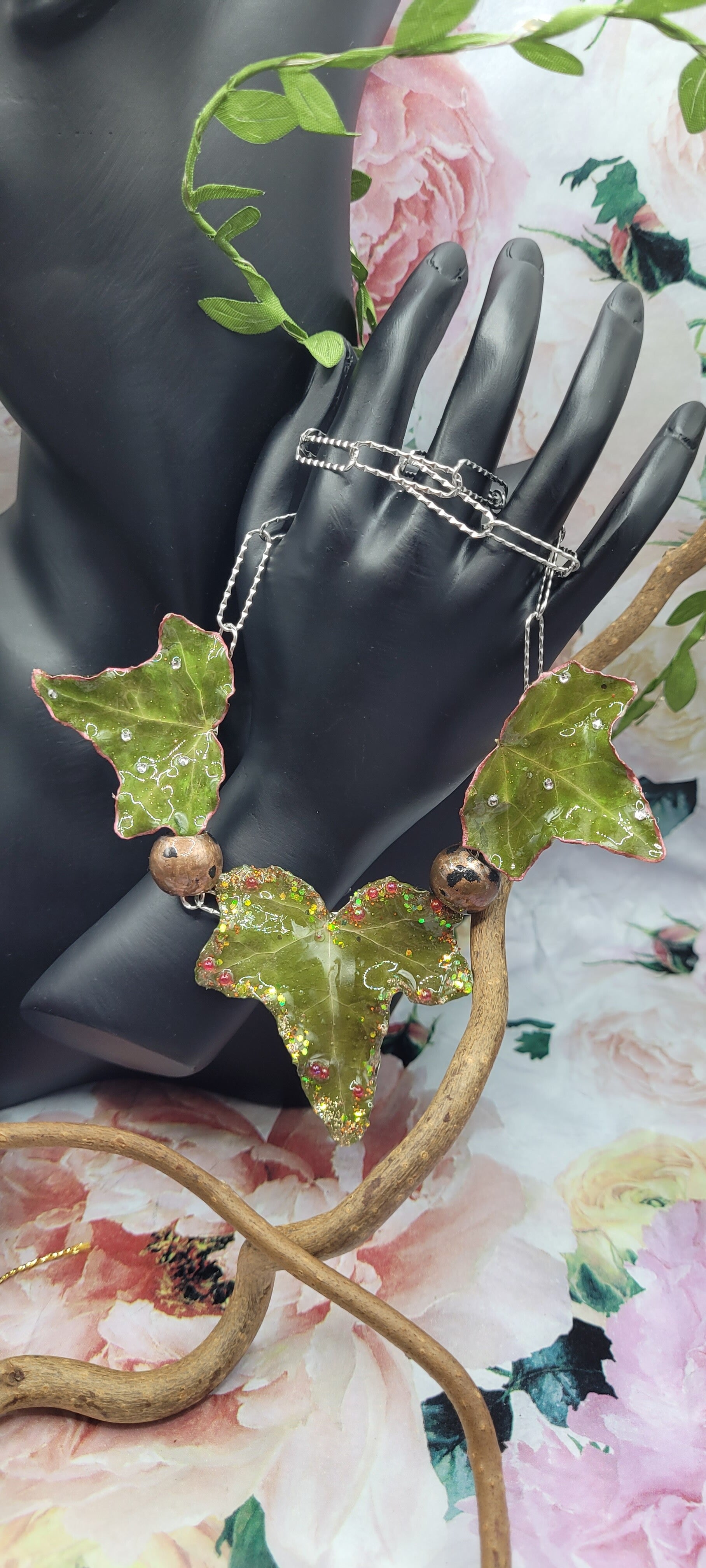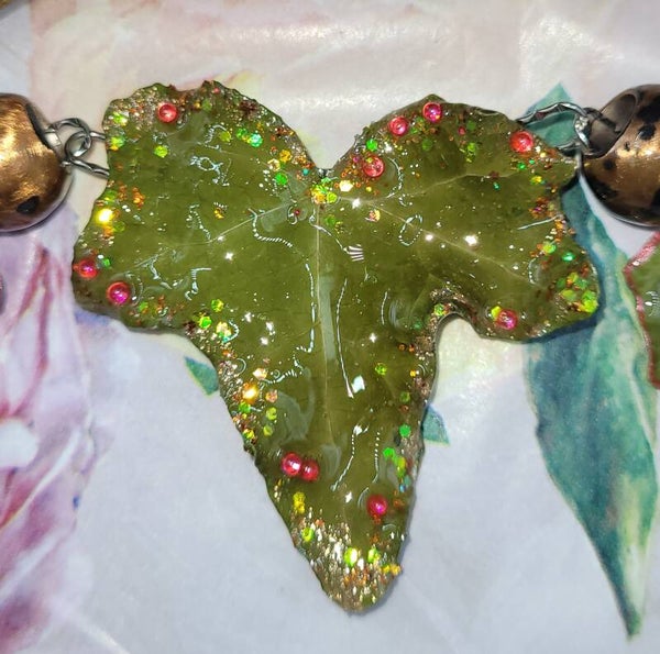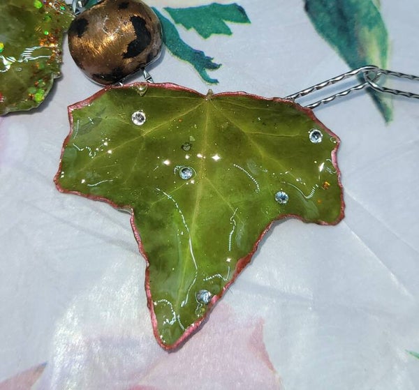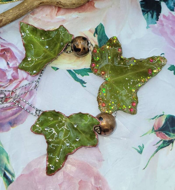 2 perles aux couleurs bronzes issus d'une transformation de ma part à l'aspect vieillis sont ajoutées entre les feuilles de lierre