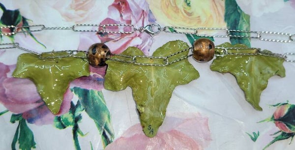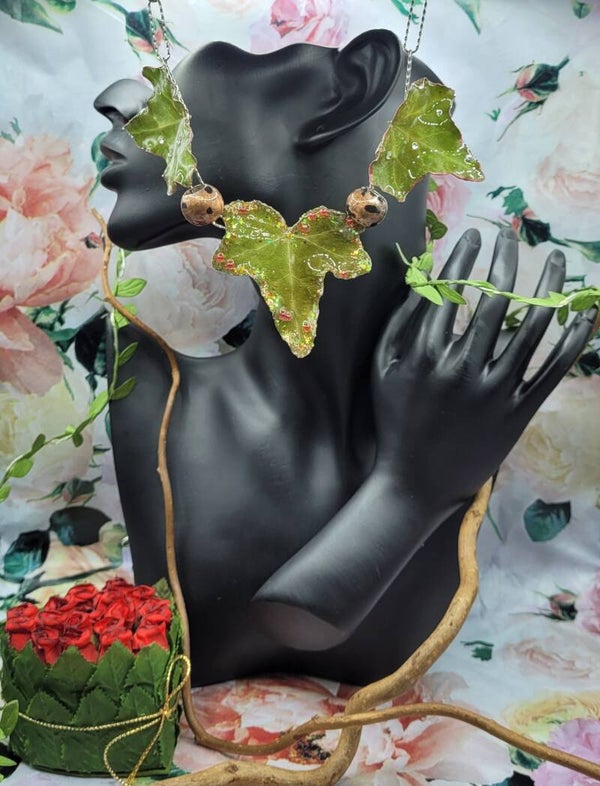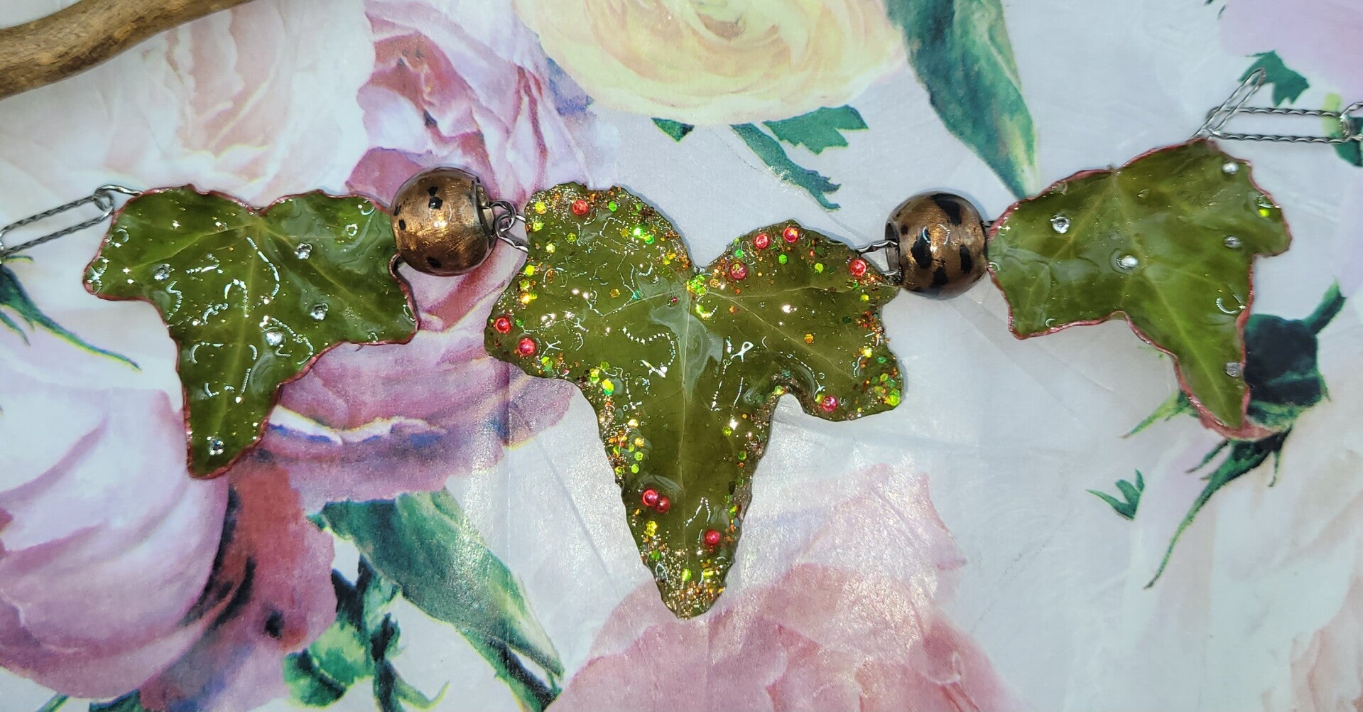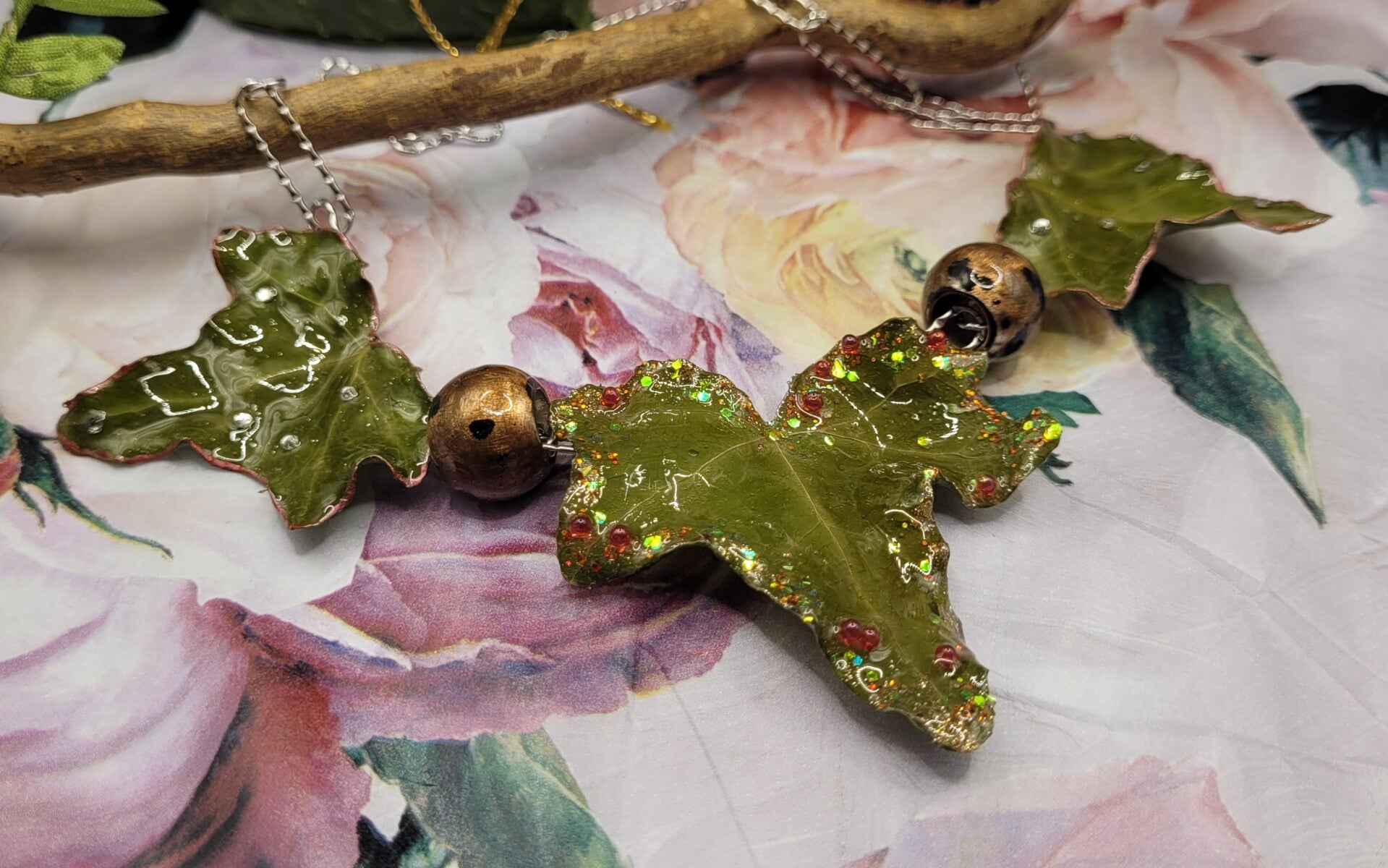 2 perles aux couleurs bronzes issus d'une transformation de ma part à l'aspect vieillis sont ajoutées entre les feuilles de lierre