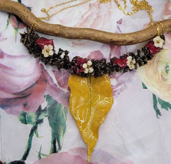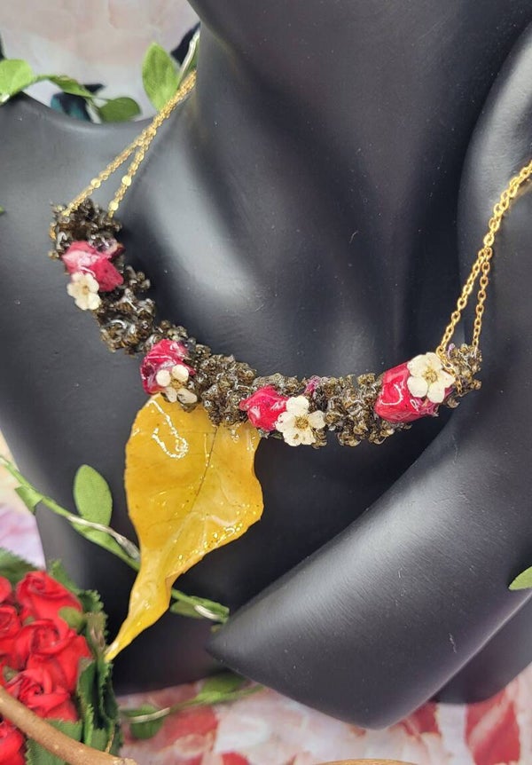 Collier composé d'une jolie fleur de couleur sombre de forme allongé , un peu arquée .