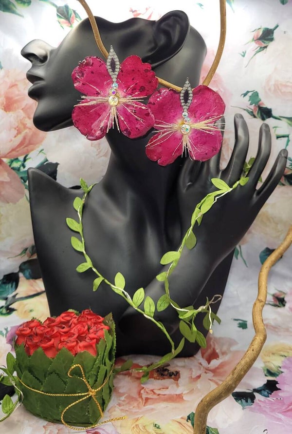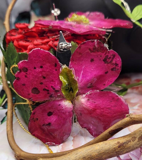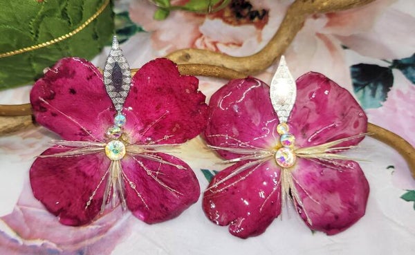 Boucles d'oreilles composées de 4 pétales de roses rouges/prunes assemblées par mes soins comme un trèfle à 4 feuilles .