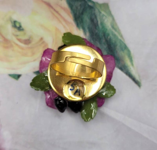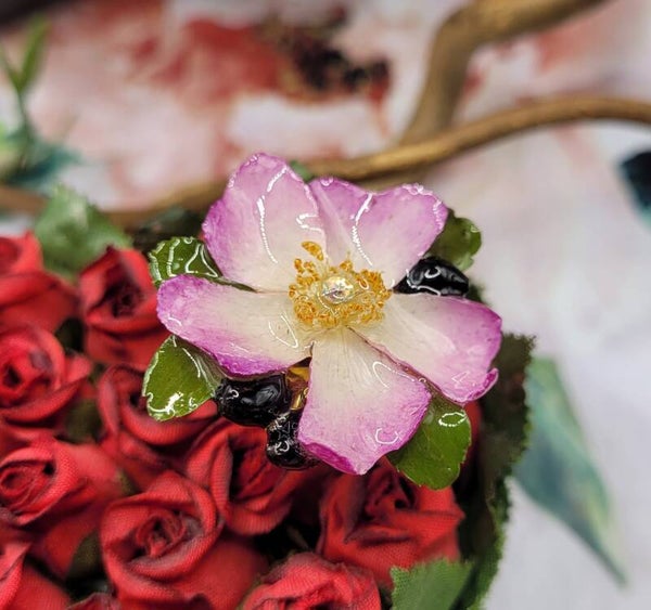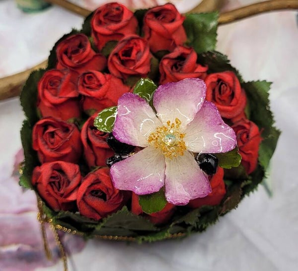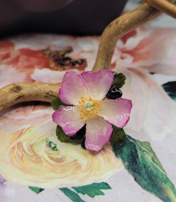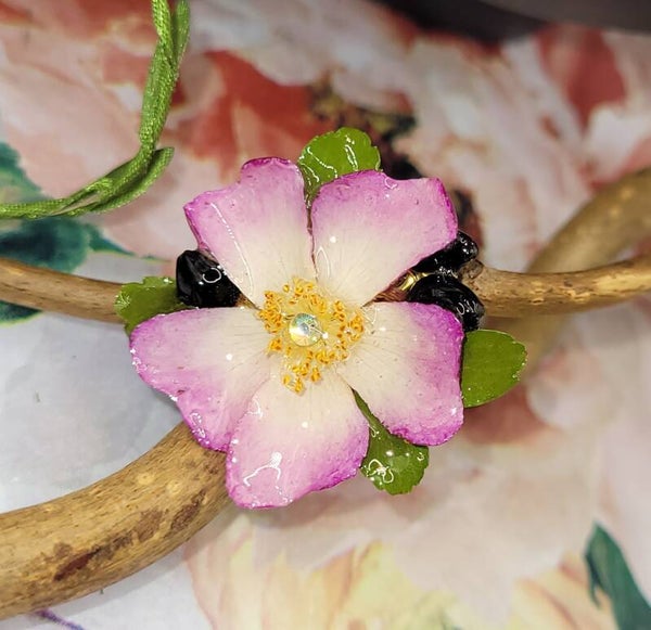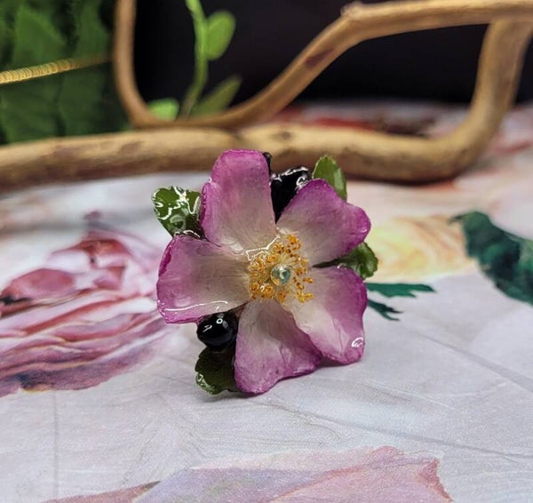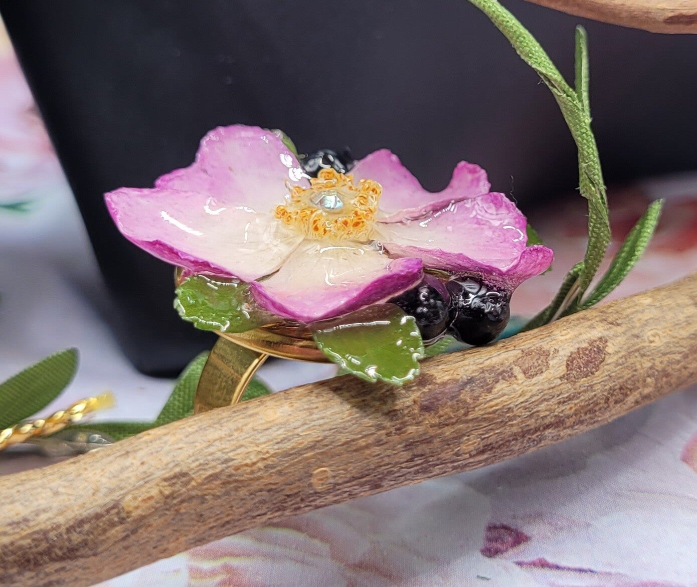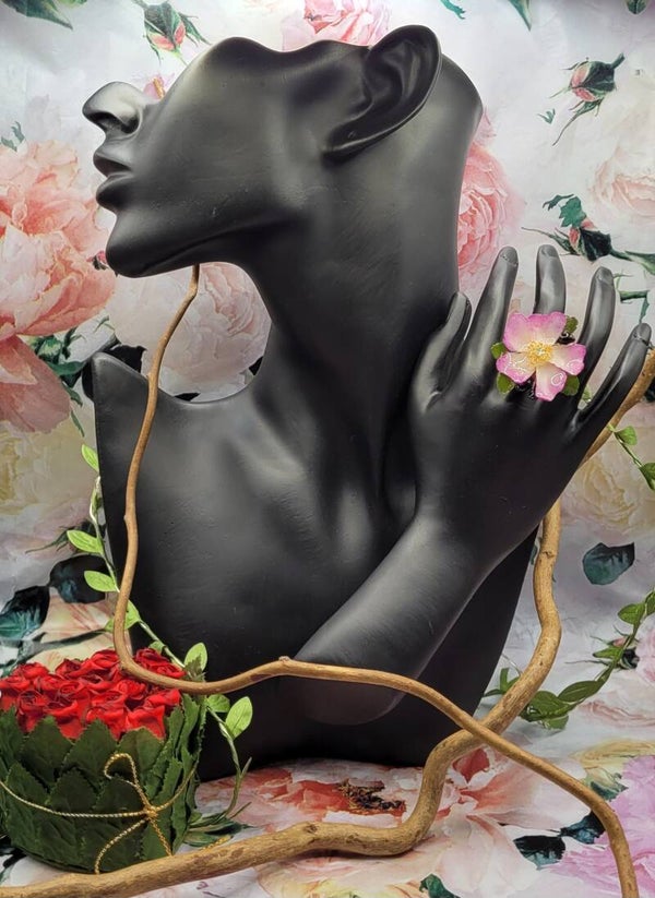 Bague composée d'une jolie petite rose de couleur rose et blanc provenant d'une variété de rosier . Le centre est avec des pistilles oranges et un strass orne le centre de cette fleur