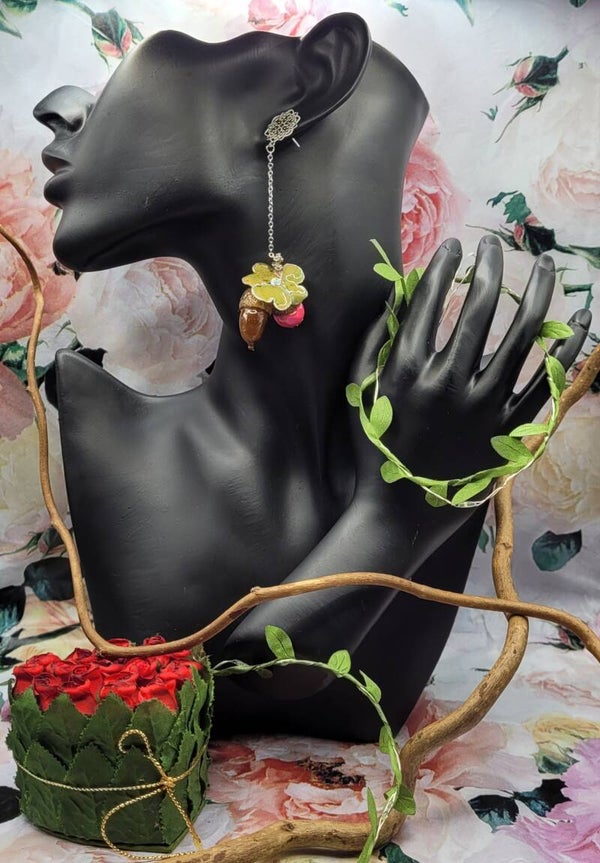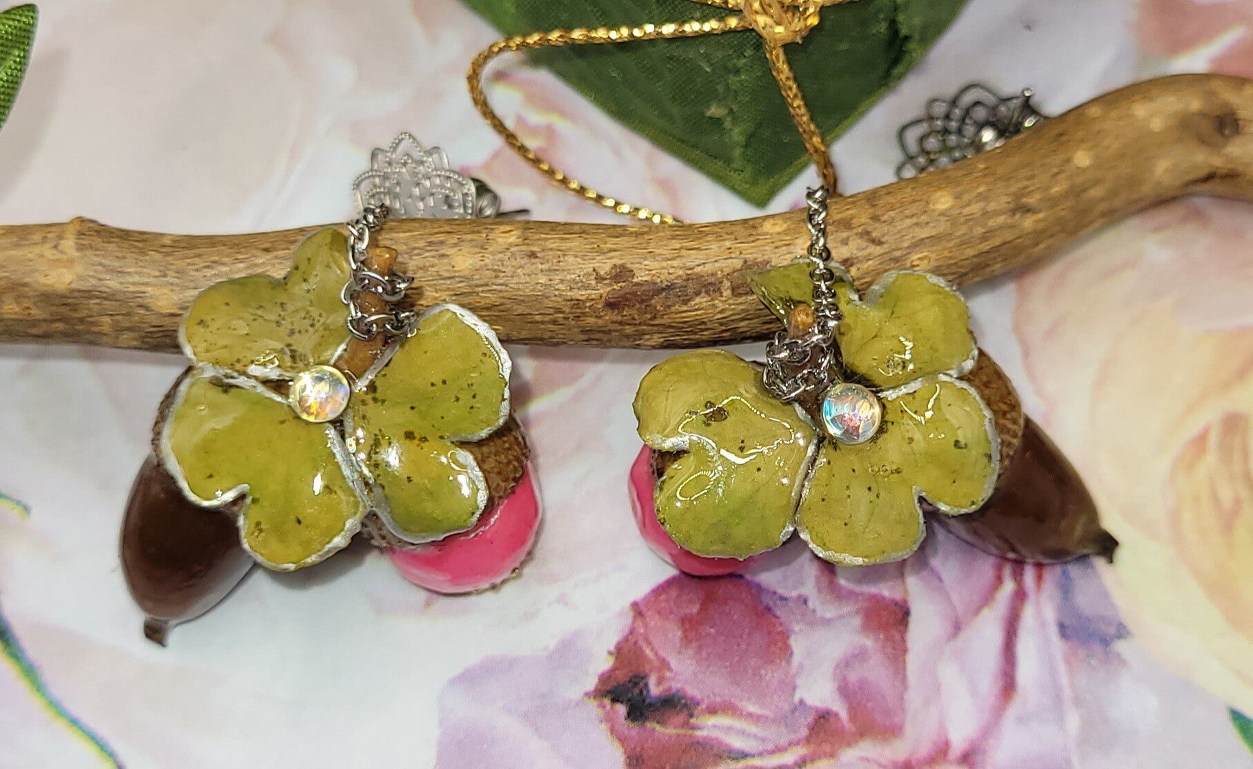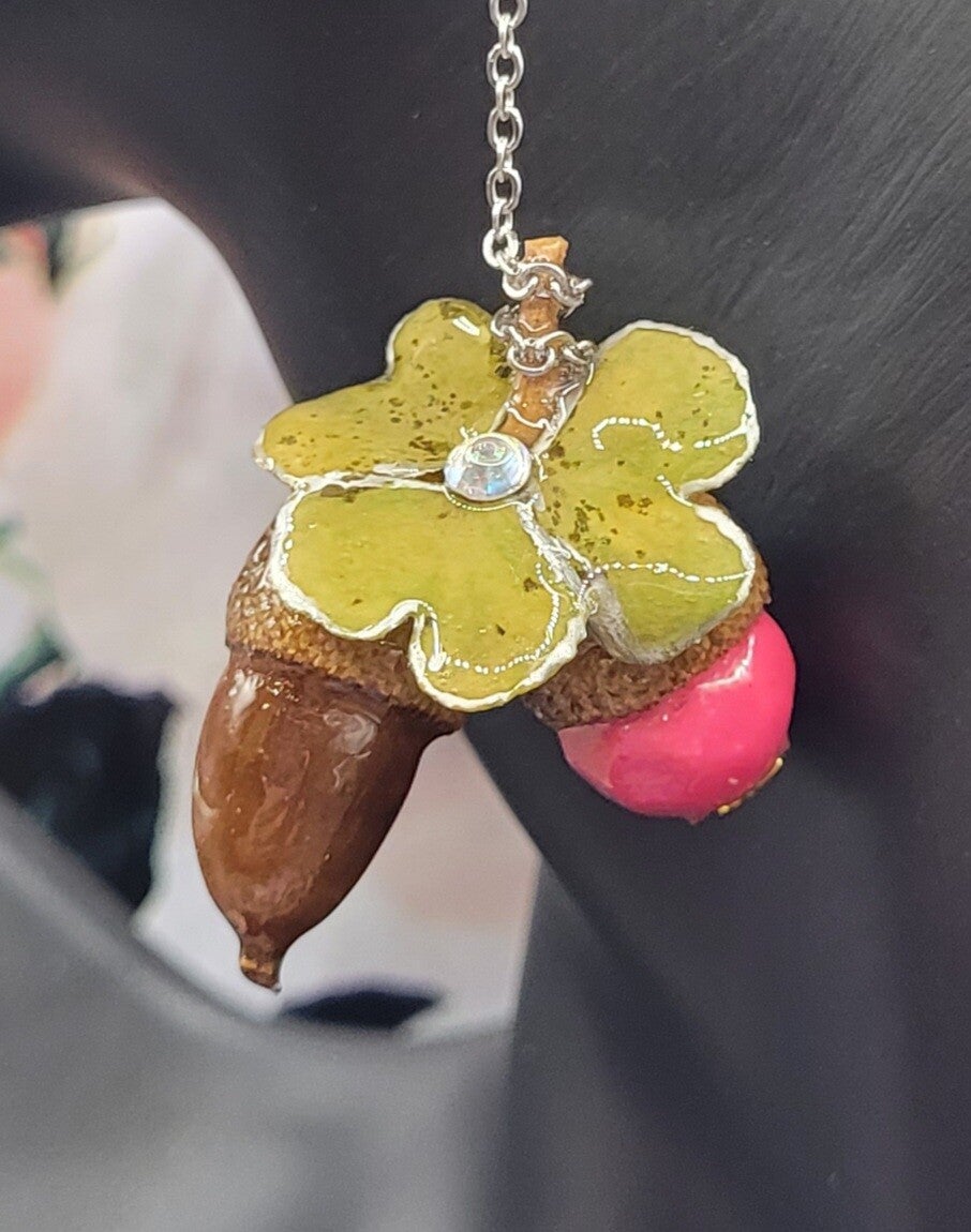 Un trèfle à 3 feuilles aux contours argentés accompagne ces glands , agrémenté d'un strass .
