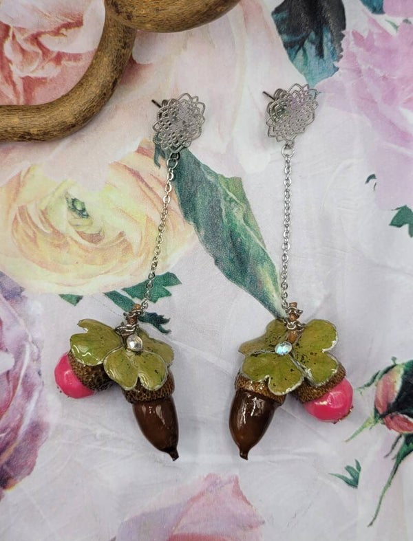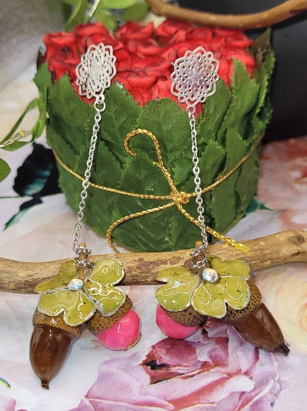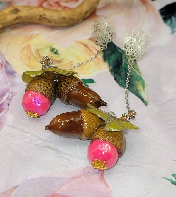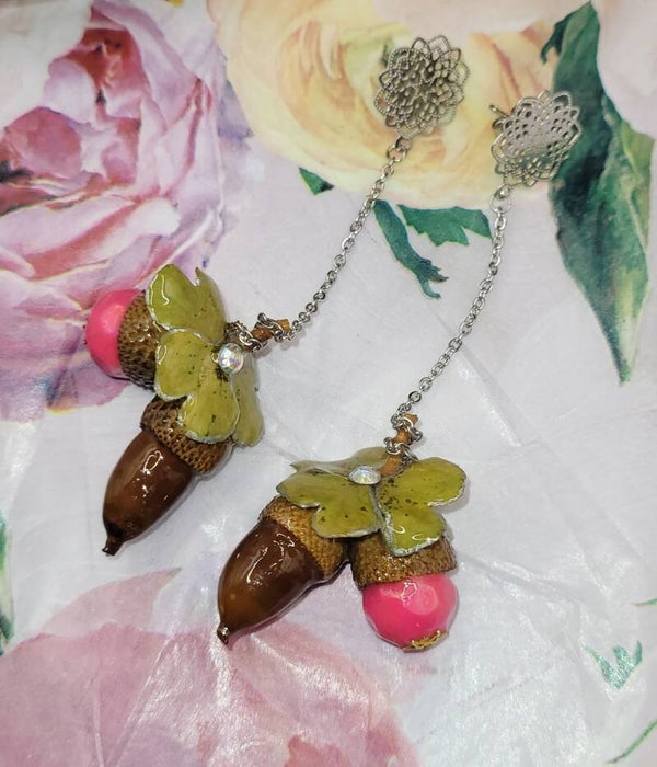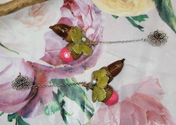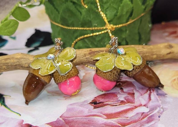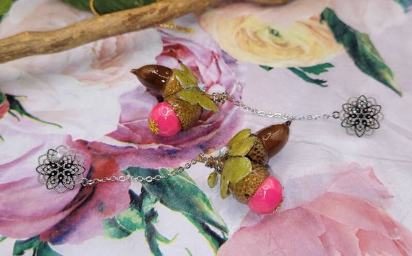 Boucles d'oreilles composées de 2 glands , l'un est entier , tandis que l'autre , juste la coque est restée et le gland a été retirer pour laisser place à une jolie perle facettée de couleur rose bonbon , une étoile dorée est placée en bout .