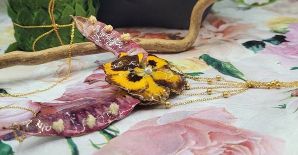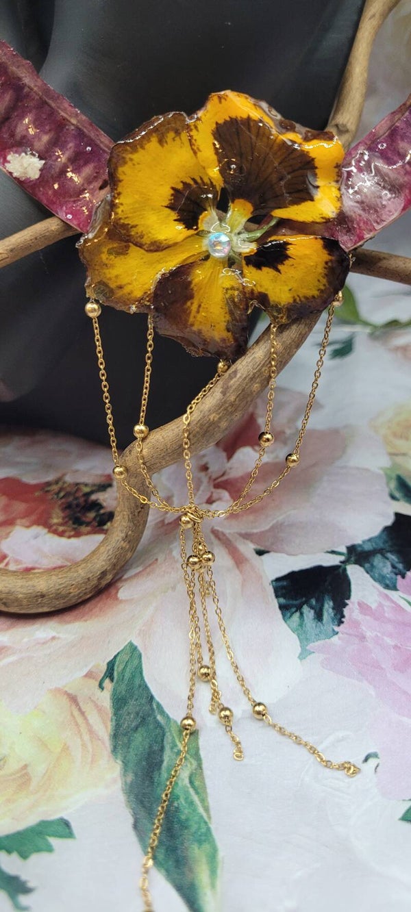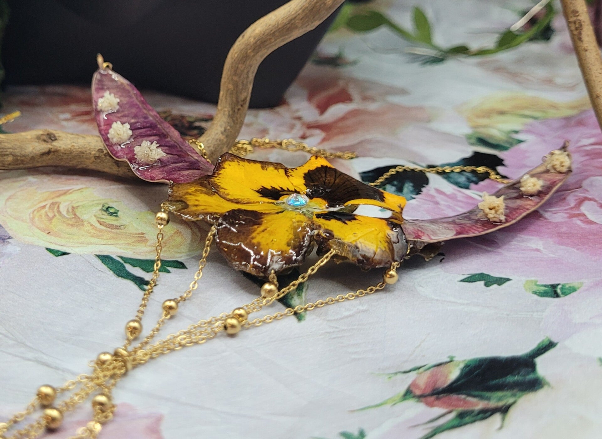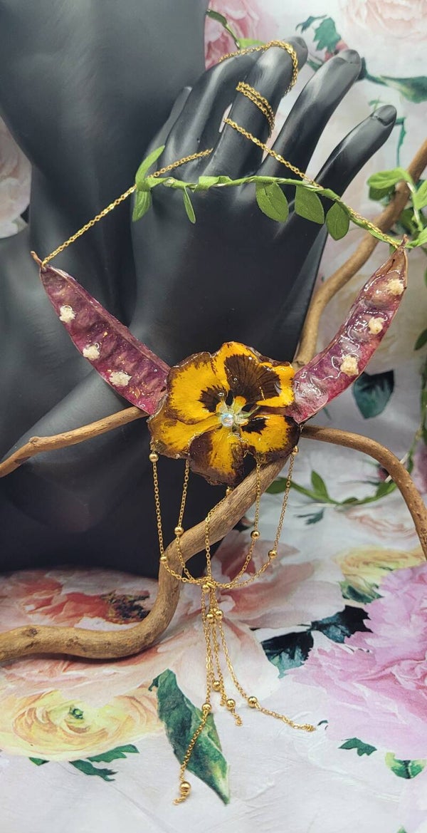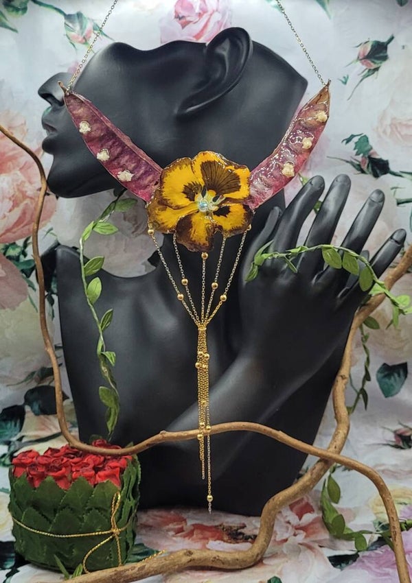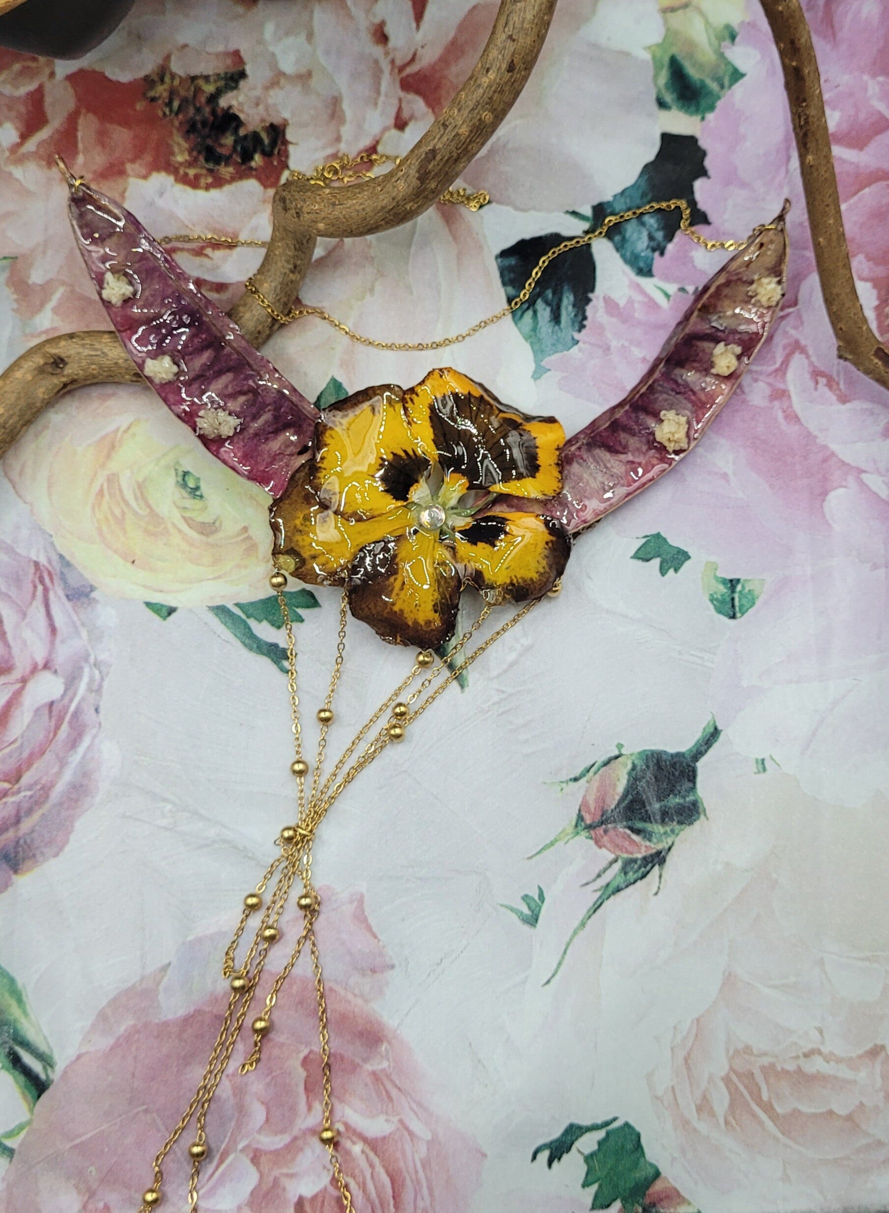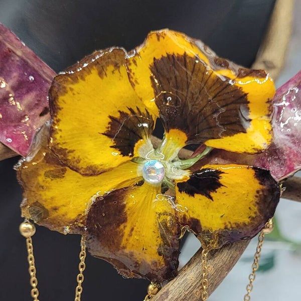 À la jonction de ces cosses est ajouté une fleur de pensée bi color , jaune et bordeaux avec strass au centre