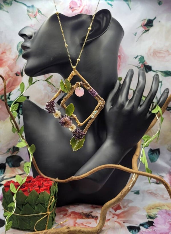 Le tout est scellé dans la résine et monté sur bélière et chaîne en maille boule en acier inoxydable doré