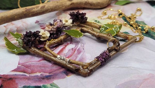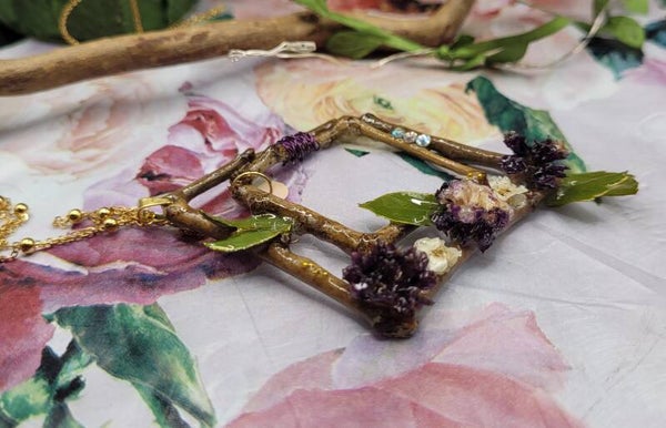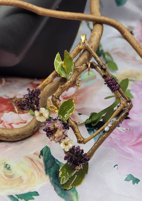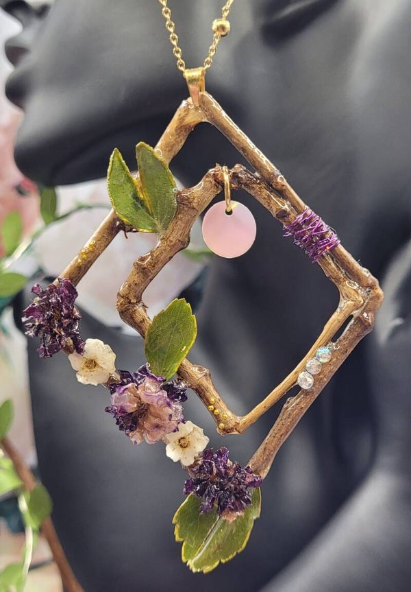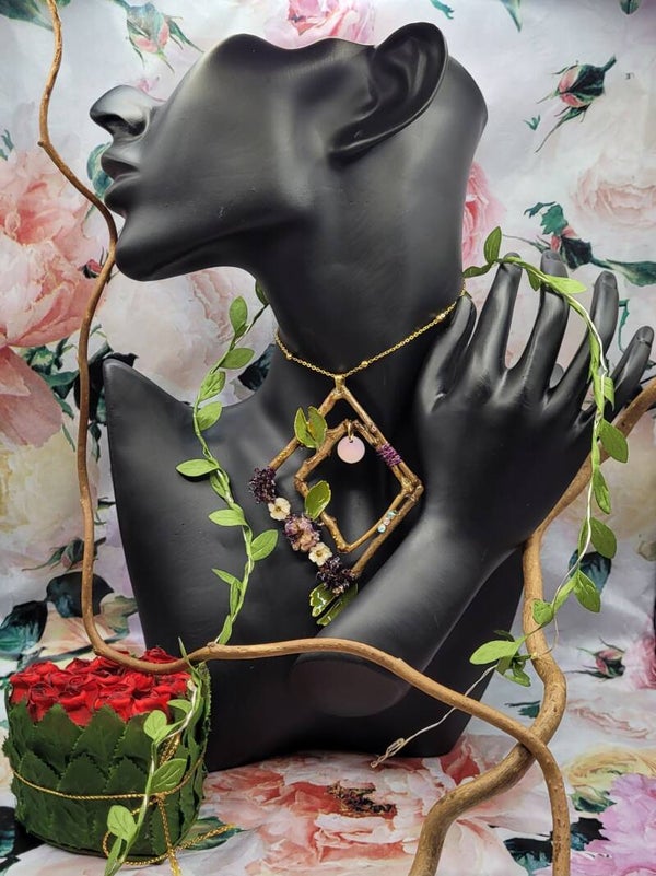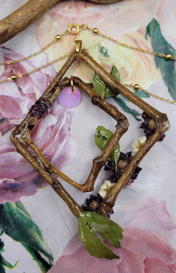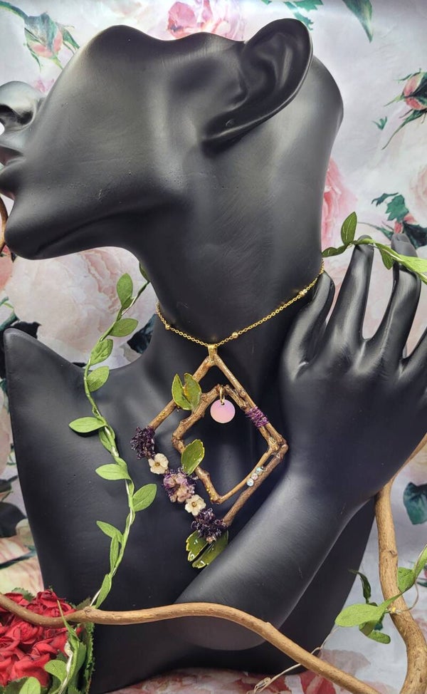 Collier composé de branches de bois placées en forme de losange . 1 petit et 1 grand losange , sans fond , ils sont ajourés