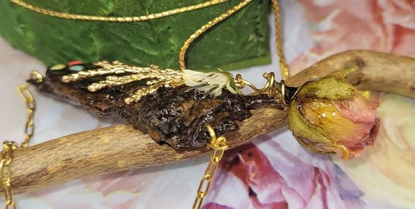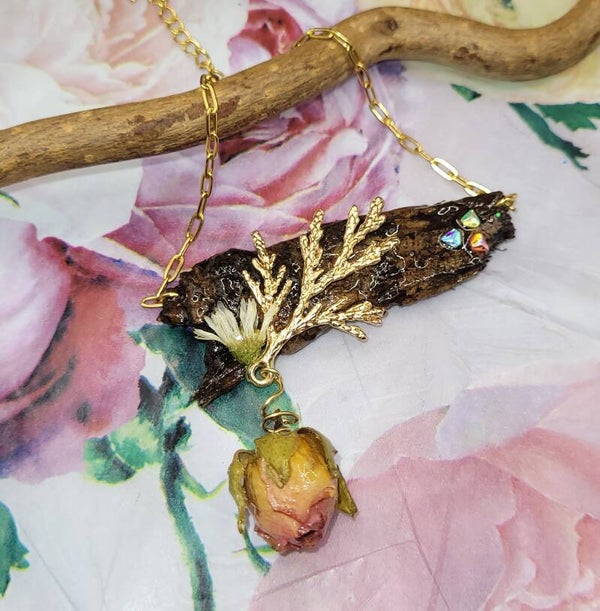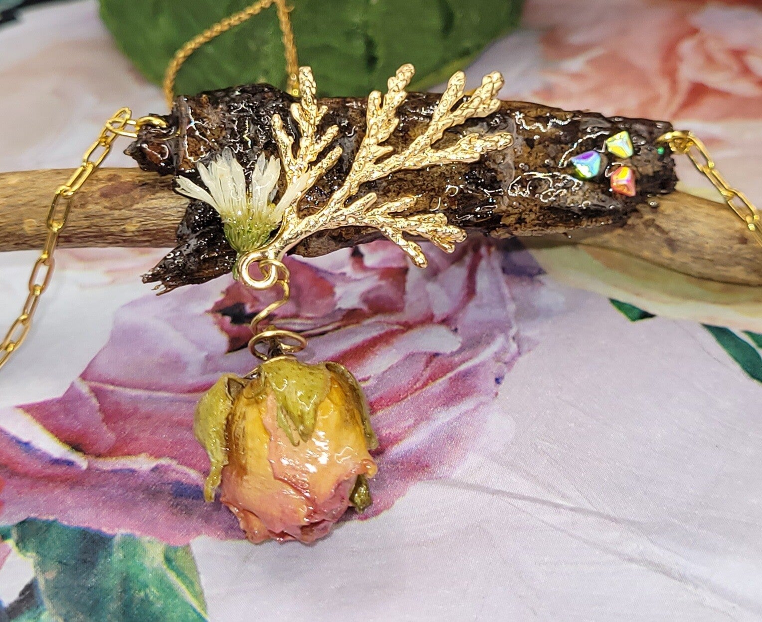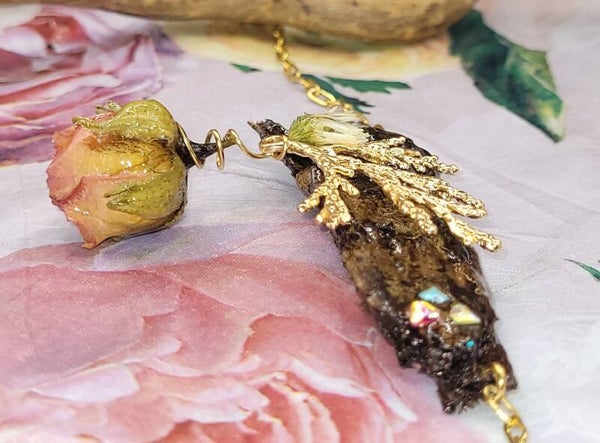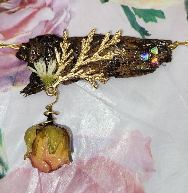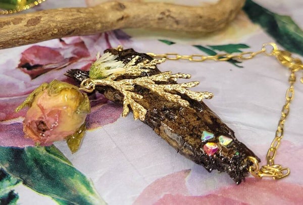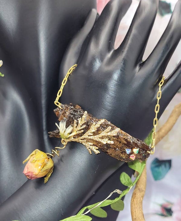 Bracelet composé d'une écorce de bois sur laquelle est posée un joli apprêt doré ressemblant à du cyprès