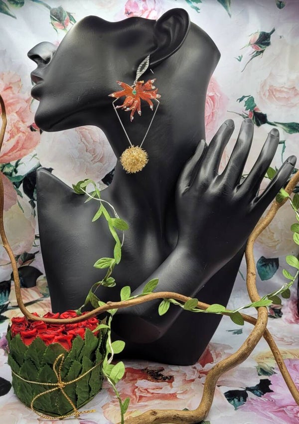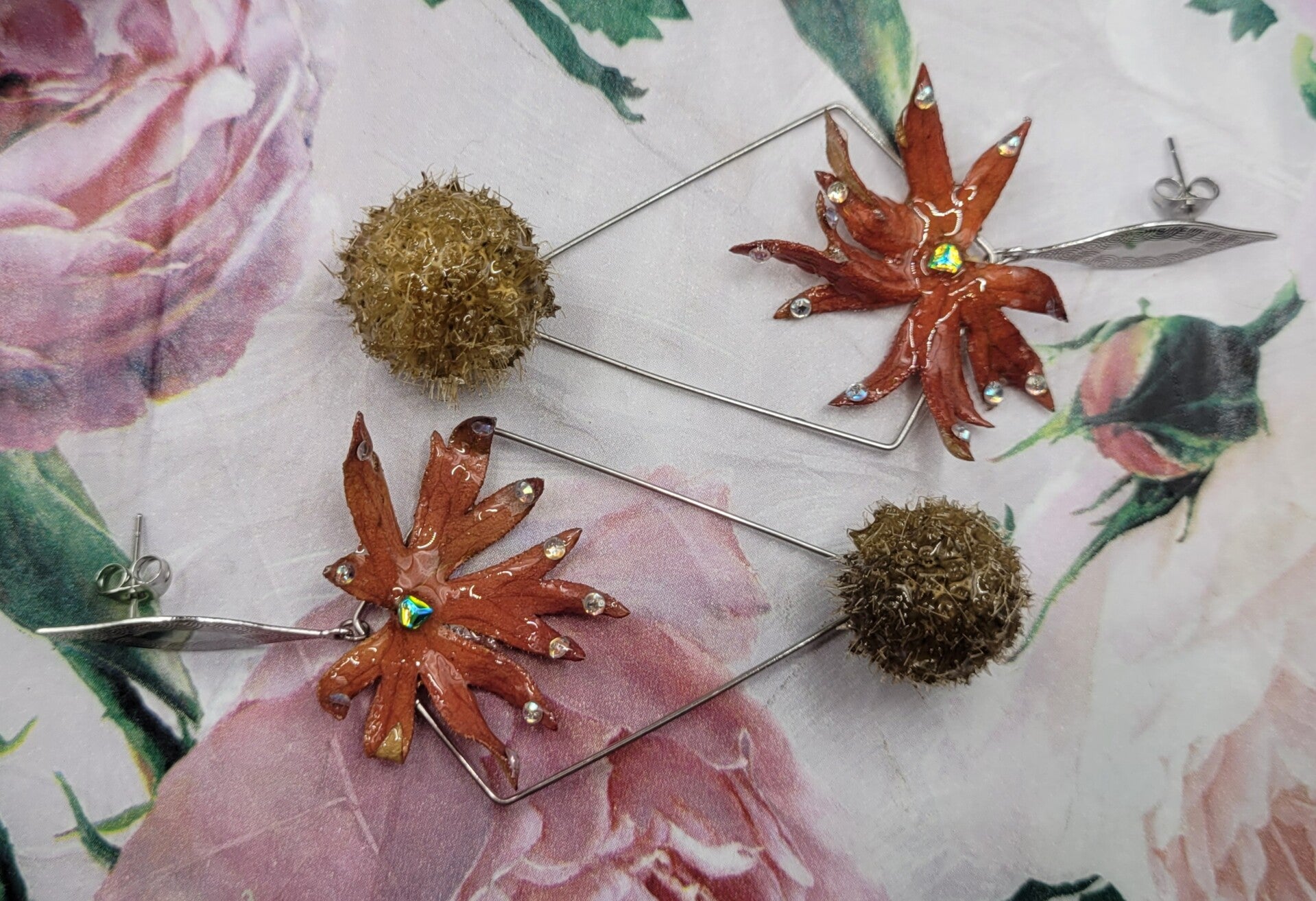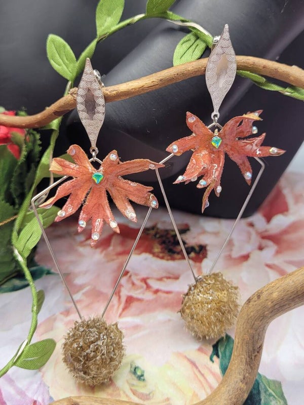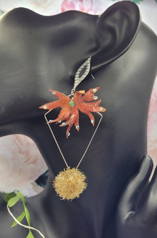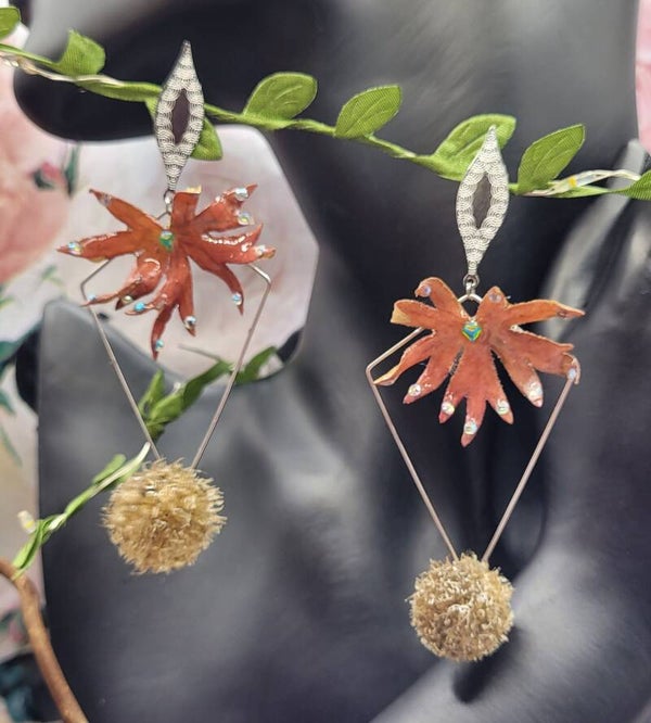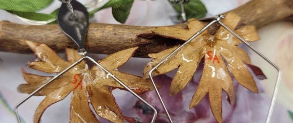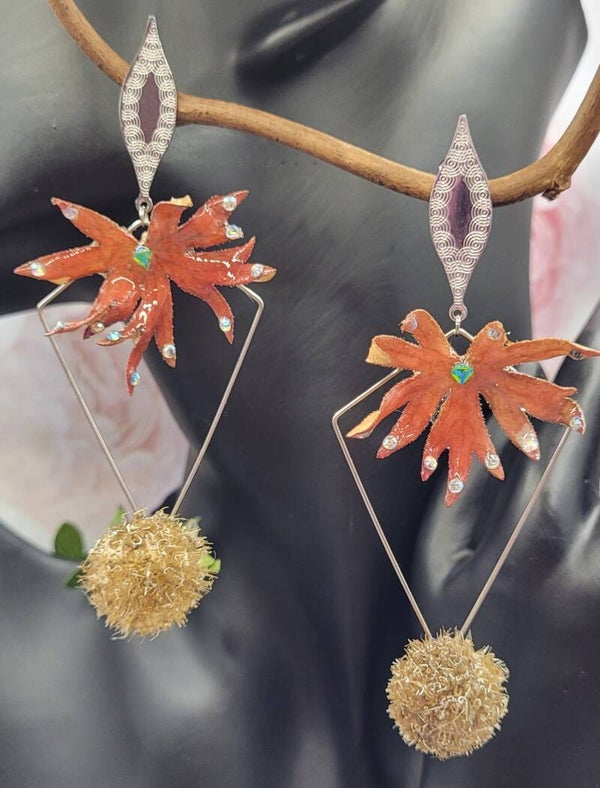 Boucles d'oreilles composées d'un apprêt en forme de losange sur lequel une feuille de vigne vierge rouge est placée sur le haut .