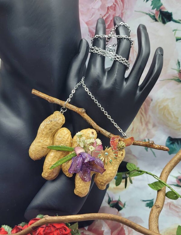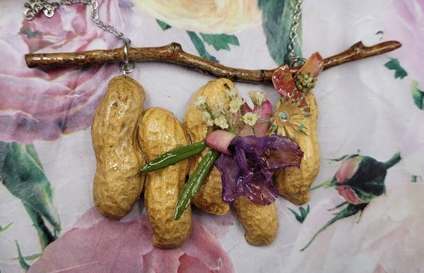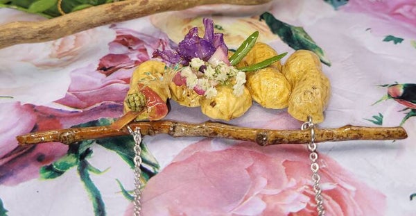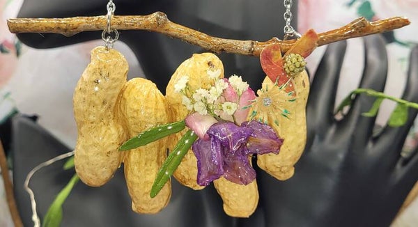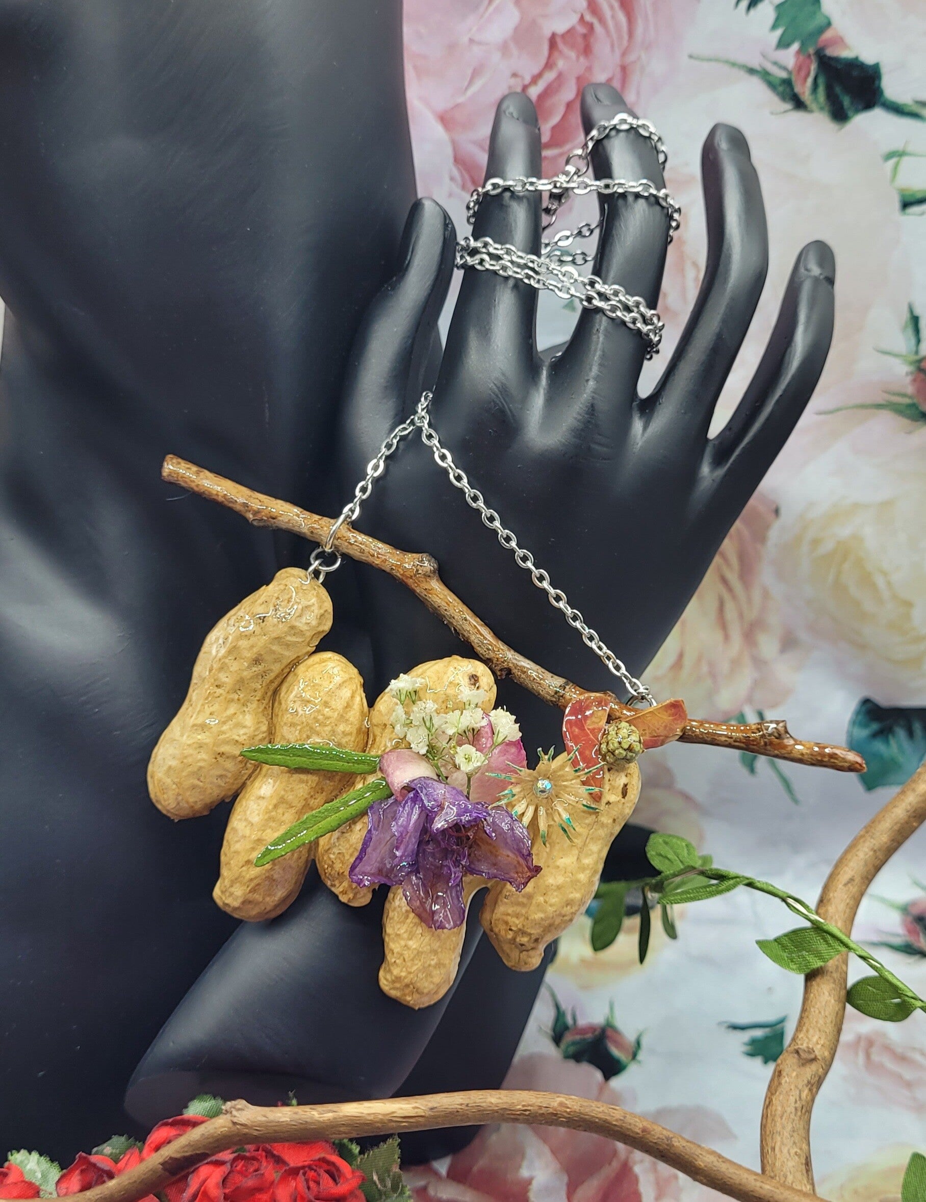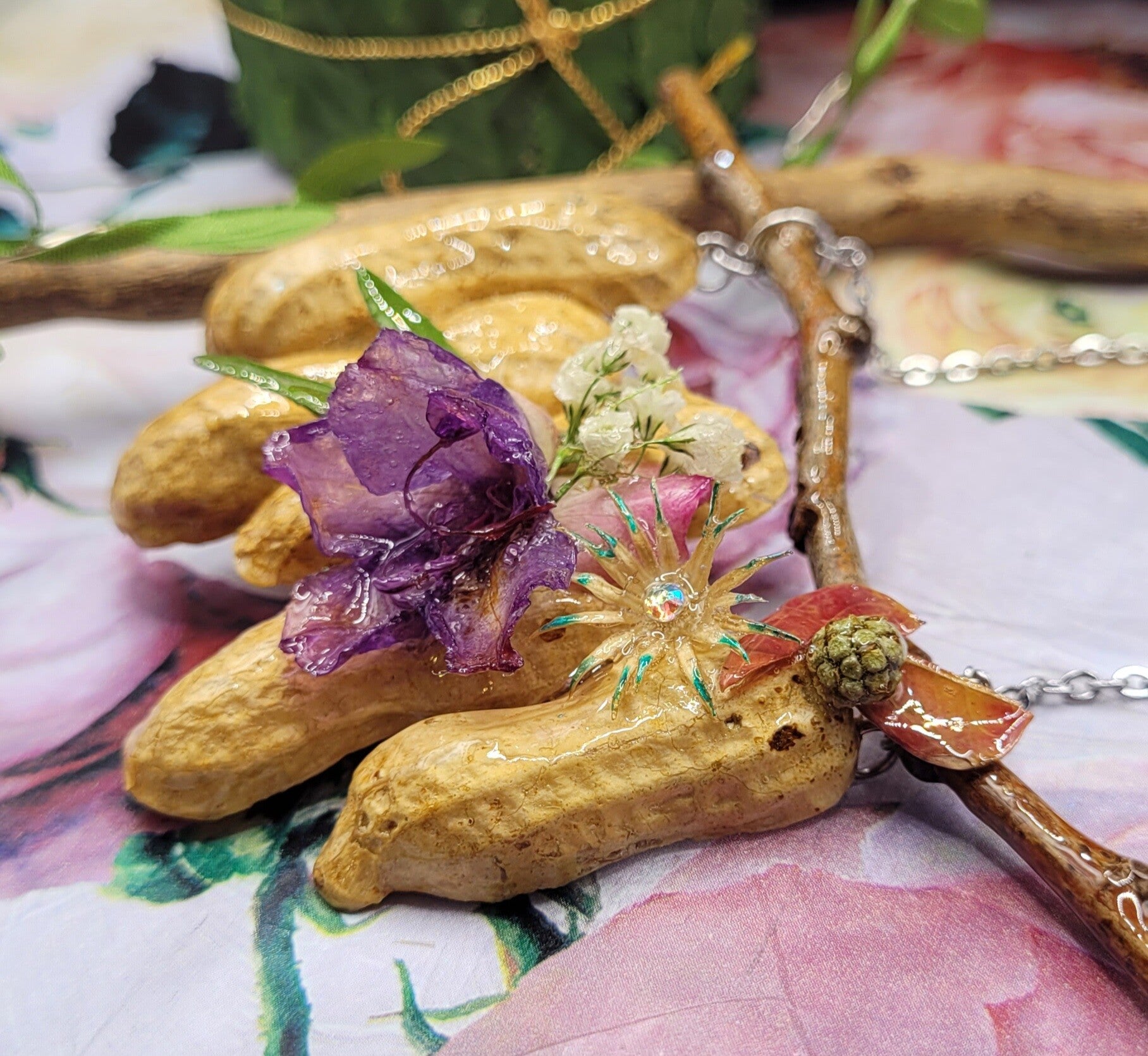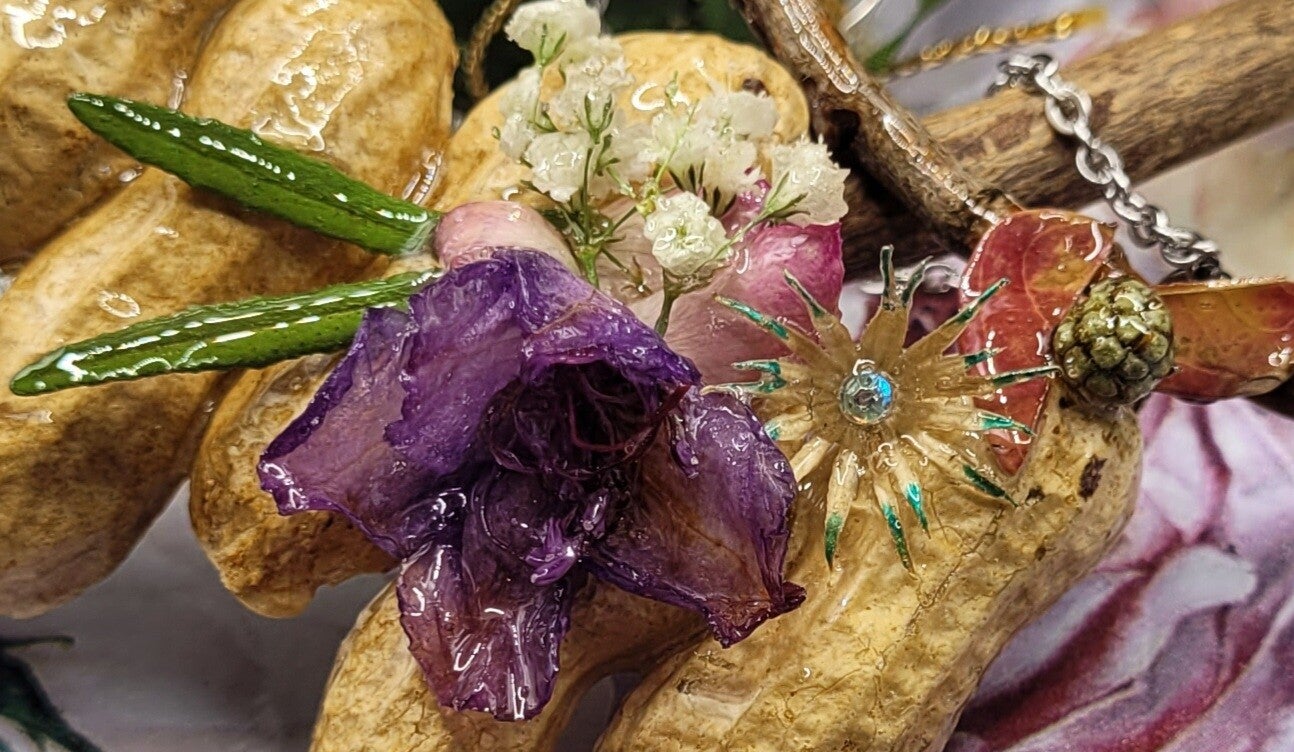 Sur le dessus plusieurs végétaux sont possitionnés : une fleur violette , feuilles vertes allongées , pétales de roses , fleur pompon verte , fleurs blanches , feuilles rouges , fleur beige avec strass au centre
