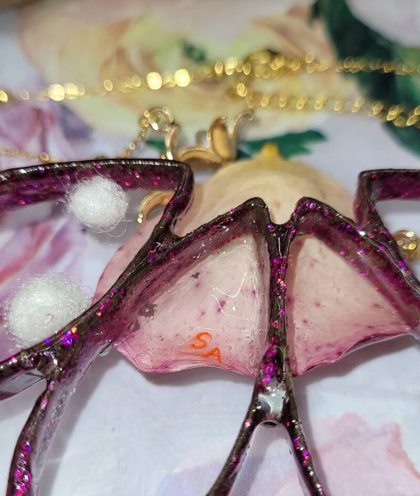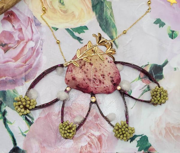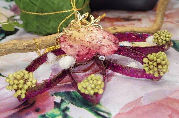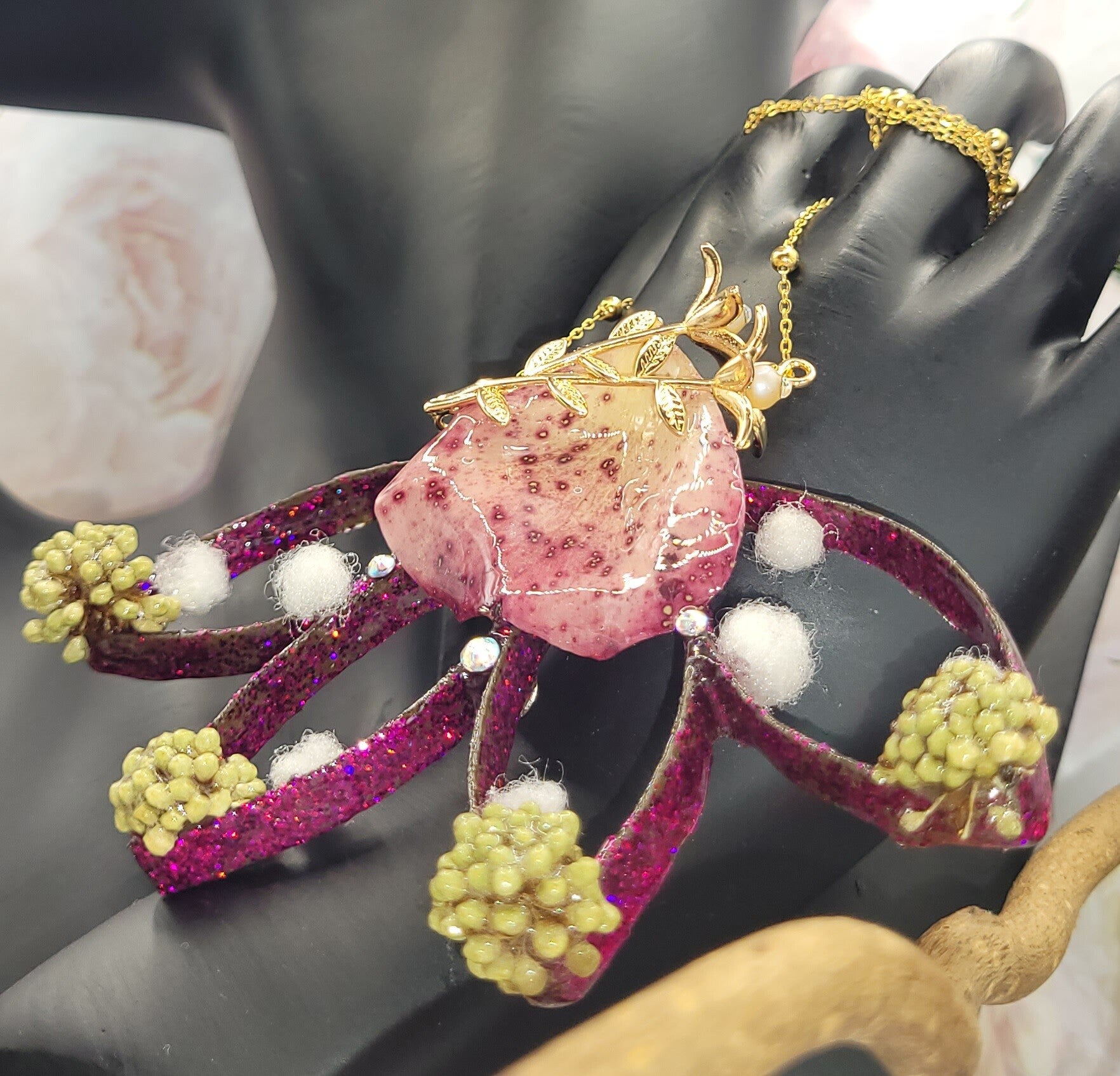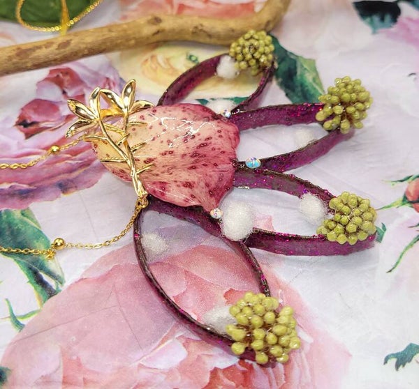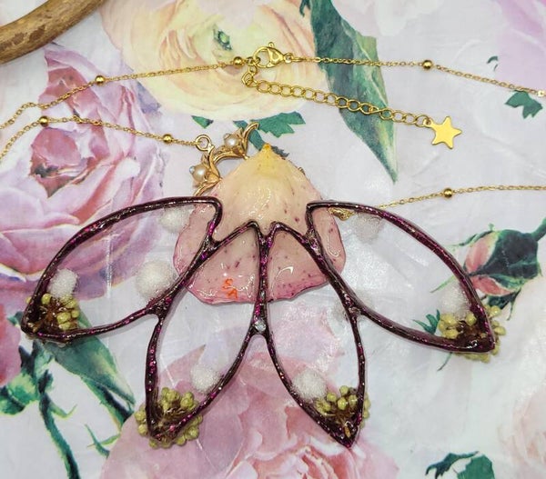 Le tout est scellé dans la résine et monté sur chaîne en maille boule en acier inoxydable doré