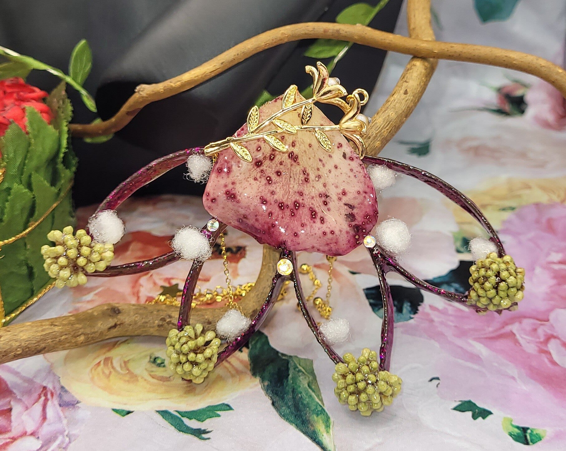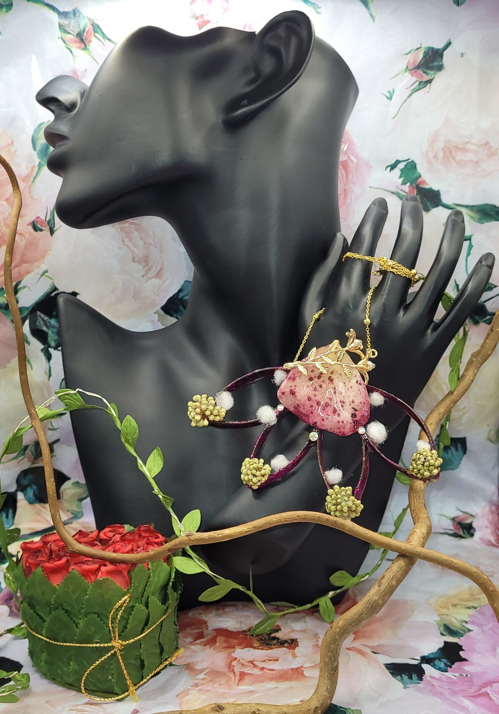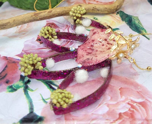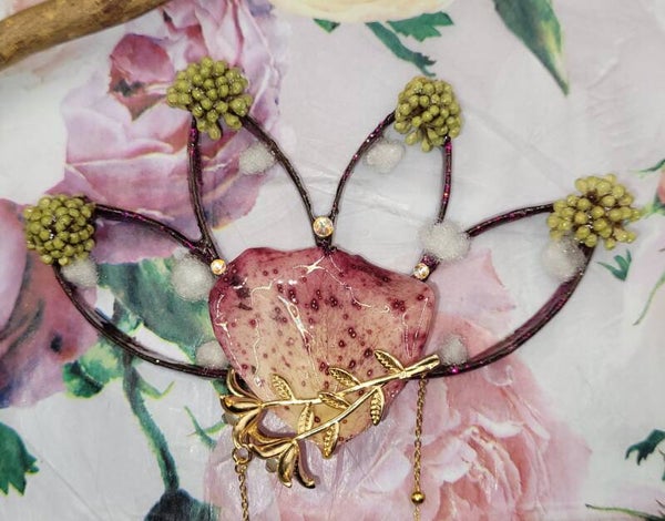 Une belle pétale de rose tachetée naturellement est placée en haut de cette belle composition avec un joli apprêt 3D doré en forme de fleur avec perles et strass au coeur