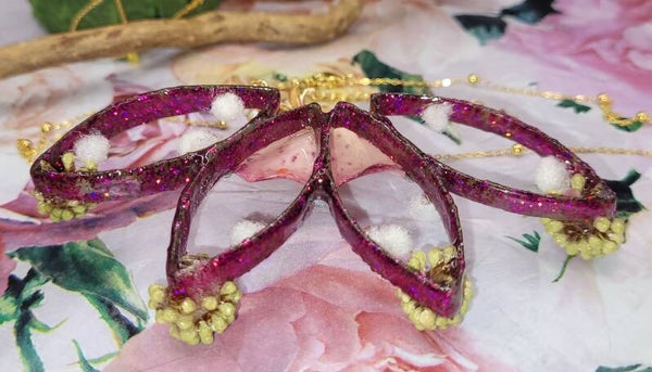 Collier composé de 4 anneaux formés en amandes qui proviennent d'un tube carton de rouleau sopalin . Ils sont entièrement habillés de paillettes fuschia