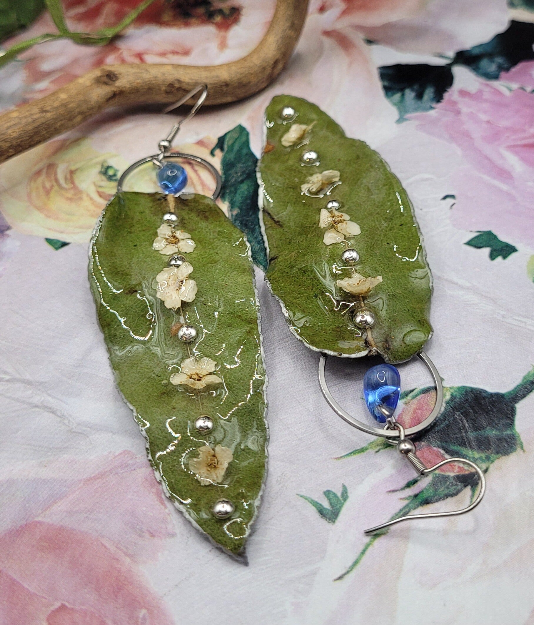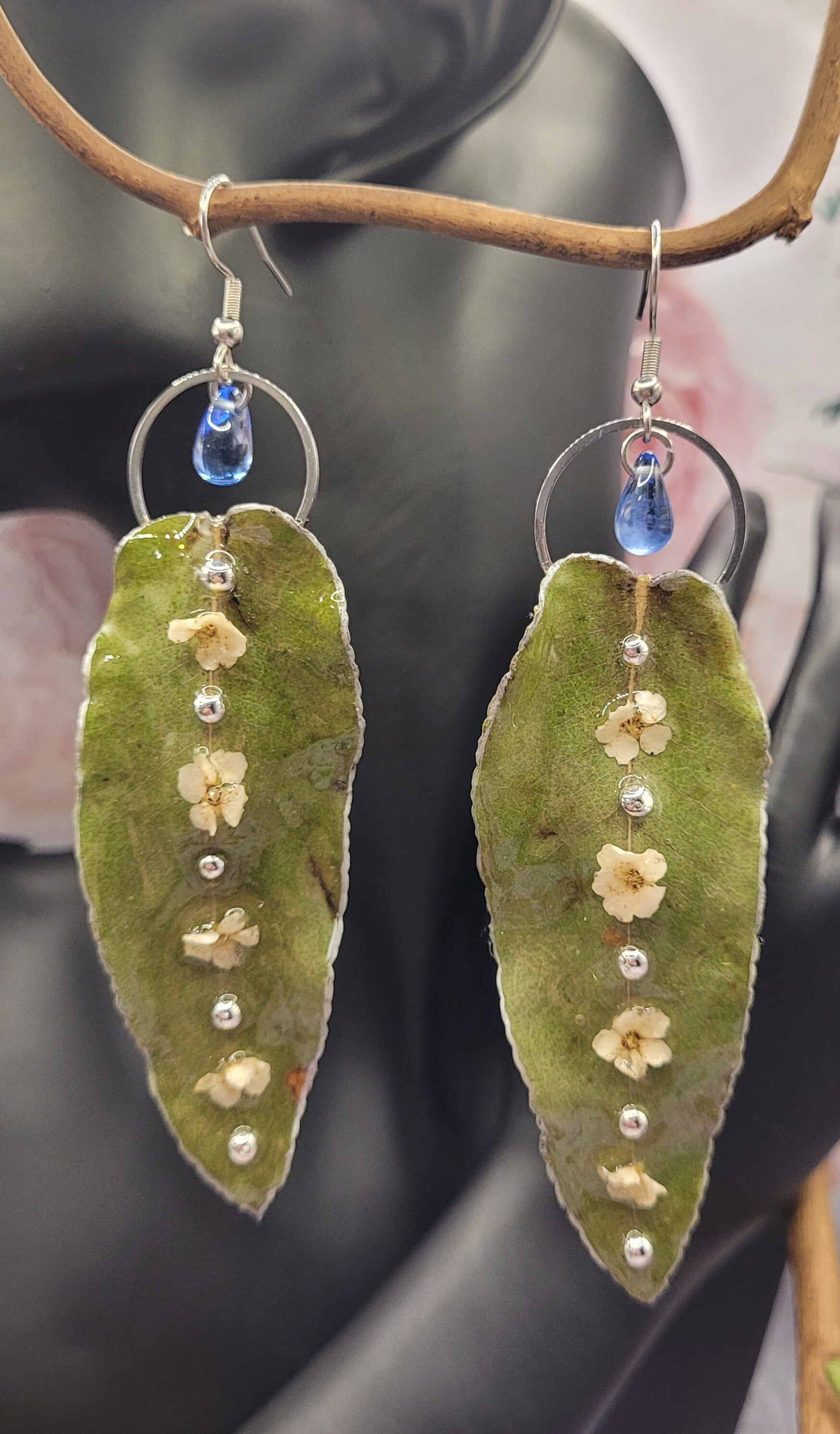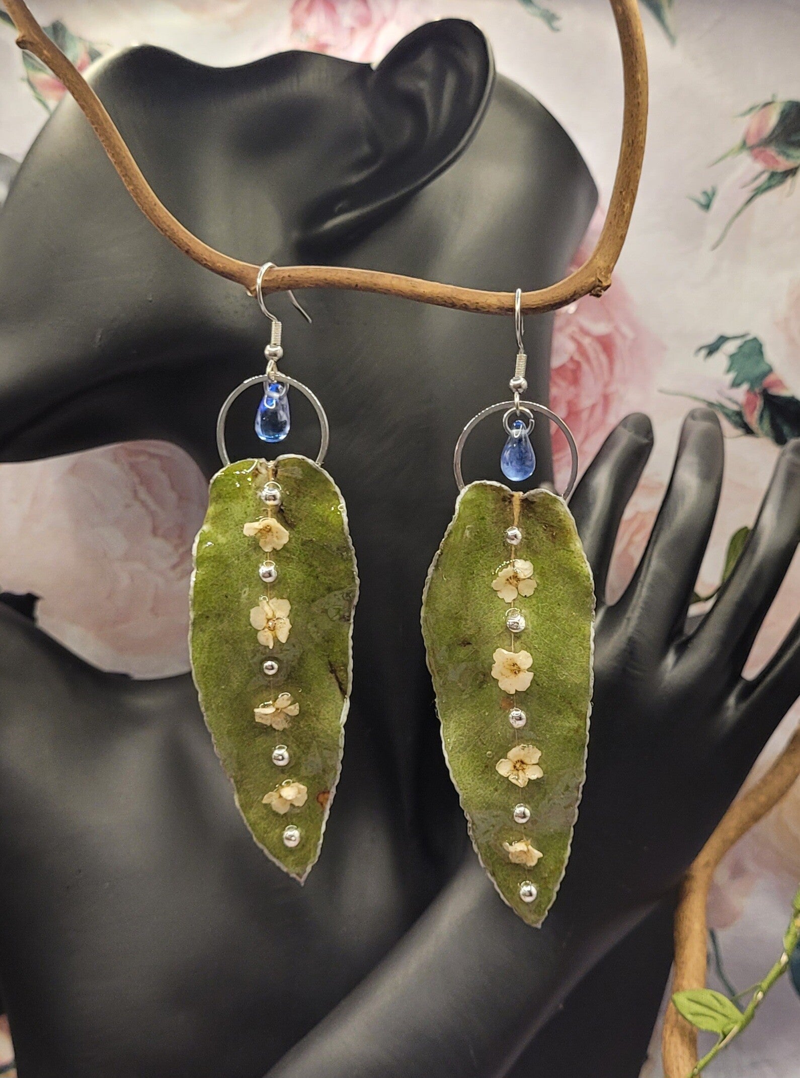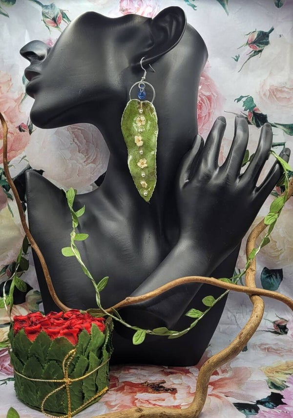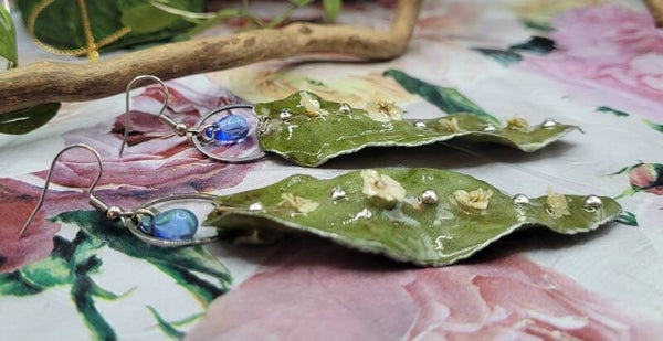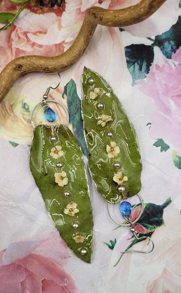 Boucles d'oreilles composées de cette longue feuille de couleur verte sur laquelle est posée 4 petites fleurs blanches et 5 demis perles argentées placées à la suite sur la nervure centrale