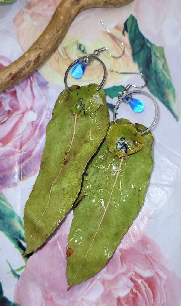 Un anneau argenté est ajouté sur le haut de la feuille ainsi qu'une perle bleue transparente en forme de goutte d'eau placée en pampille dans ce même anneau