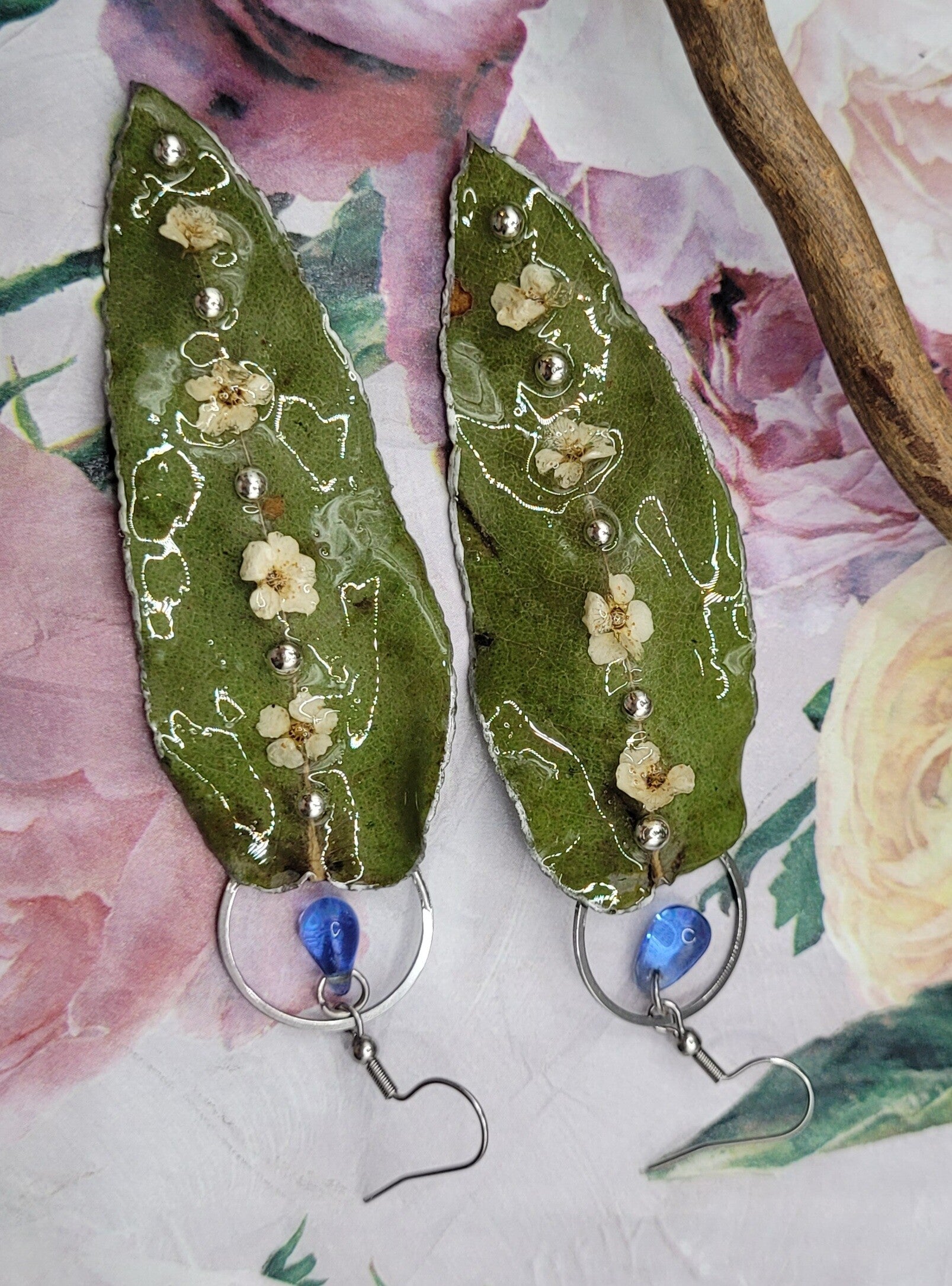 Le tout est scellé dans la résine et monté sur boucles d'oreilles en acier inoxydable