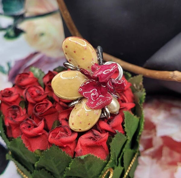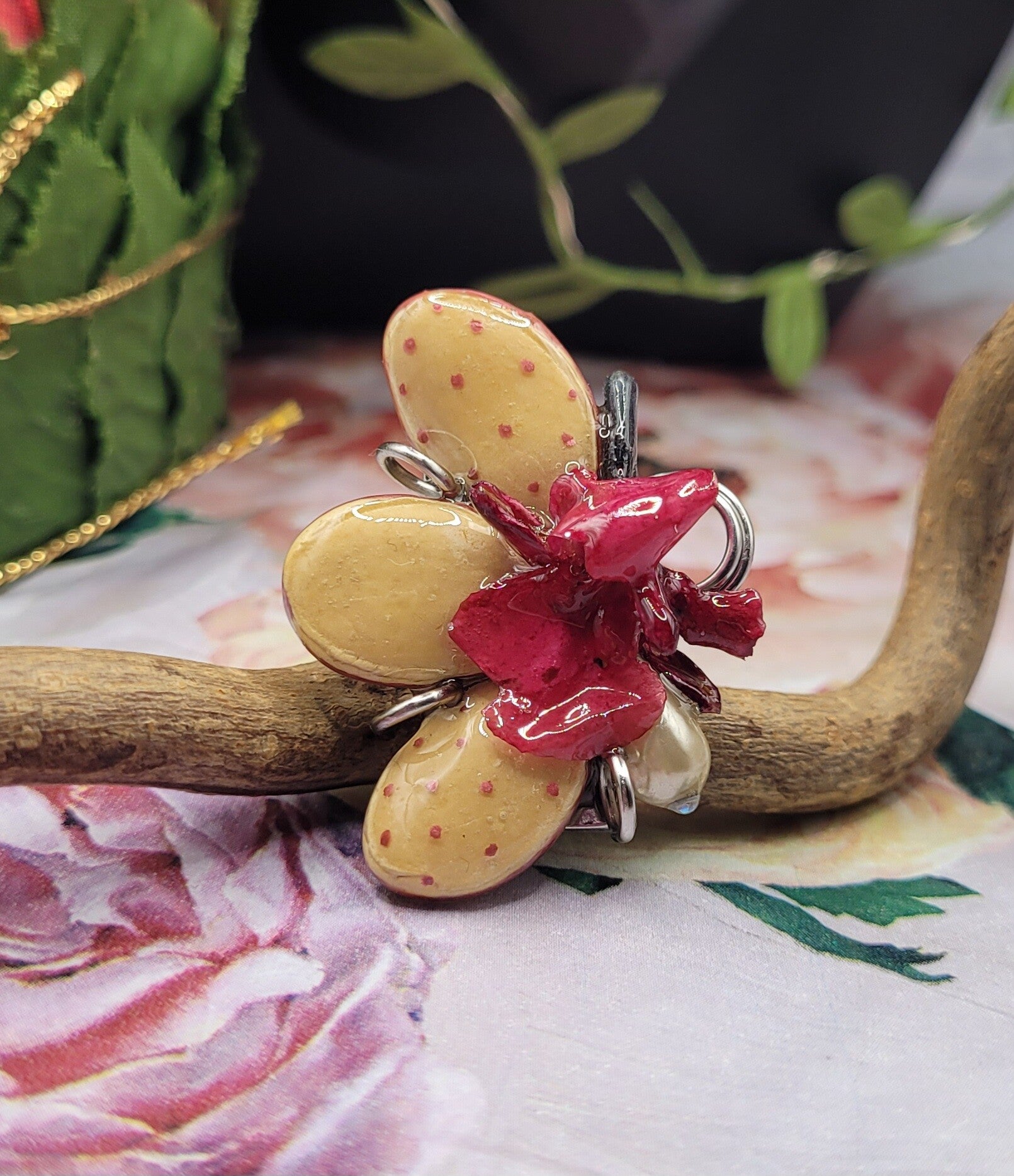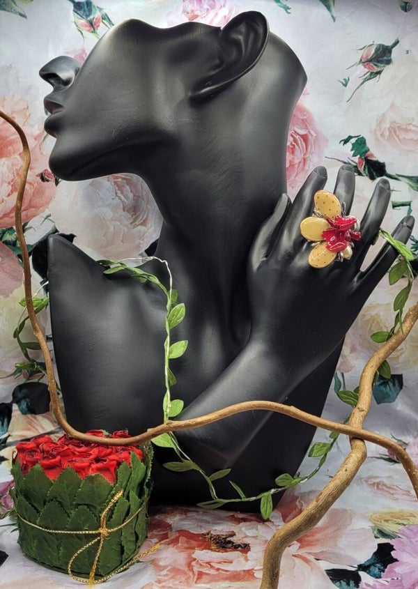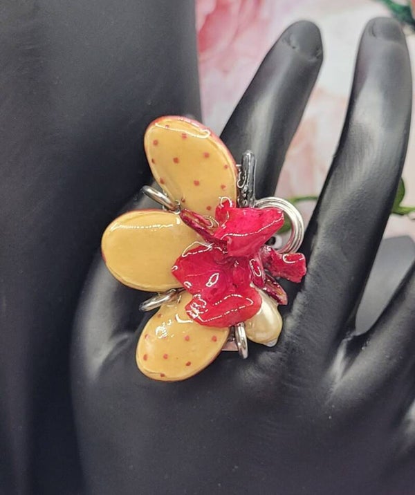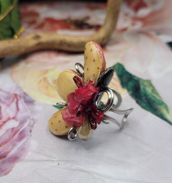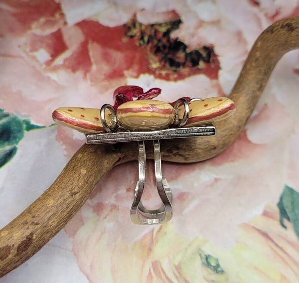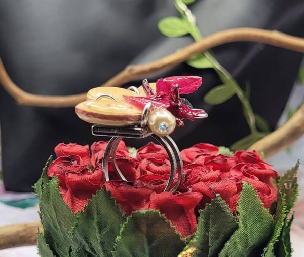 Bague composée de 3 graines de potimarron avec des contours tracés en rouge avec des petits points dessinés sur le dessus de la même couleur