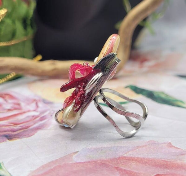 Le tout est scellé dans la résine et monté sur bague avec plateau rectangulaire en acier inoxydable