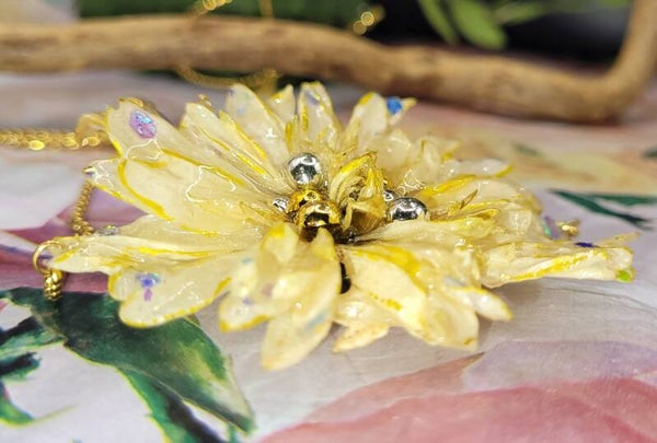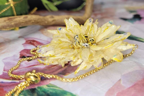 Le tout est scellé dans la résine et monté sur un bracelet chaîne en acier inoxydable doré