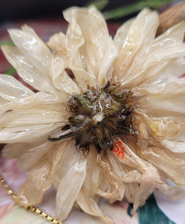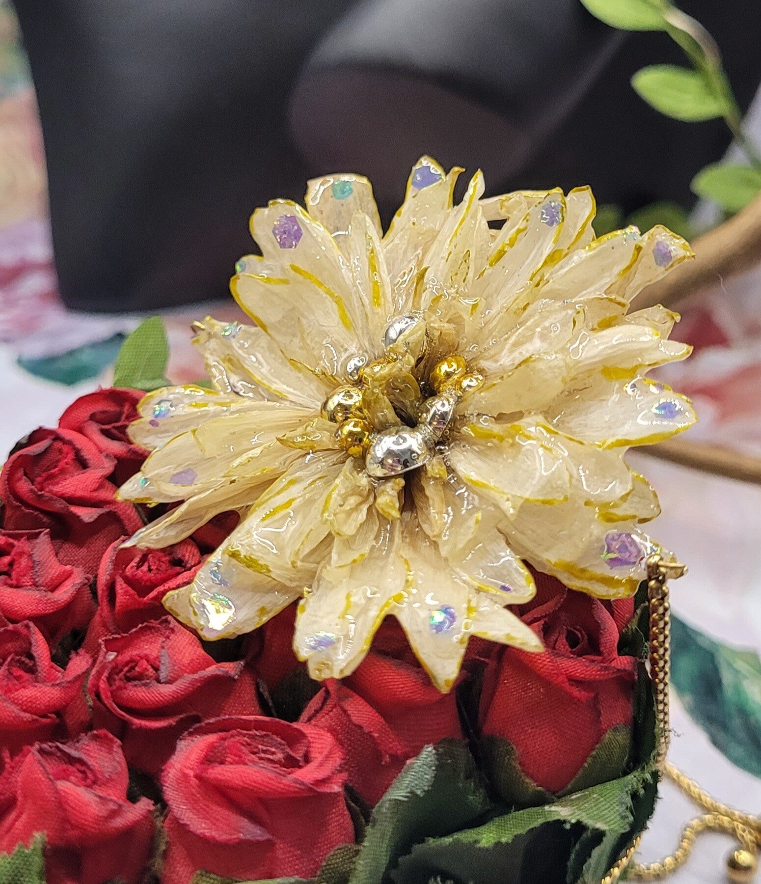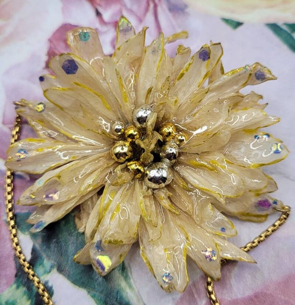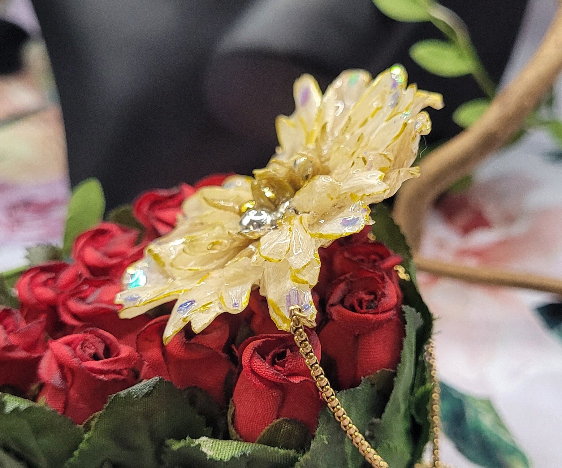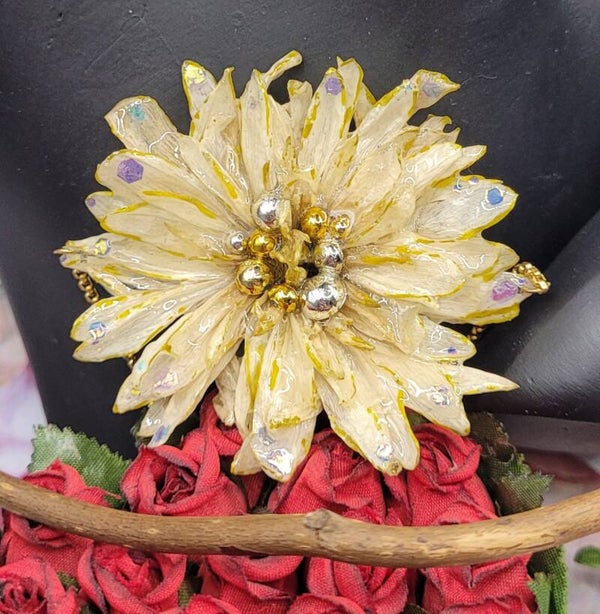 Plusieurs demis perles argentées et dorées , de différentes tailles sont ajoutées au coeur de la fleur