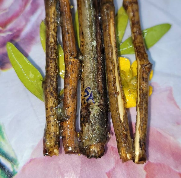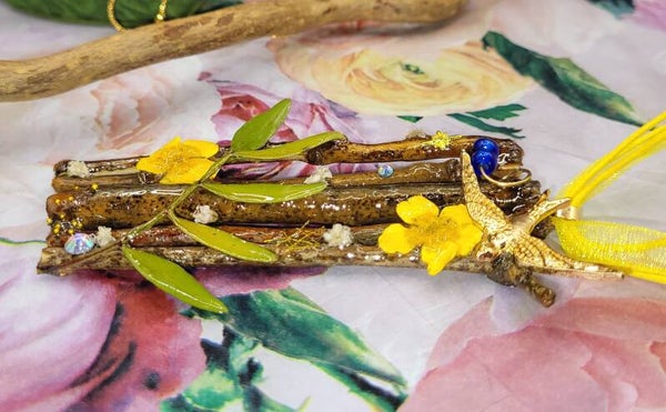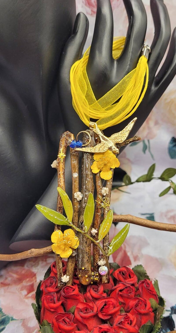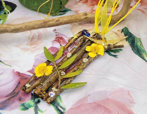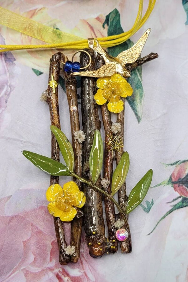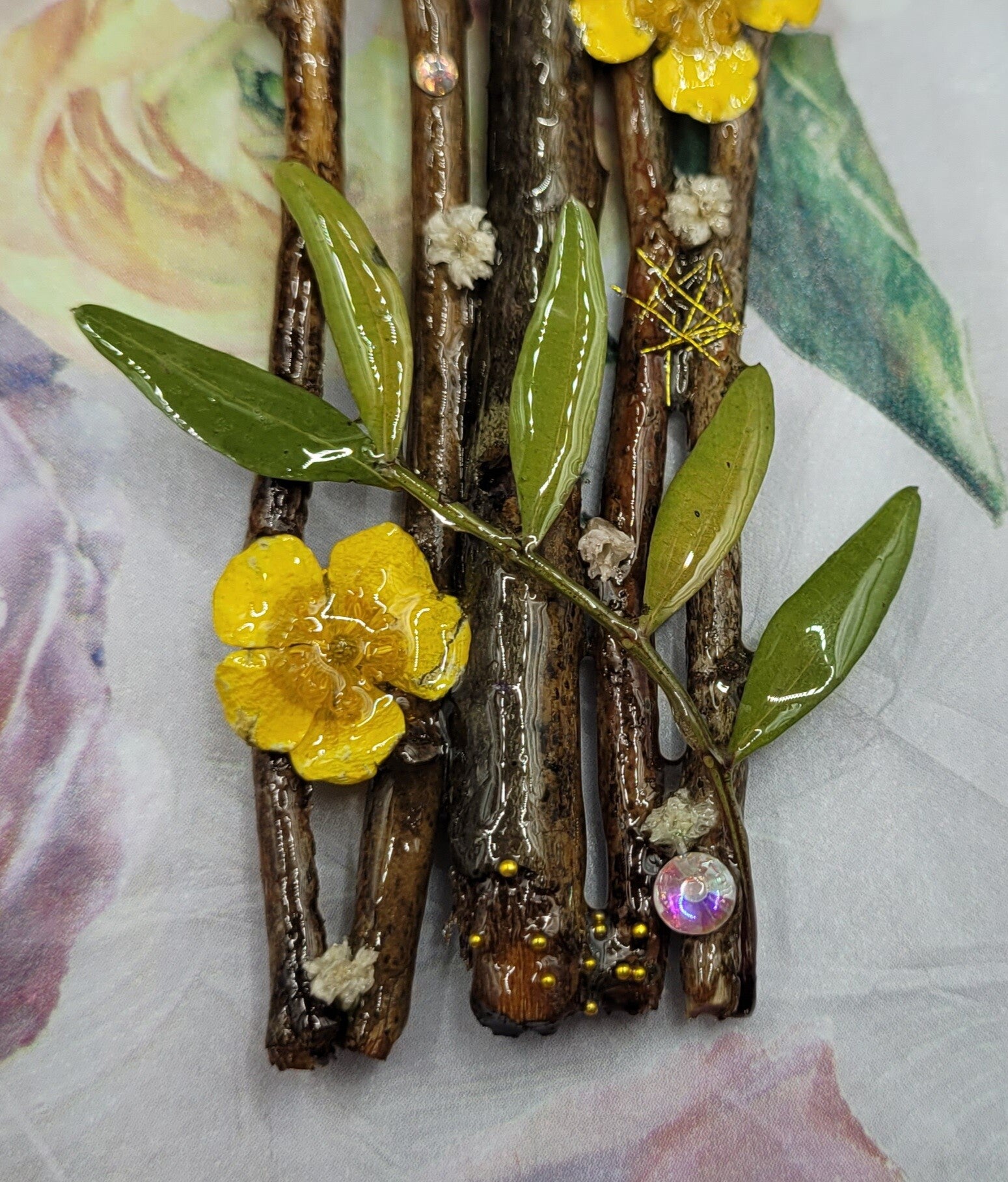 2 jolies petites fleurs de couleur jaune agrémentent ces branches , sur le haut et le bas