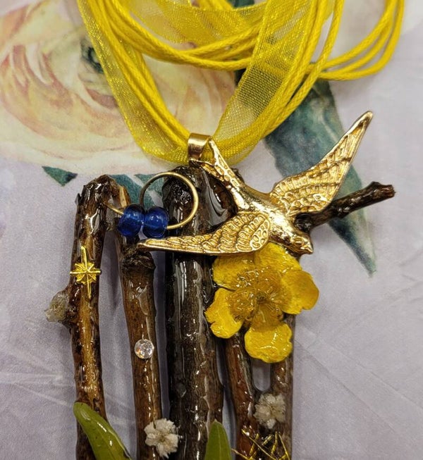 Le tout est scellé dans la résine et monté sur un collier cordon ruban de couleur jaune
