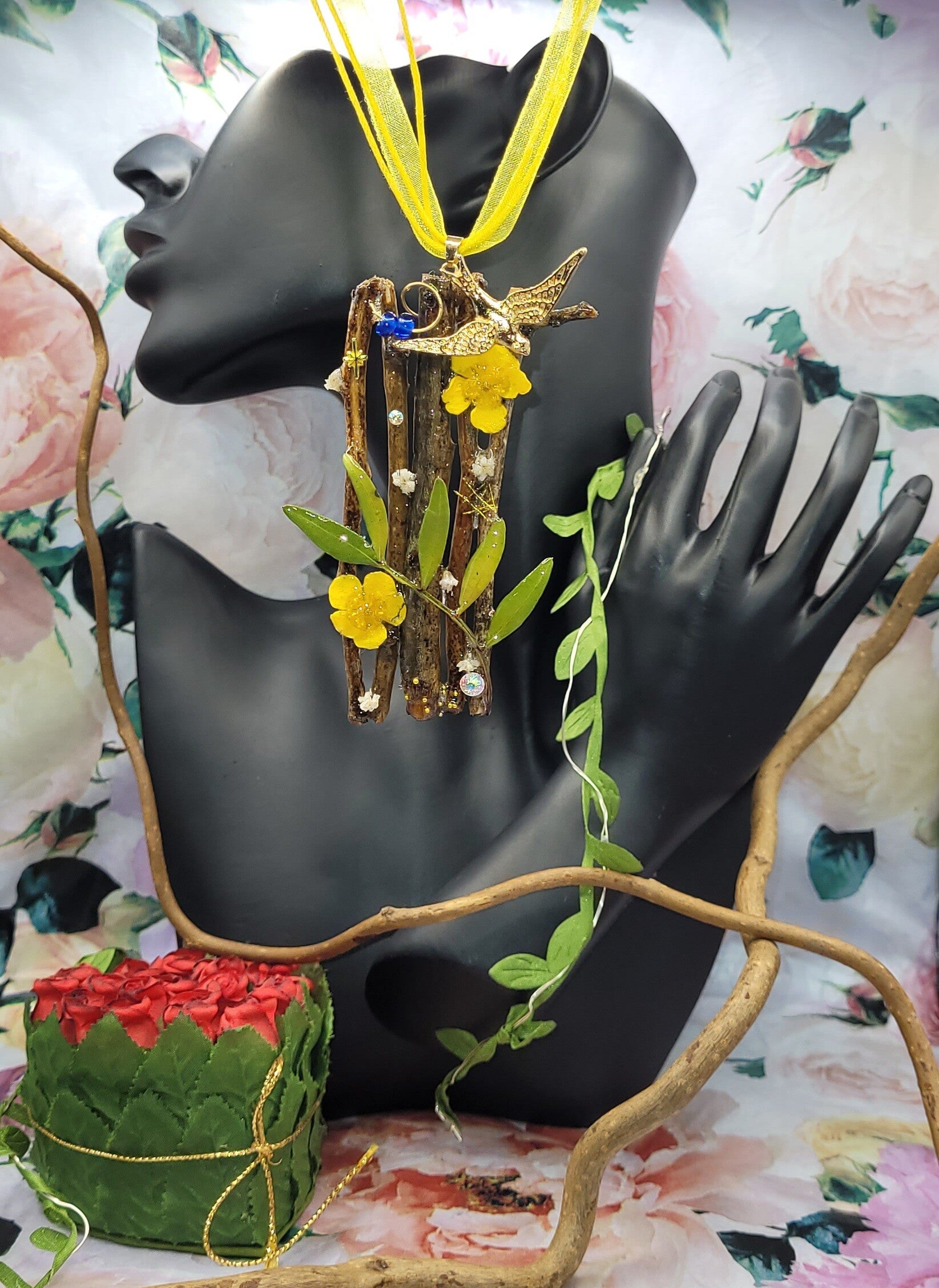 Collier composé de 5 branches de bois placées à la suite des unes et des autres