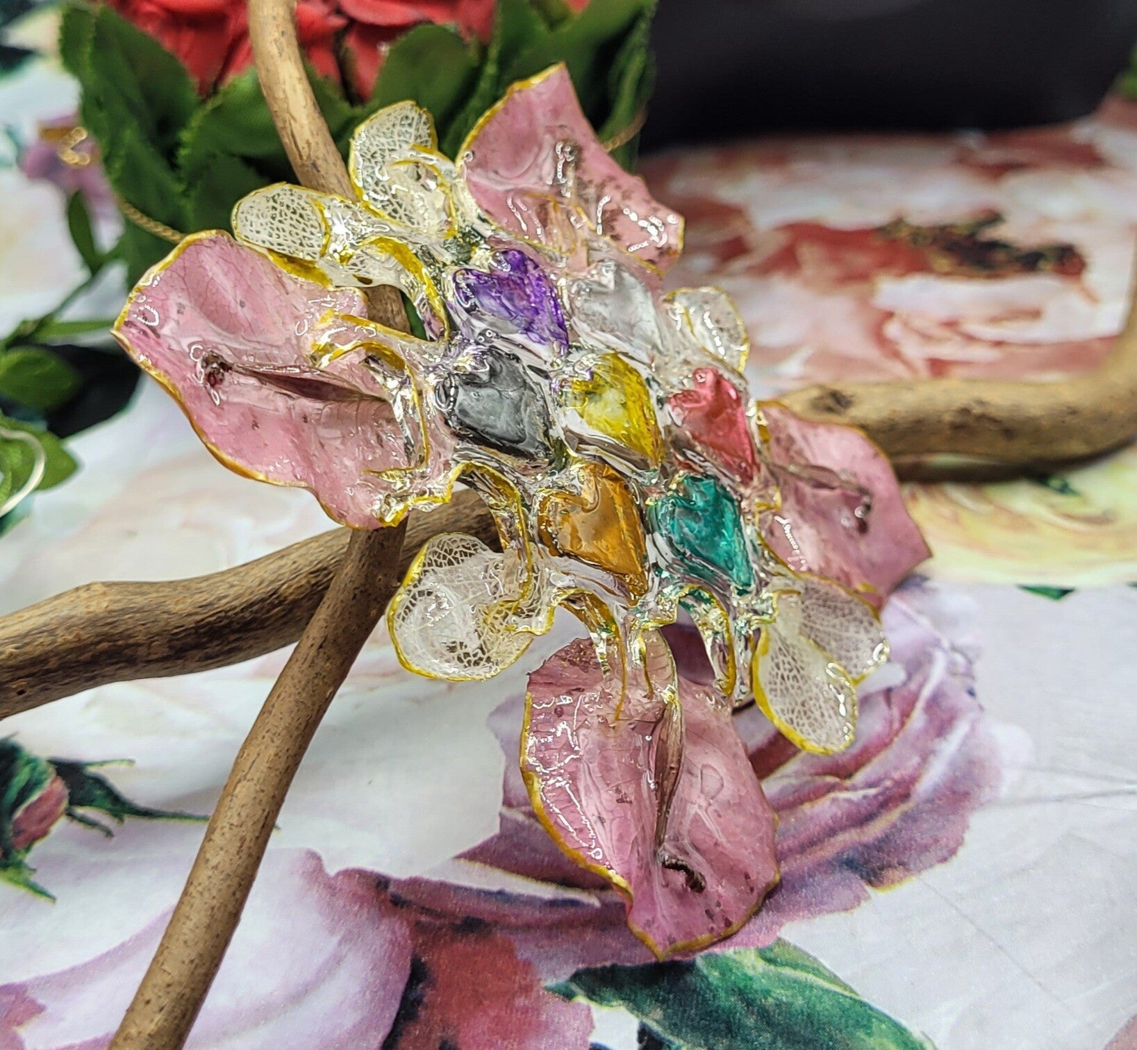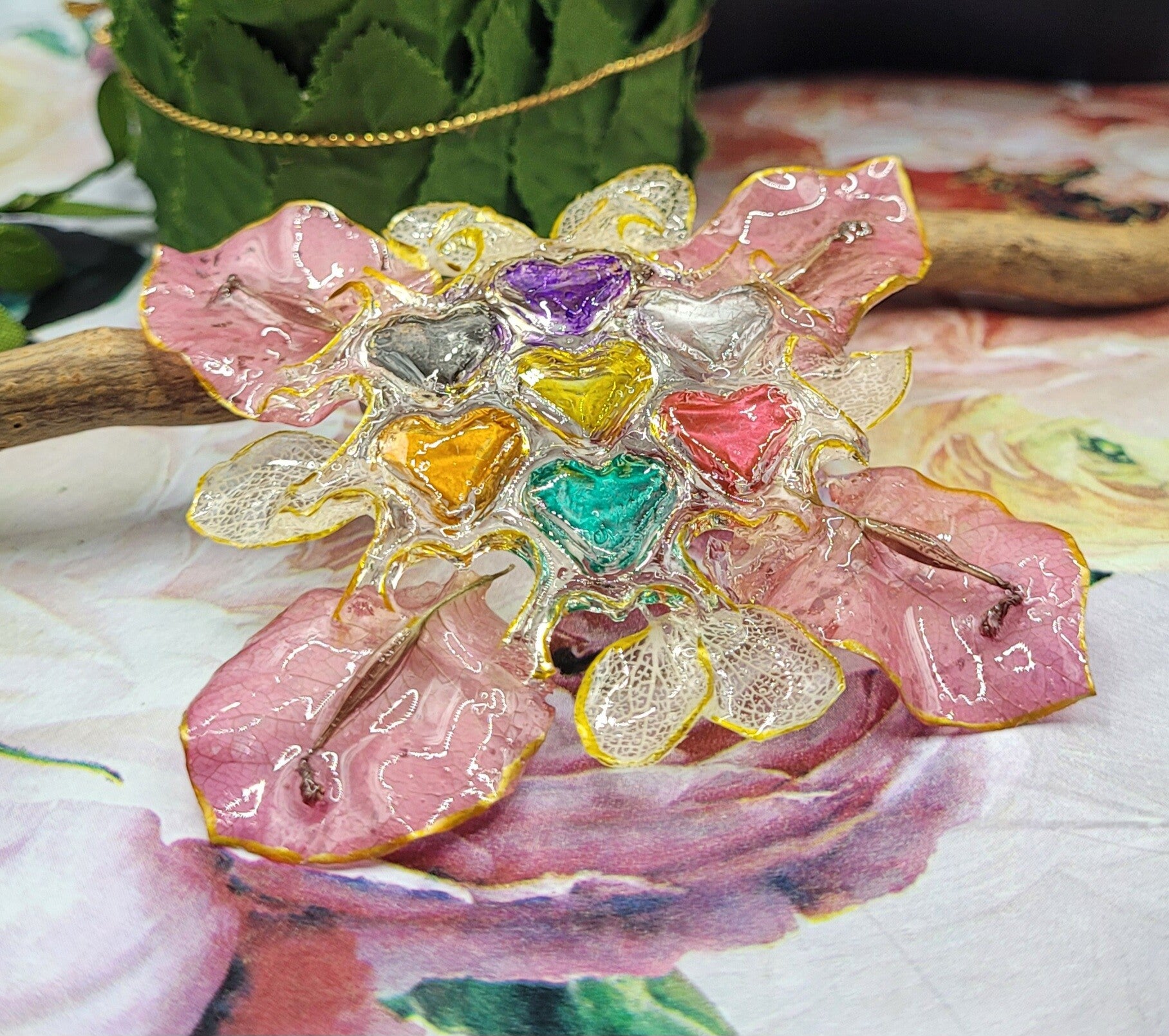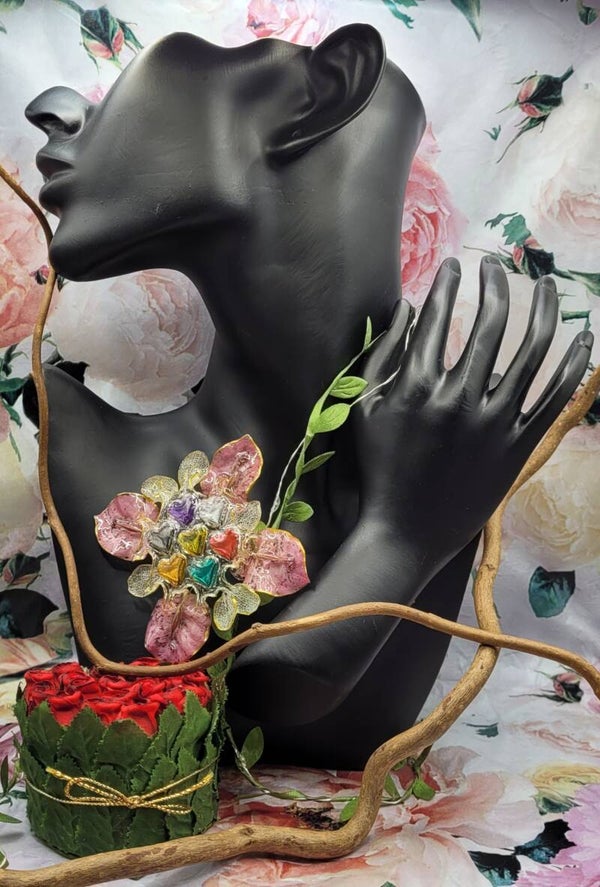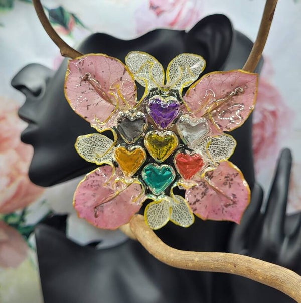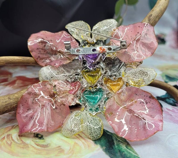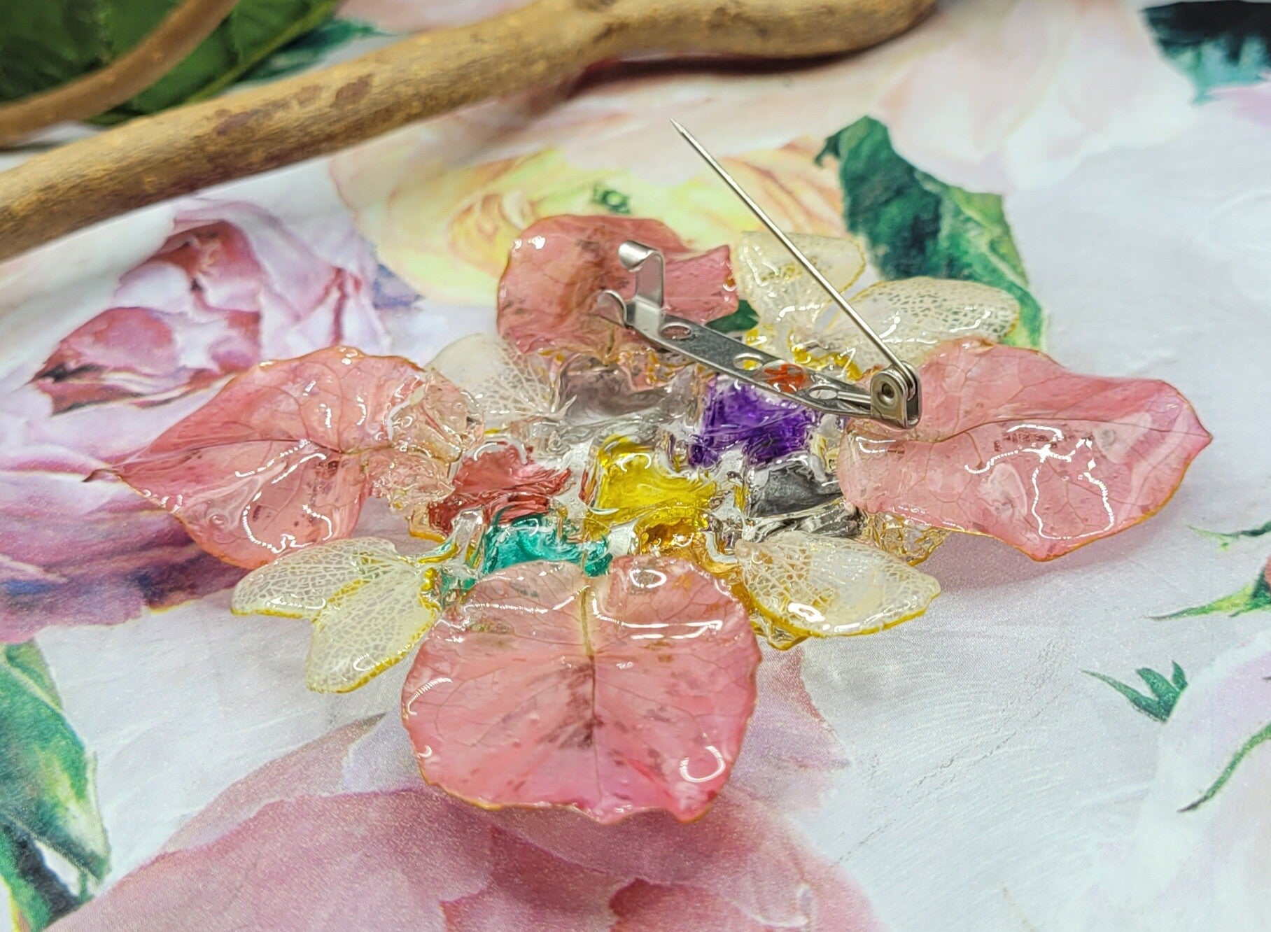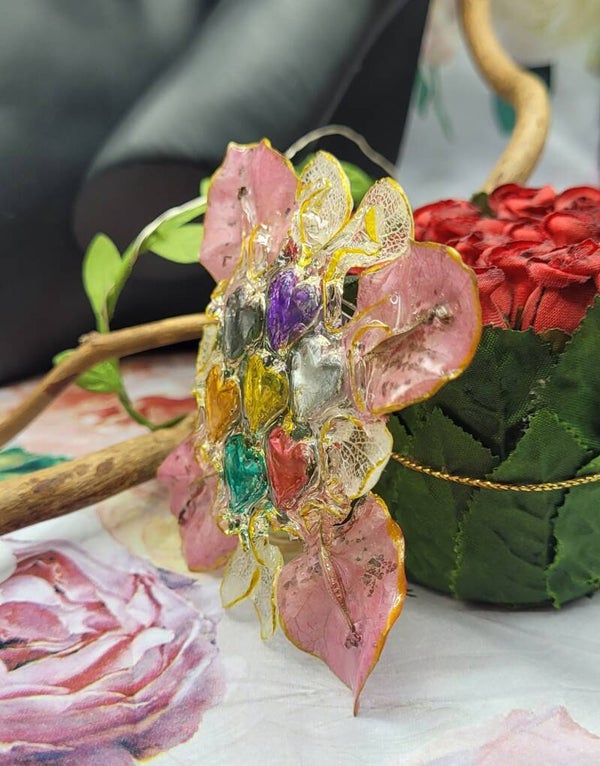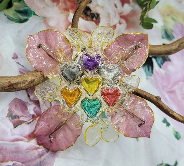 Broche composée de 4 pétales de couleur rose provenant du bougainviller , et de 6 pétales de fleurs blanches où l'on aperçoit bien les nervures de chaques pétales