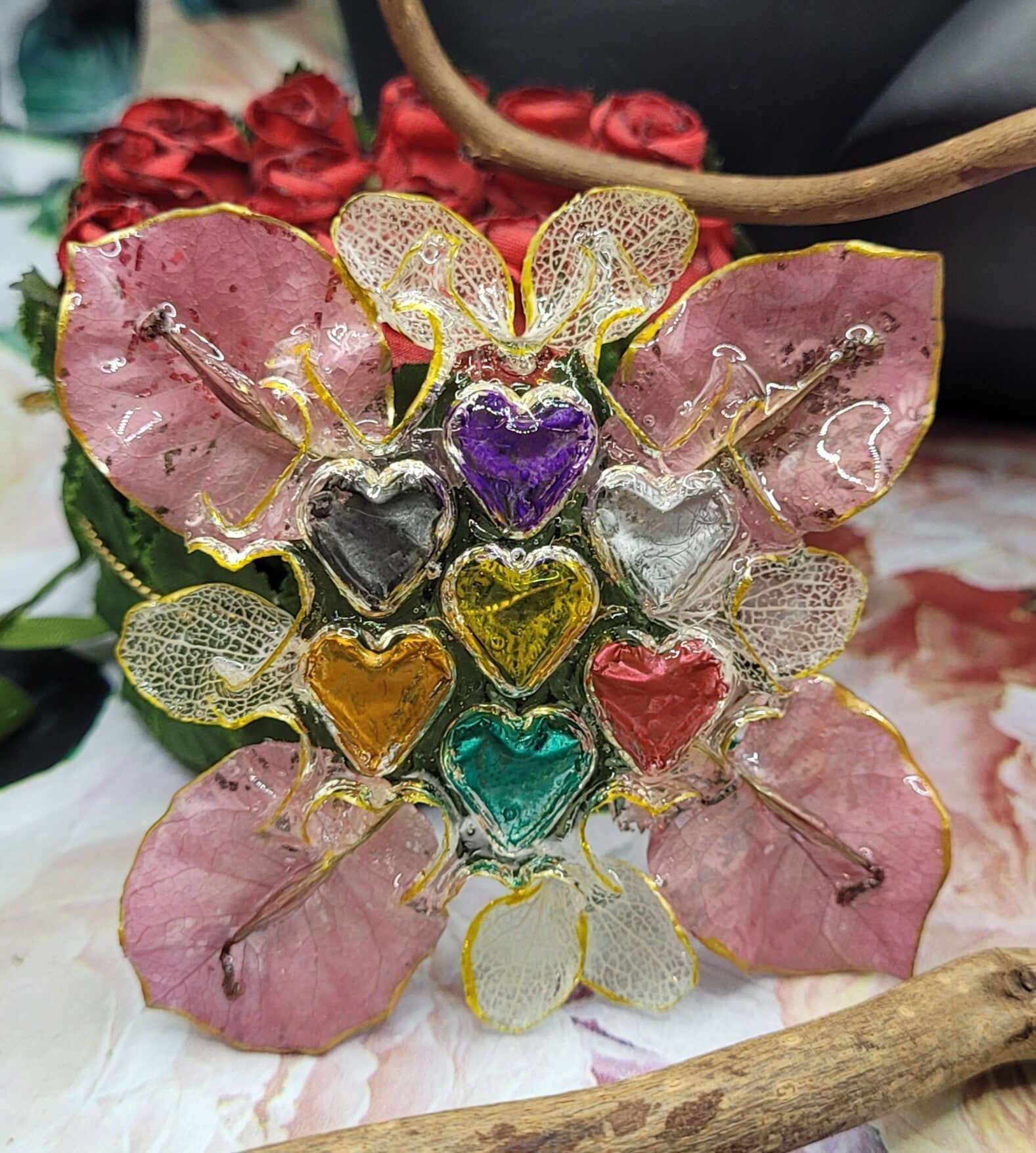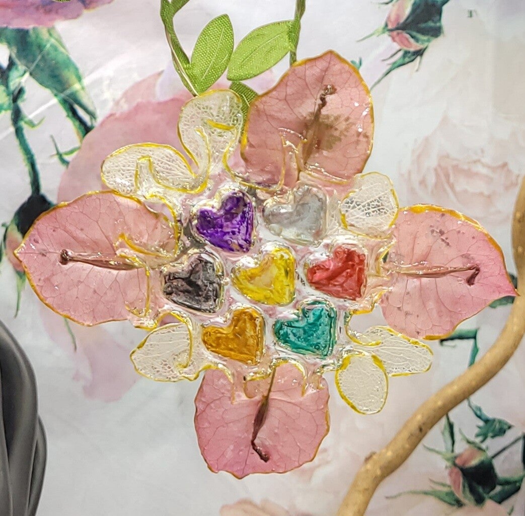 Au centre se trouve de la résine qui a été moulé sur du papier bulle , les bulles sont en forme de cœur .