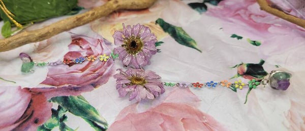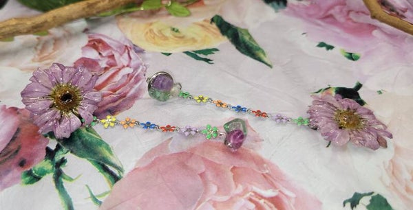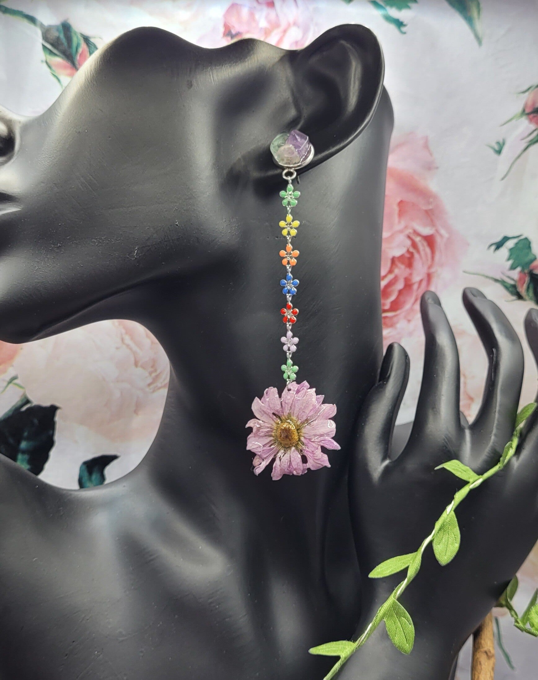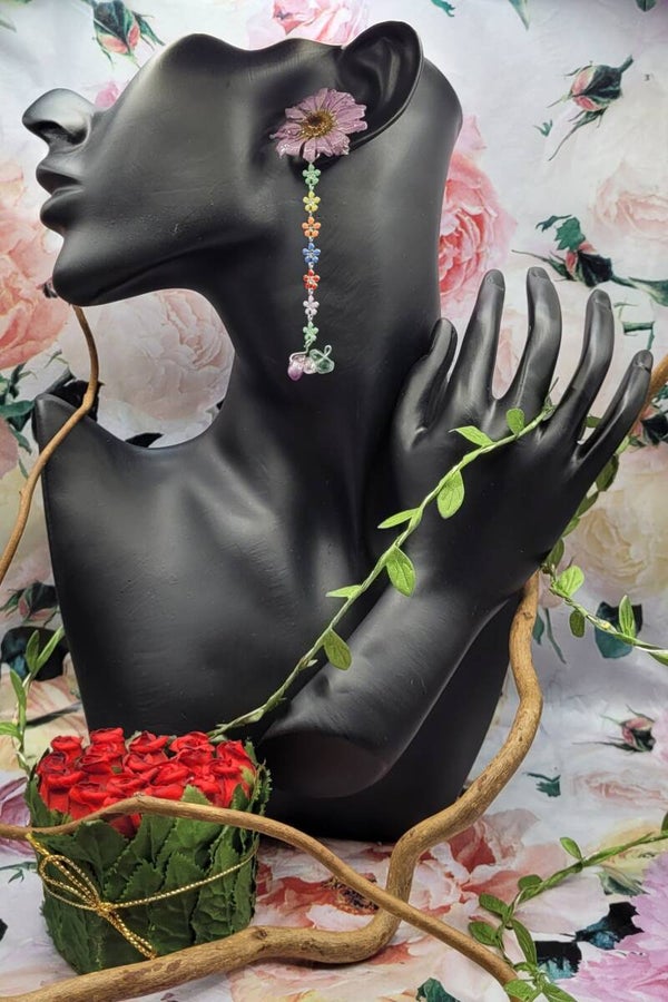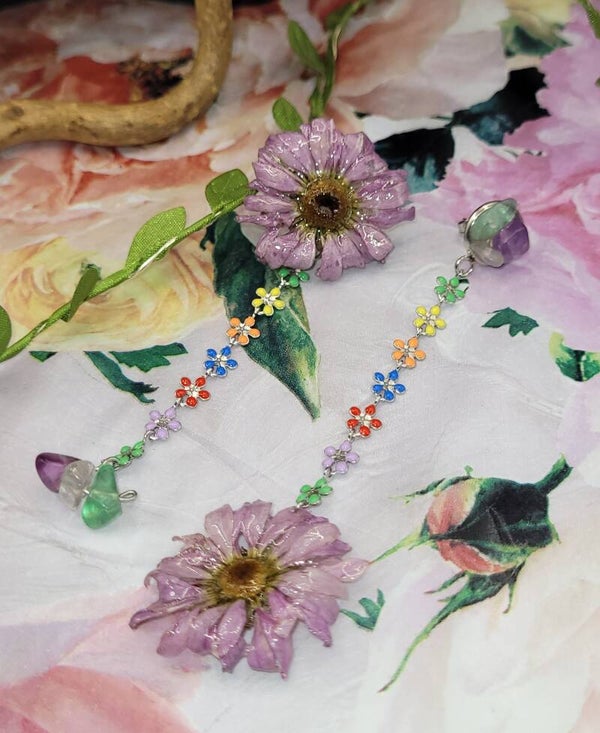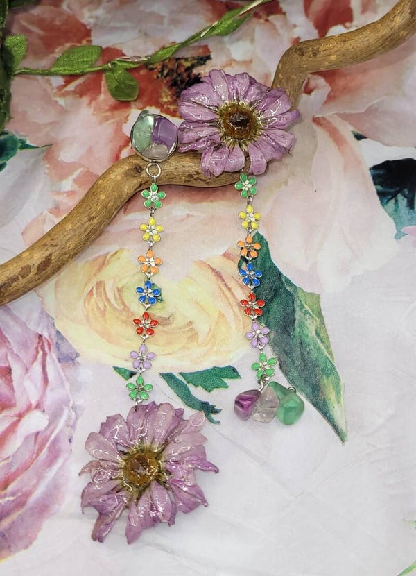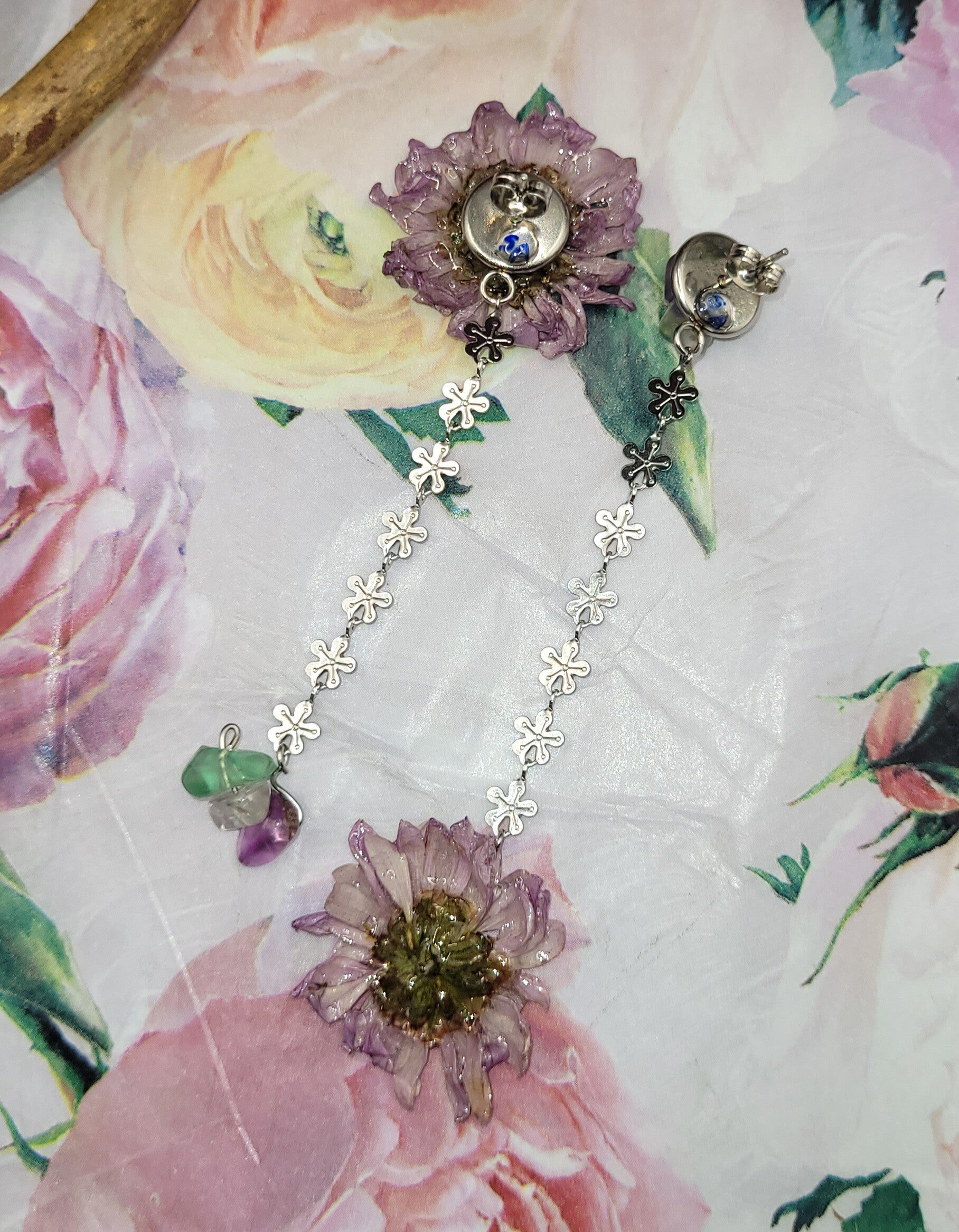 Boucles d'oreilles composées d'une fleur de marguerite de couleur violette , acompagnée d'une chaînette en maille petite marguerite multicolor , et de 3 perles en pierres transparantes : 1 verte , 1 blanche et 1 violette