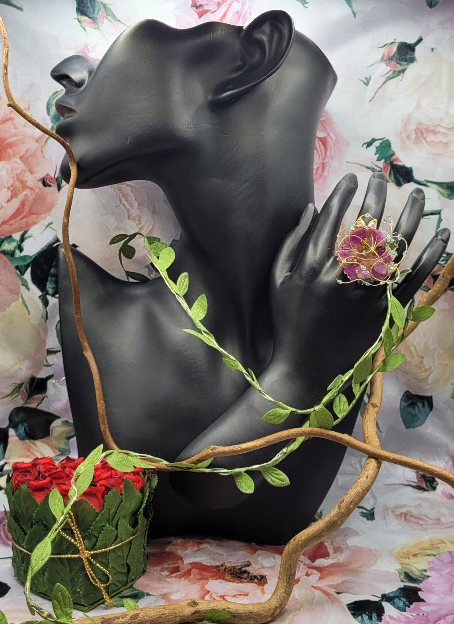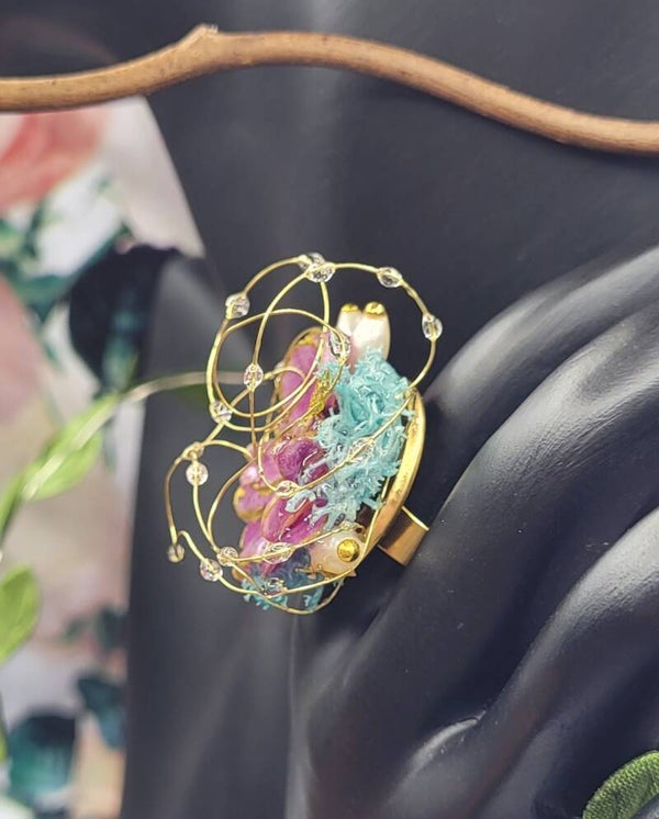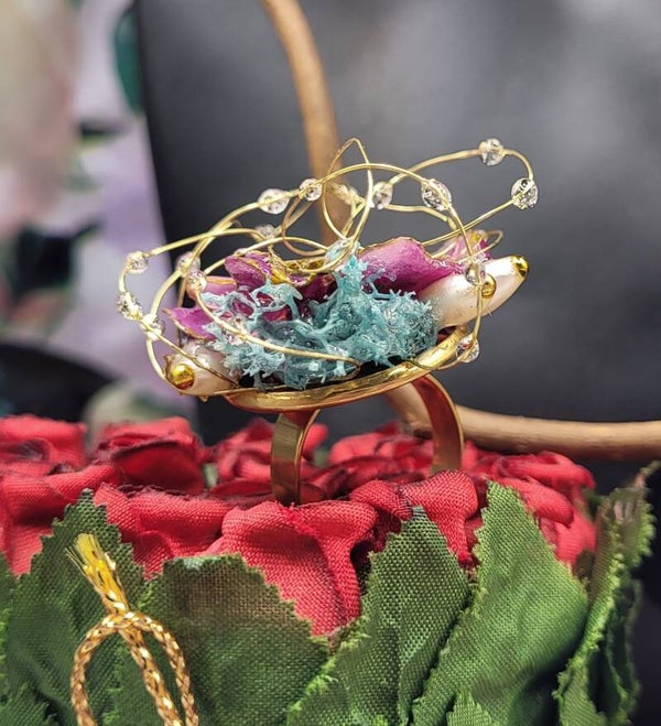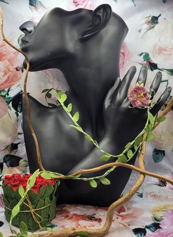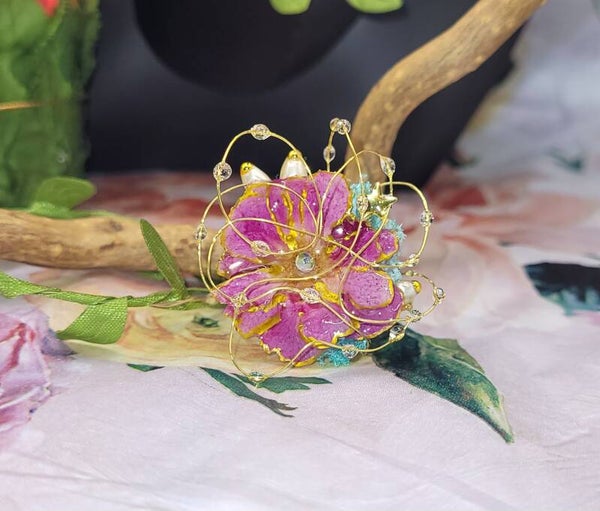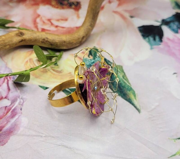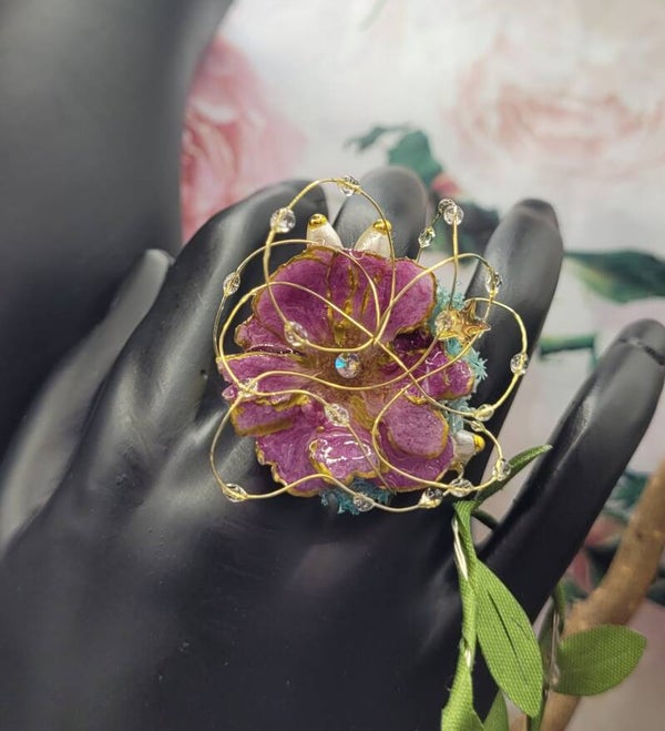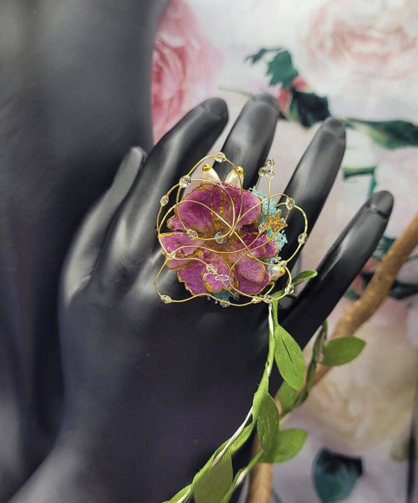 Bague composée d'une jolie fleur de rosier de couleur rose , avec un strass au coeur et aux contours tracé en doré