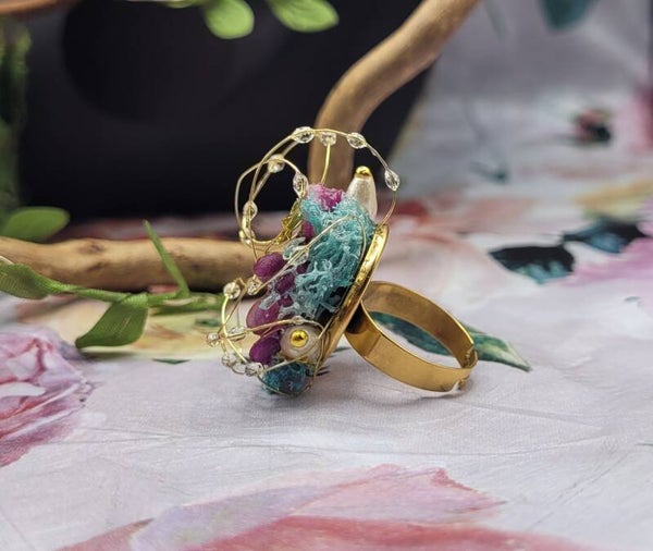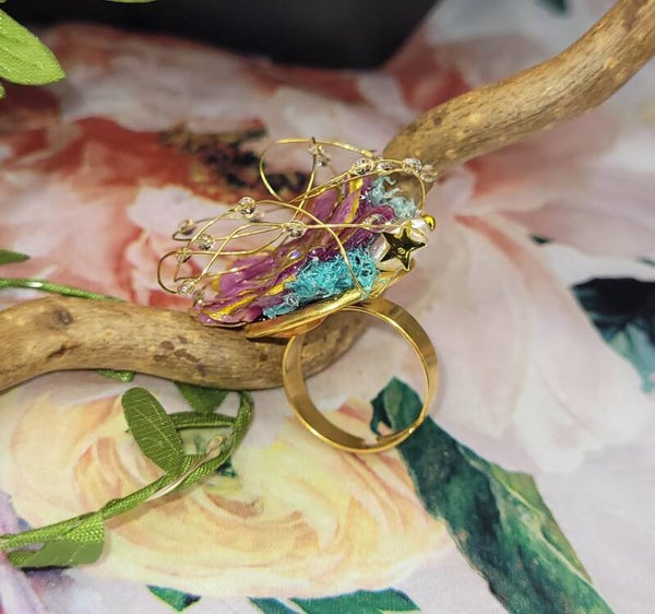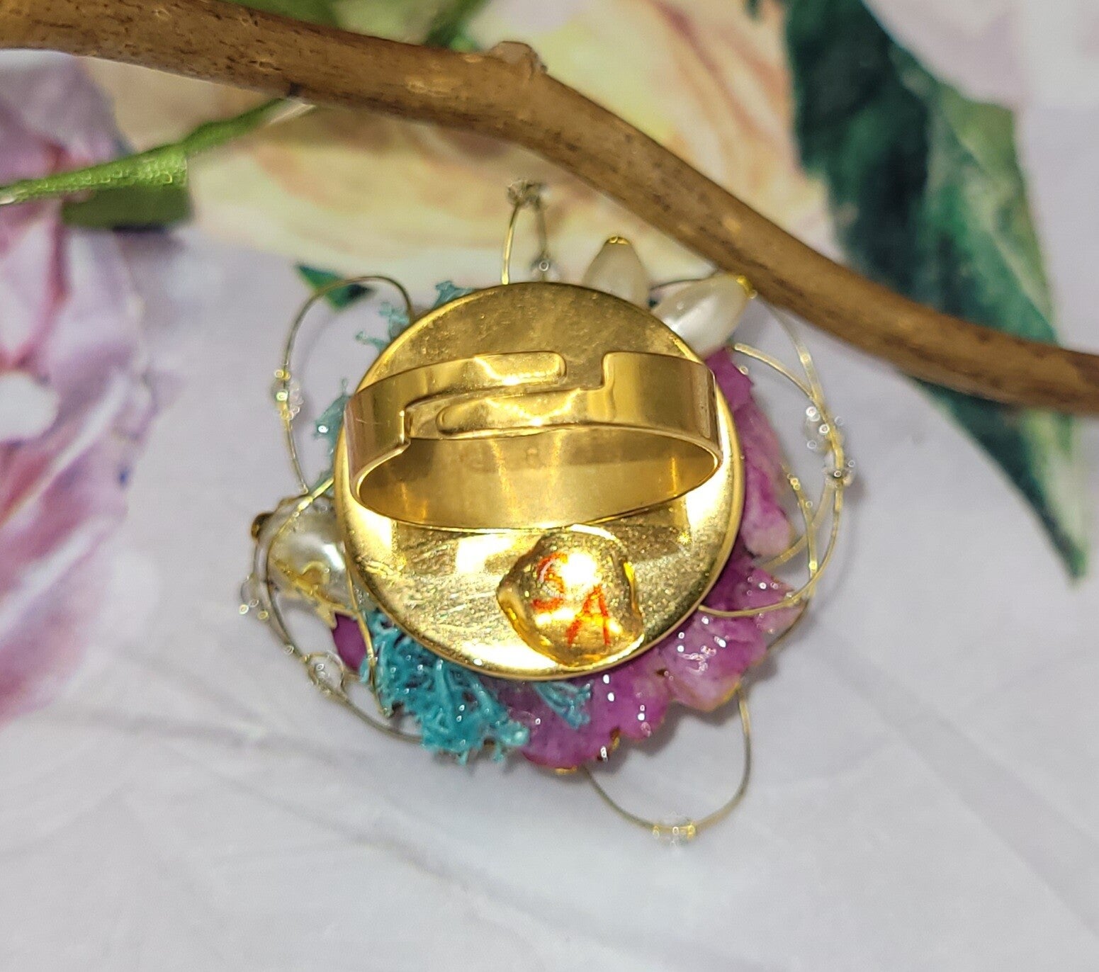 Le tout est scellé dans la résine et monté sur bague en acier inoxydable doré